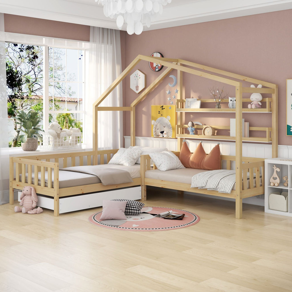 Children's House Bed with Drawers & Shelves, L-Shaped, Solid Wood