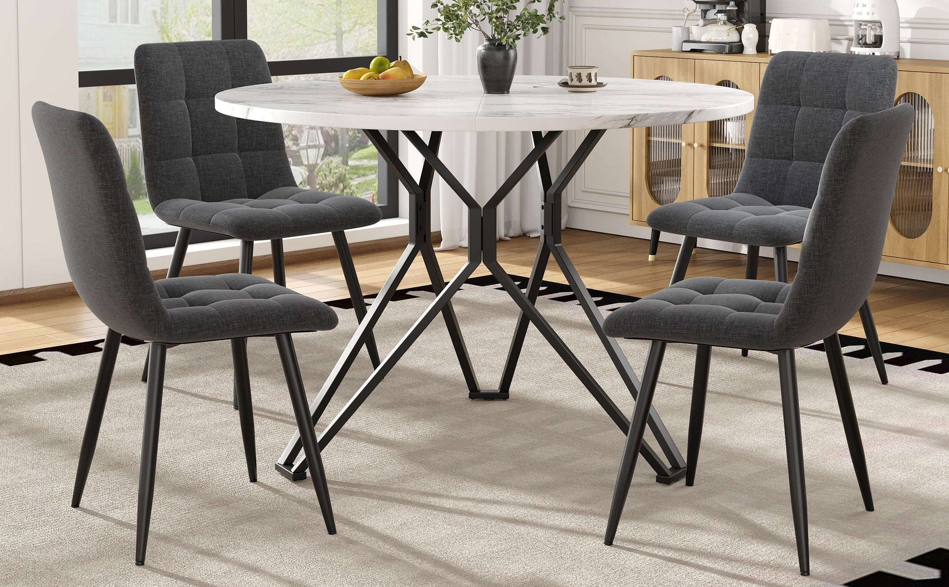 Dining Table Set 5-Piece 100cm Round MDF Marble Top Black Metal Legs Grey Linen
