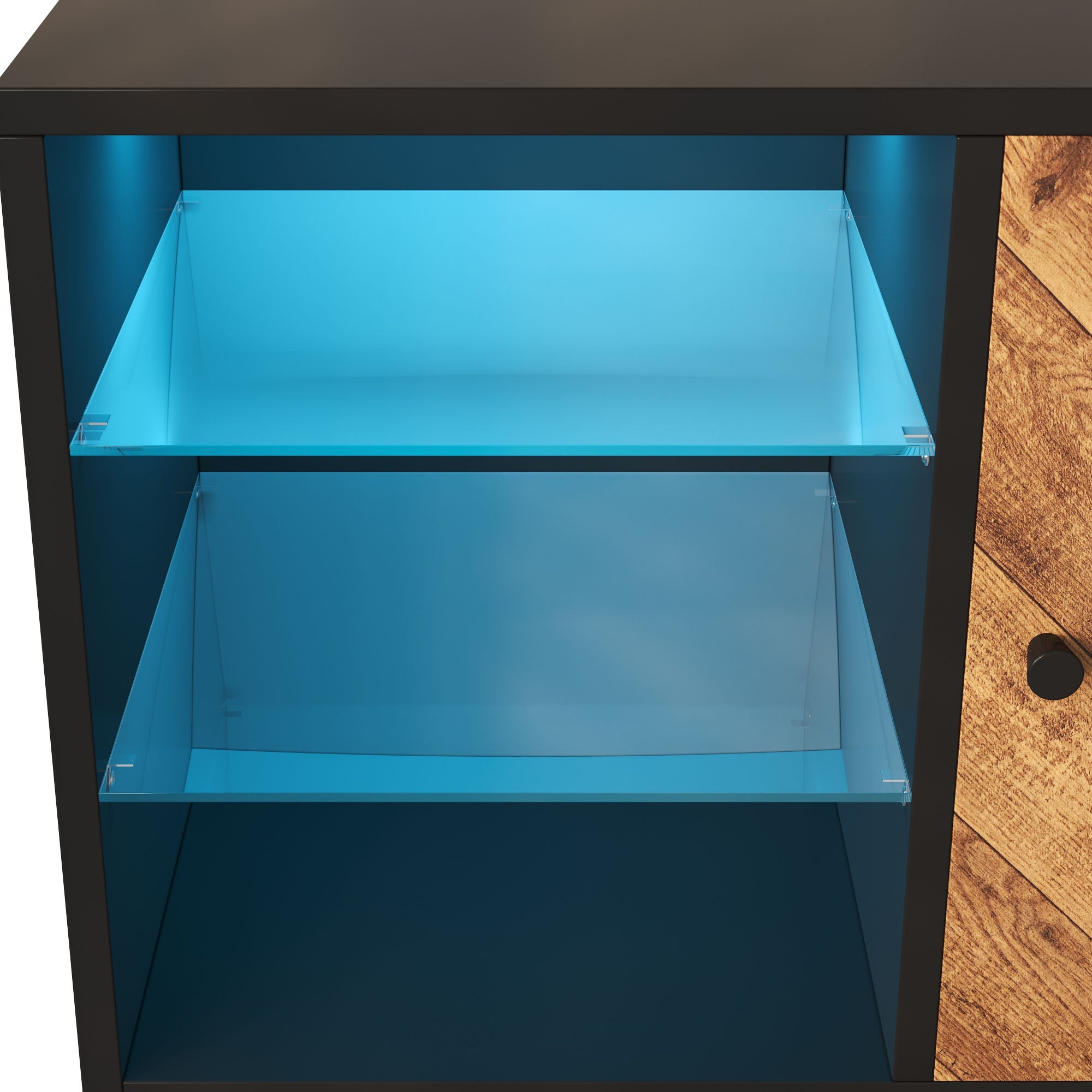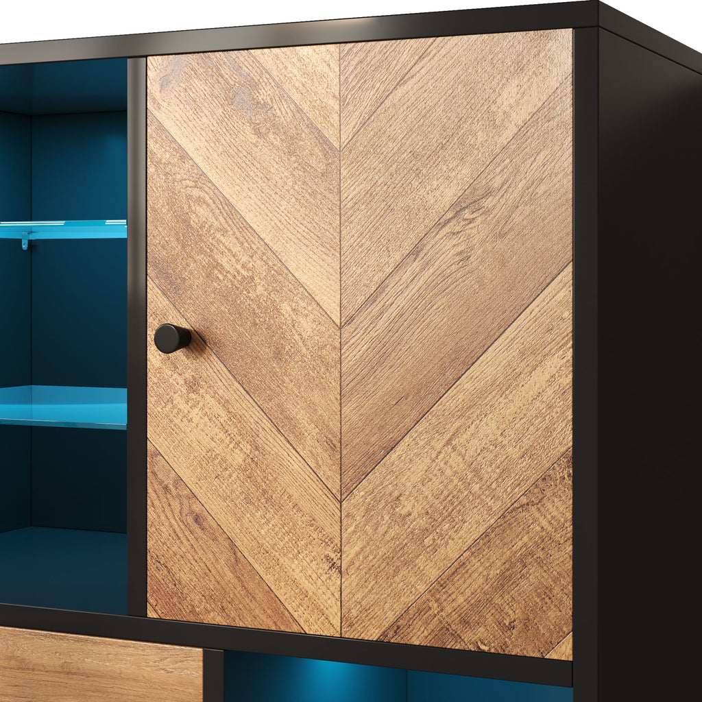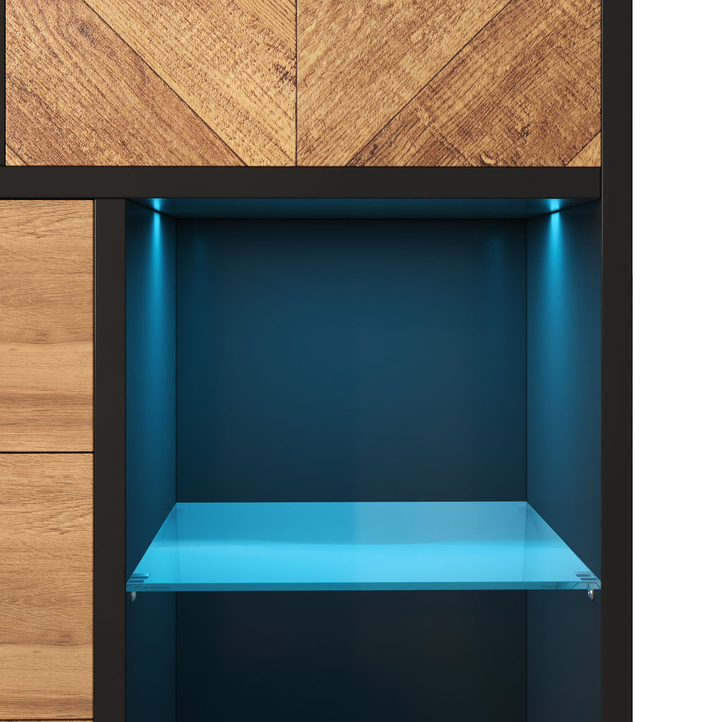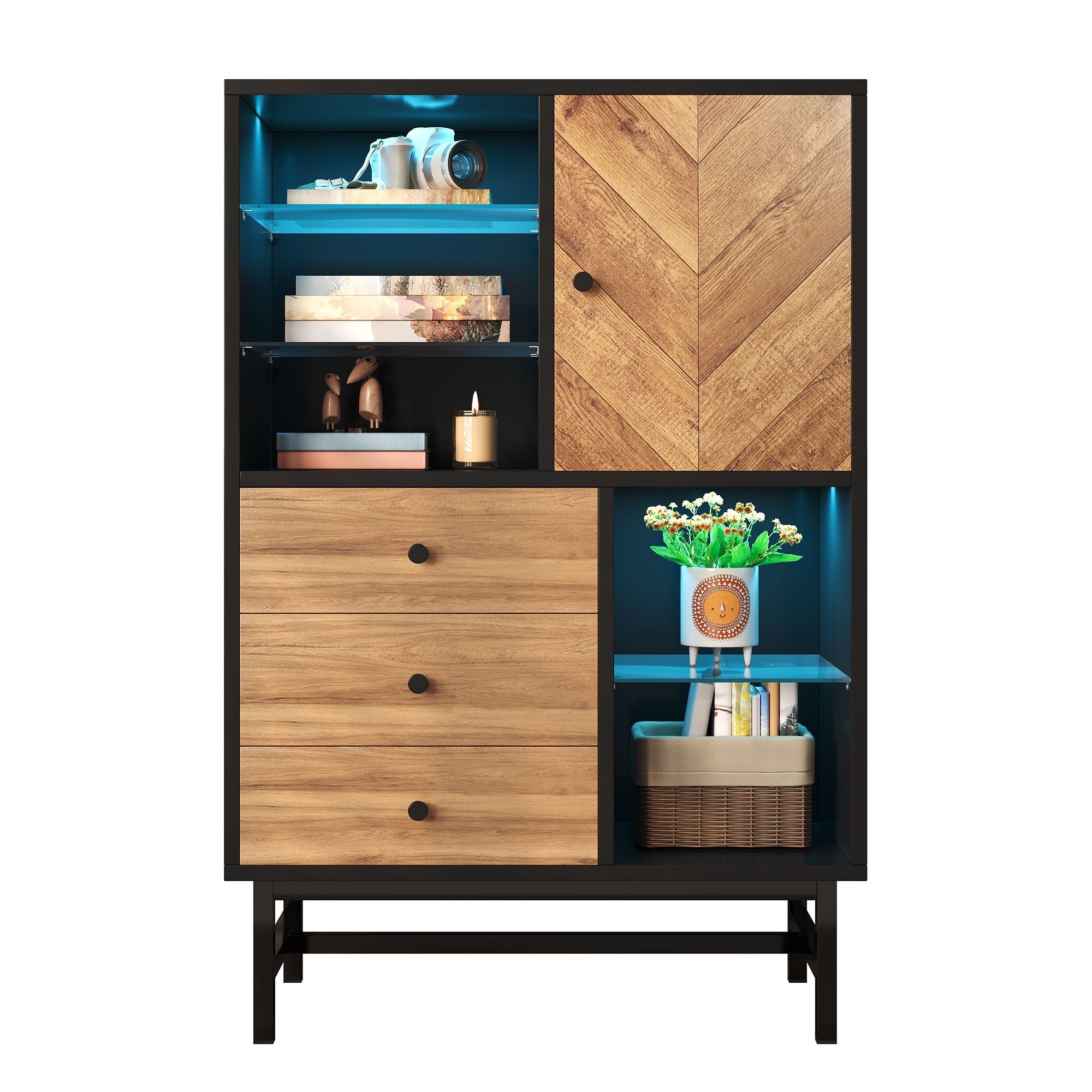Display Cabinet with 12-Color LED, Drawers, Glass Shelves, Triangular Wood Grain