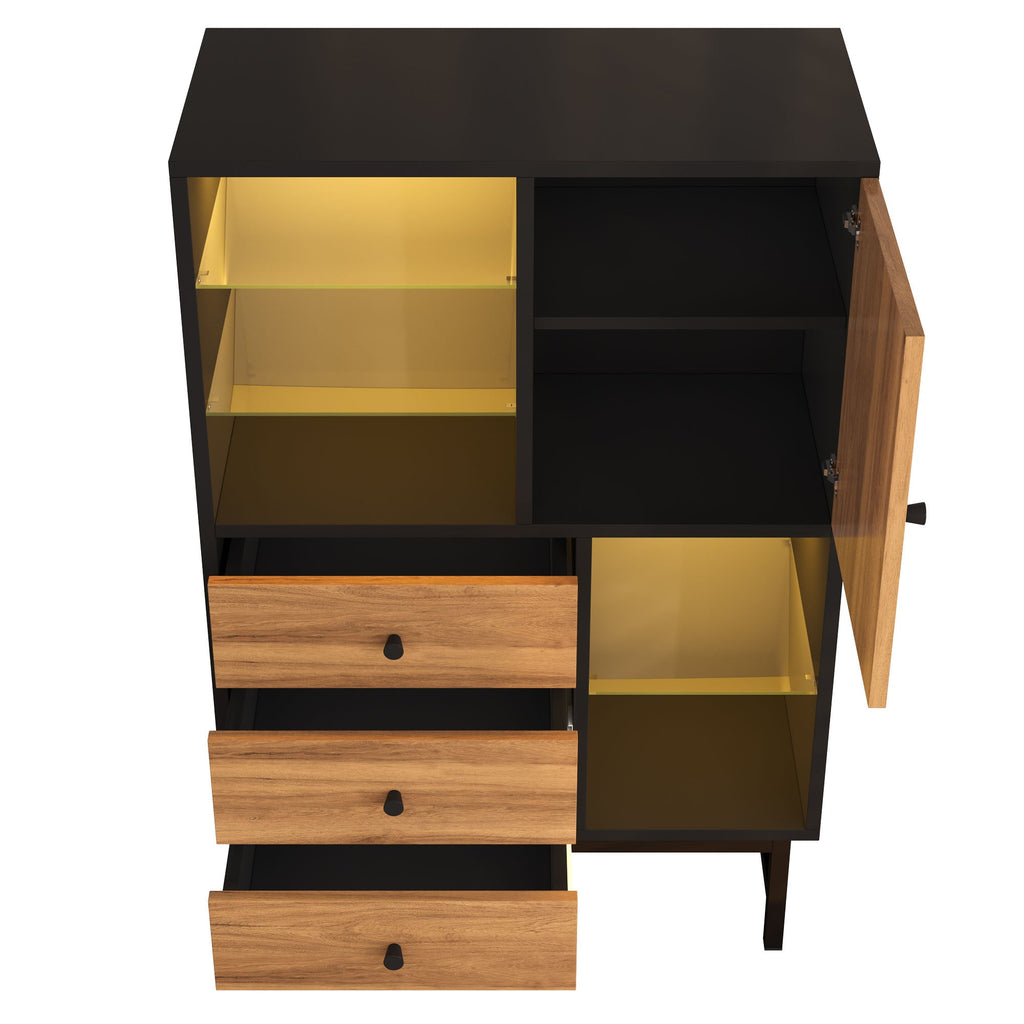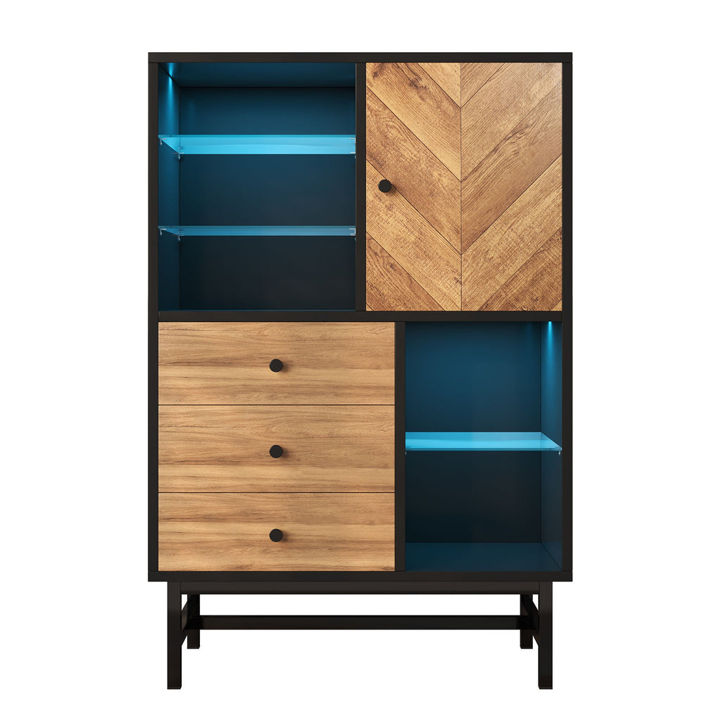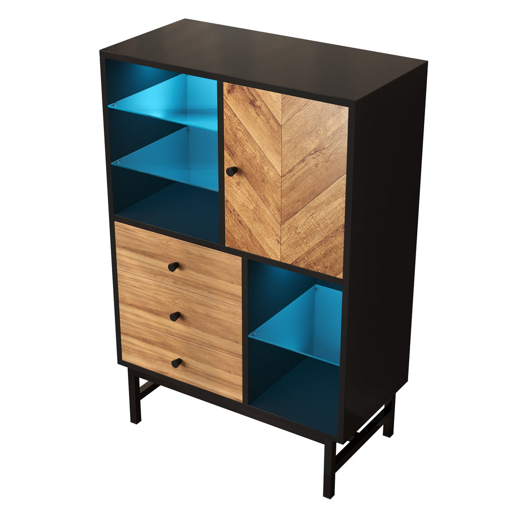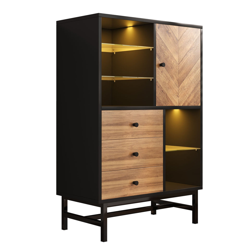 Display Cabinet with 12-Color LED, Drawers, Glass Shelves, Triangular Wood Grain
