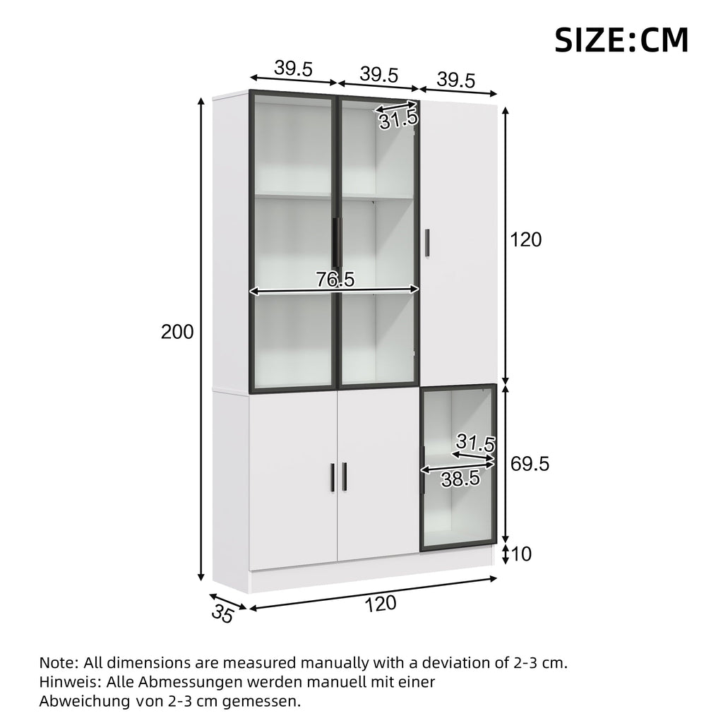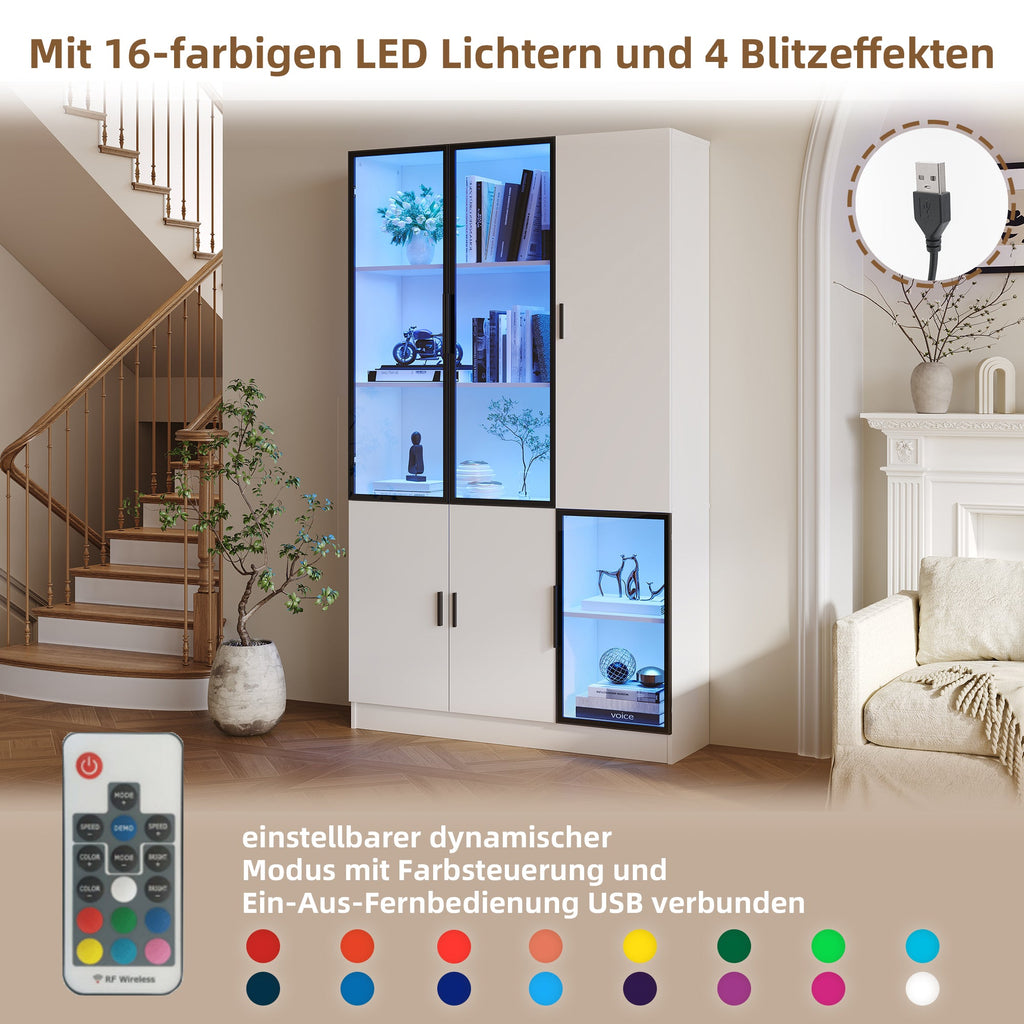 This versatile display cabinet, measuring 120 x 35 x 200 cm, features three glass doors with aluminum frames and four cabinets, offering ten storage areas. The top two cabinets have two transparent glass doors equipped with translucent LED lights, perfect for creating ambiance in any living room. The upper cabinet is divided into three levels, while the lower cabinet has one transparent door and is divided into two levels. The LEDs are controlled by a remote control. This display cabinet provides ample storage and can also function as a bookshelf or storage cabinet. It is made of particleboard and has a recommended total load capacity of 50 kg.
