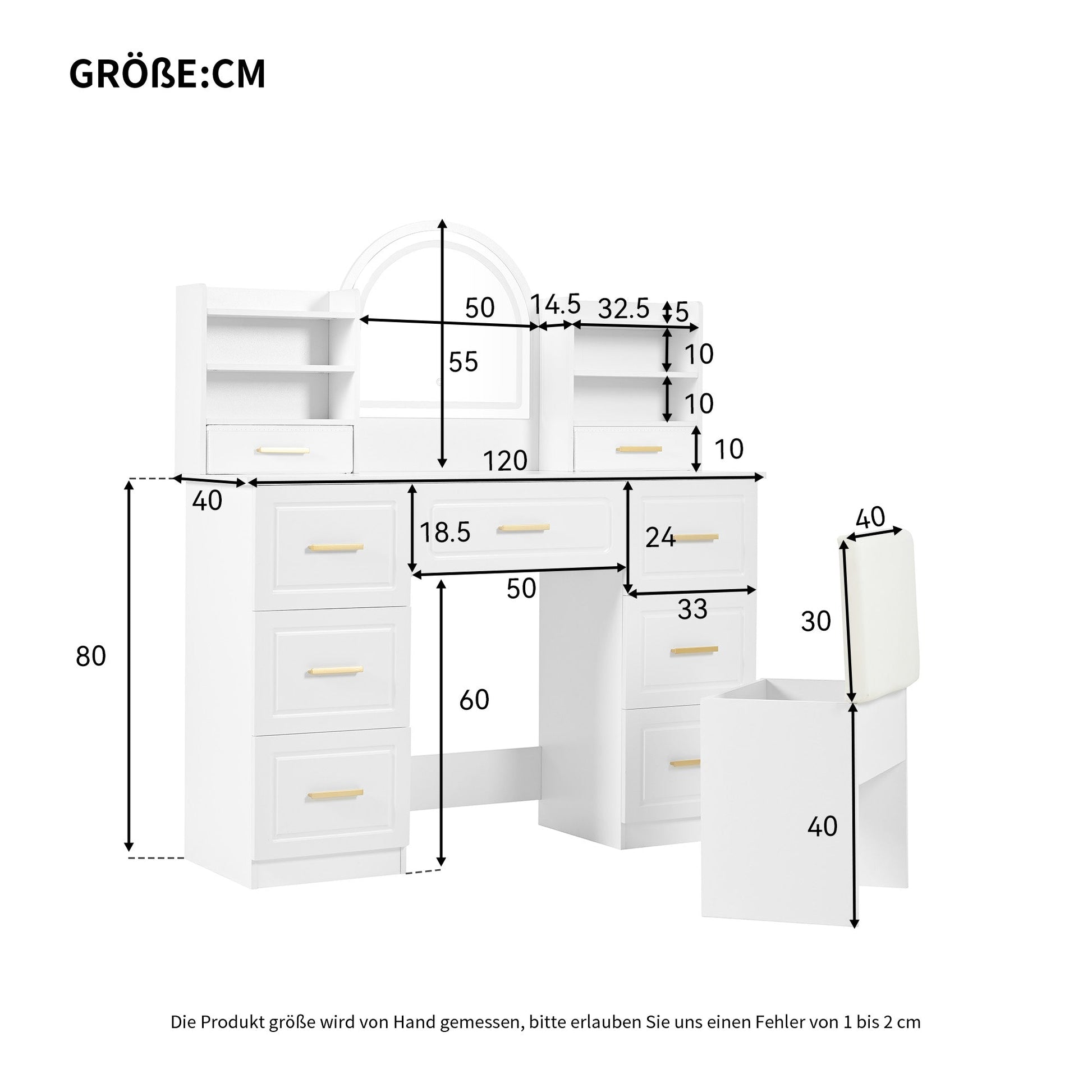 Equipped with open compartments, multiple drawers, and hidden side storage spaces, it flexibly meets various needs. The open compartments on the tabletop are perfect for frequently used cosmetics, the large drawers offer space for jewelry or important items, and the side shelf can be used for face masks or curling irons. This keeps your desk tidy and organized.