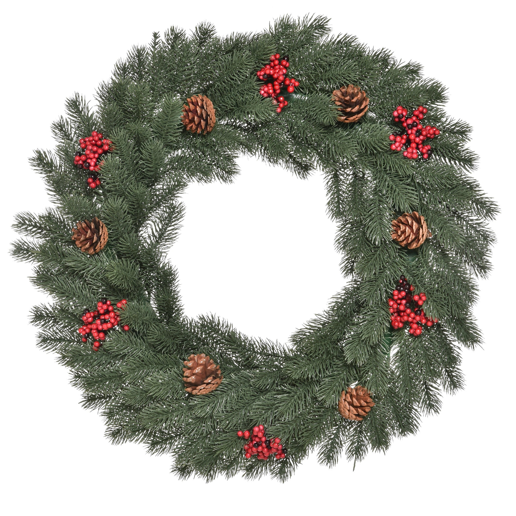 This Christmas door wreath is adorned with 6 pine cones and 6 red berries. It adds a natural look to your Christmas decor without all the hassle of a real wreath. The branch tips are sturdy and completely durable for years of use. After use, you can store this green wreath for effortless storage until next year.