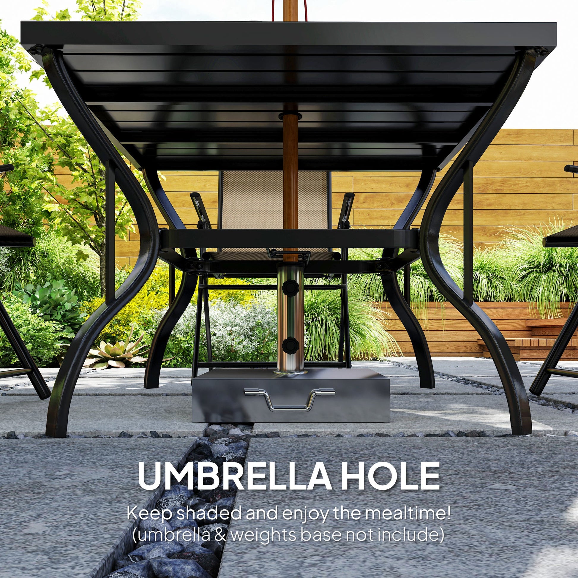 The table features a 50mm parasol hole in its 0.9mm metal top, designed to hold an umbrella with 38mm to 48mm poles. This allows you to add instant shade and remain protected while using the outdoor set.
