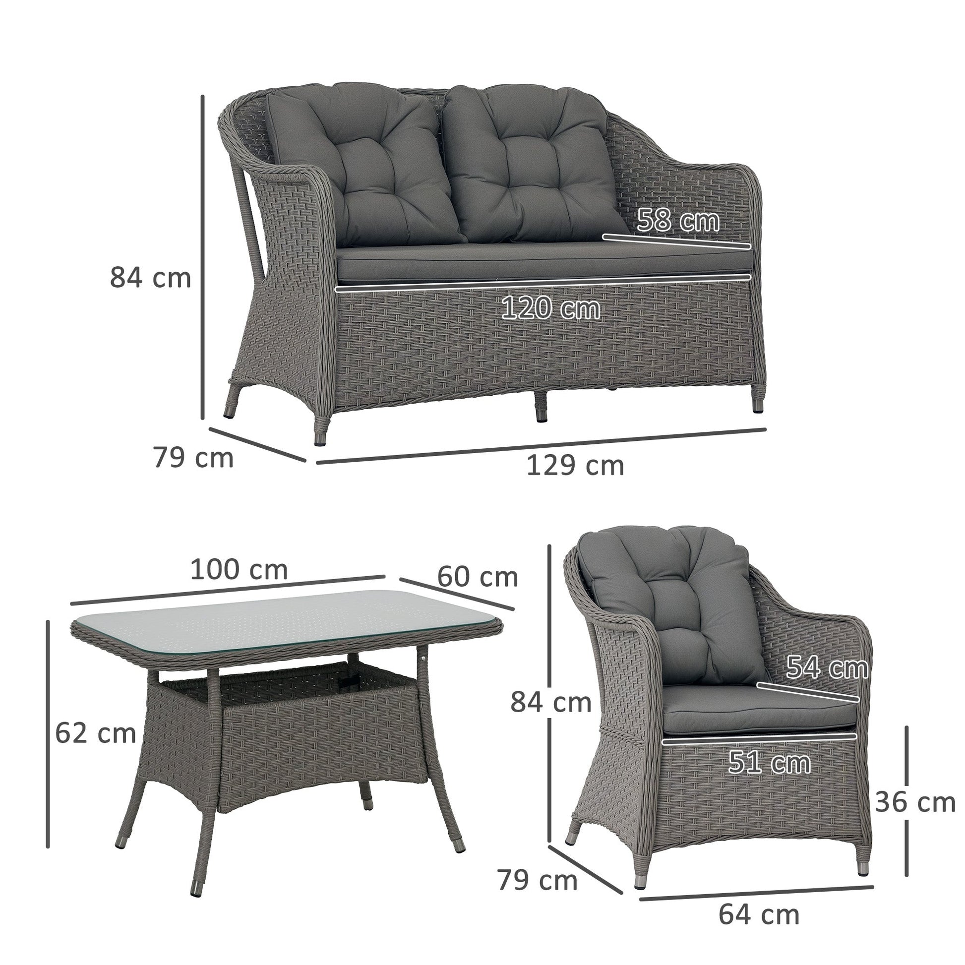 Dimensions: Loveseat: 84H x 129W x 79Dcm. Chair: 84H x 64W x 79Dcm. Table: 62H x 100L x 60Wcm. Maximum load capacity: Loveseat: 240kg. Chair: 120kg. Table: 50kg. Assembly is required.