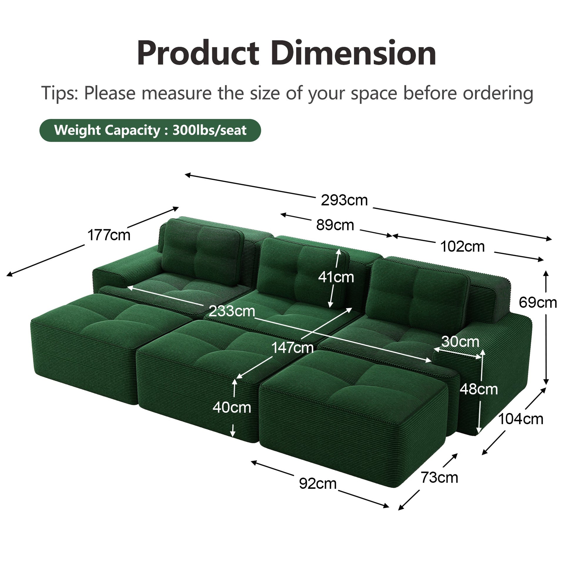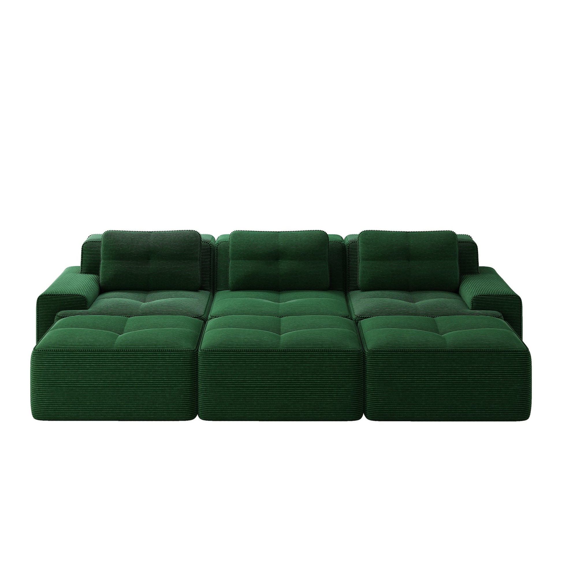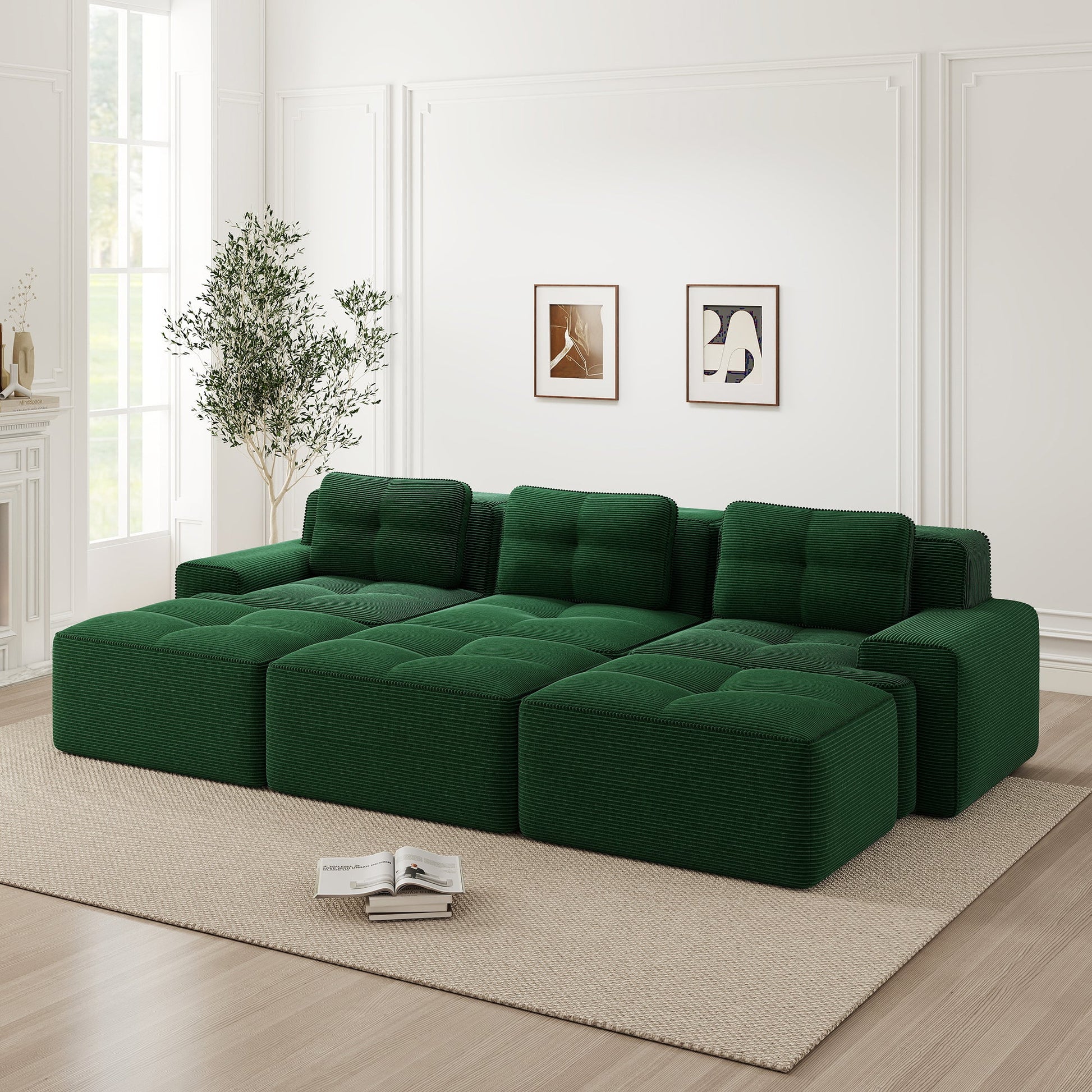 Frameless Modular Corner Sofa Sleeper with 3 Ottomans - Green Corduroy