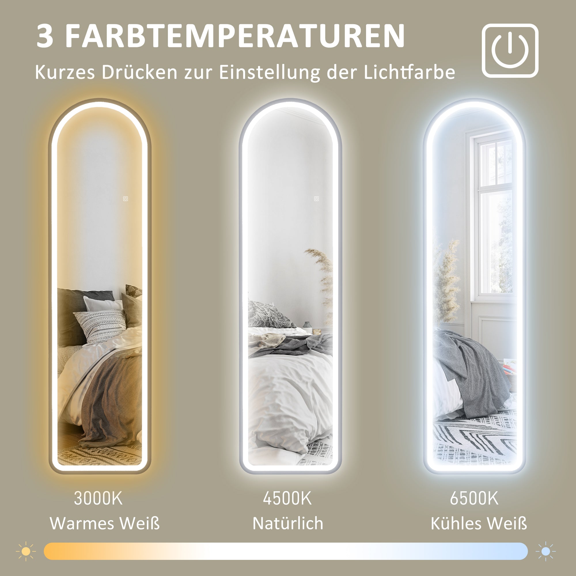Adjustable LED lights: This full-length mirror, measuring 150 cm long x 40 cm wide, features dimmable LED light strips in three color temperatures (warm white, natural white, and cool white) for optimal lighting while applying makeup or getting dressed.