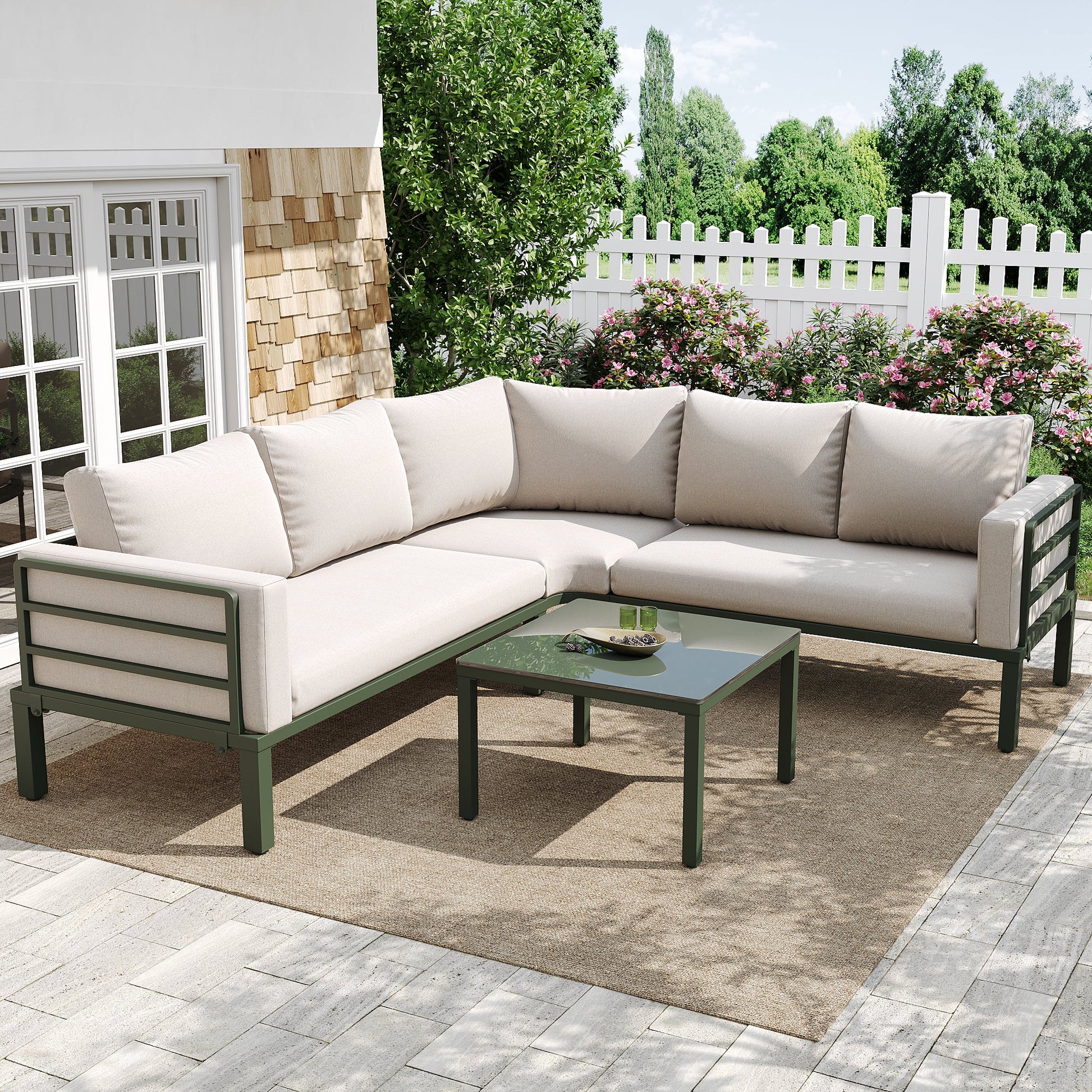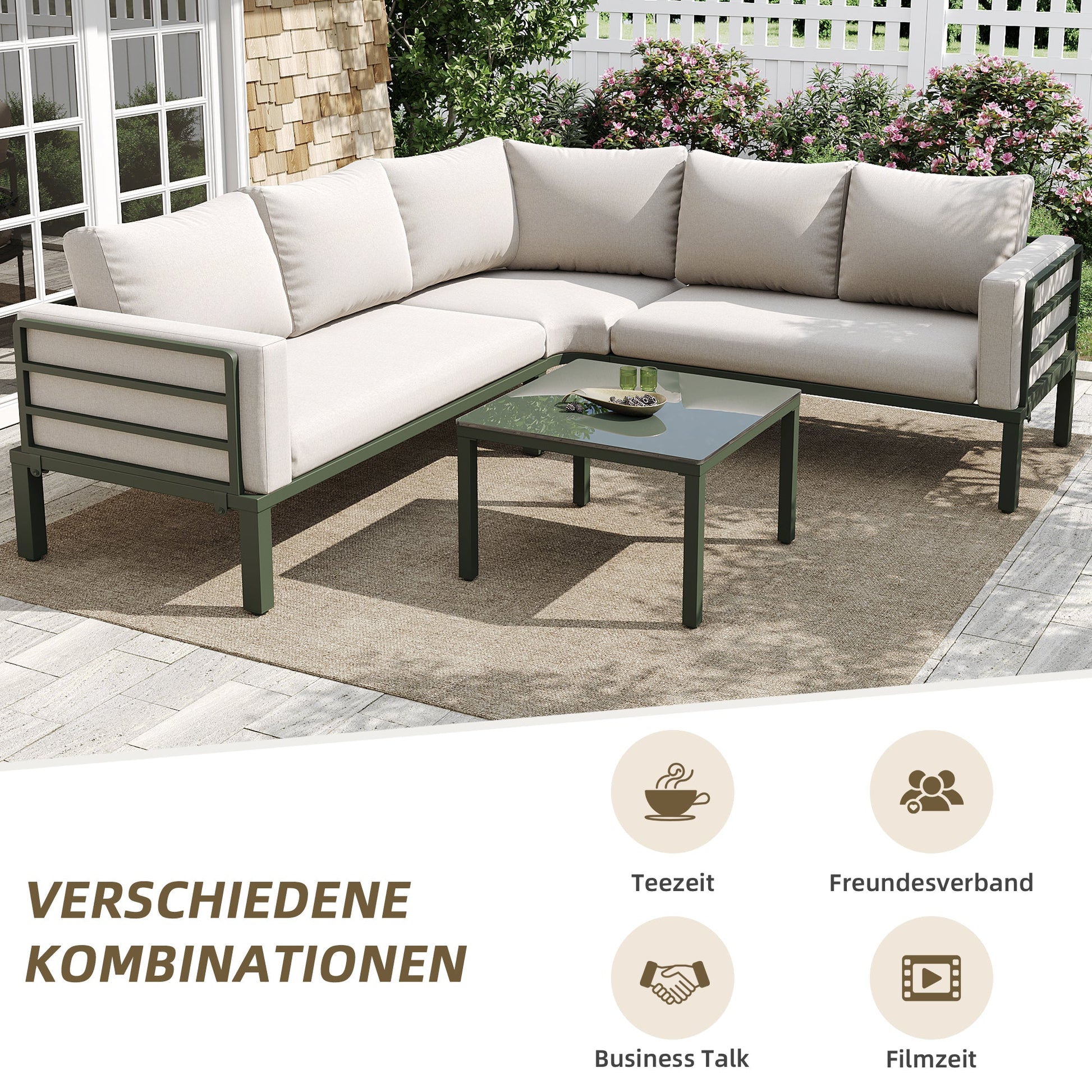 Garden Furniture Set 4-5 Seater with Tempered Glass Coffee Table Adjustable Legs - Green Iron/Beige Cushions