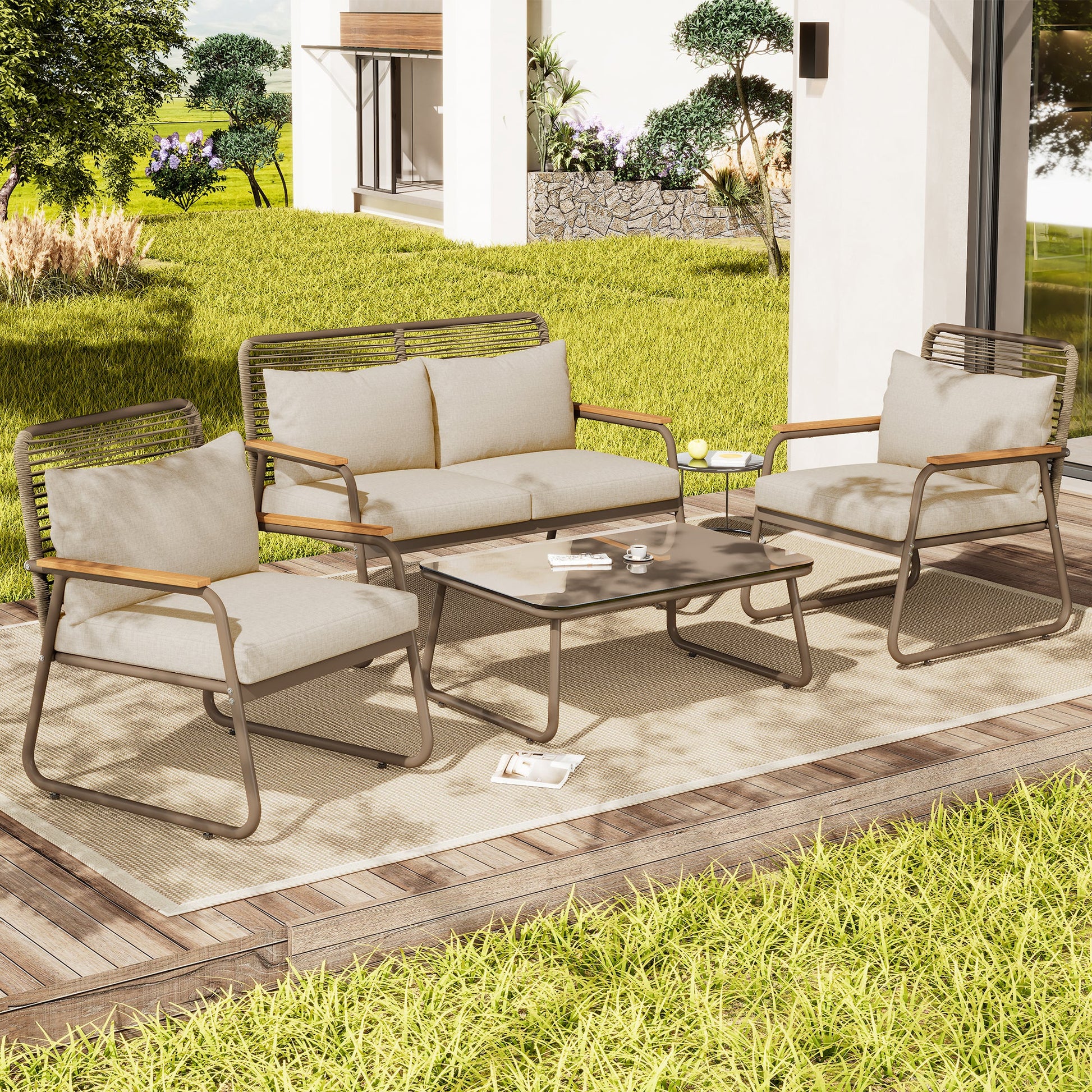 Garden Lounge Set 4 Person Sofa Table Adjustable Legs Tempered Glass - Beige
