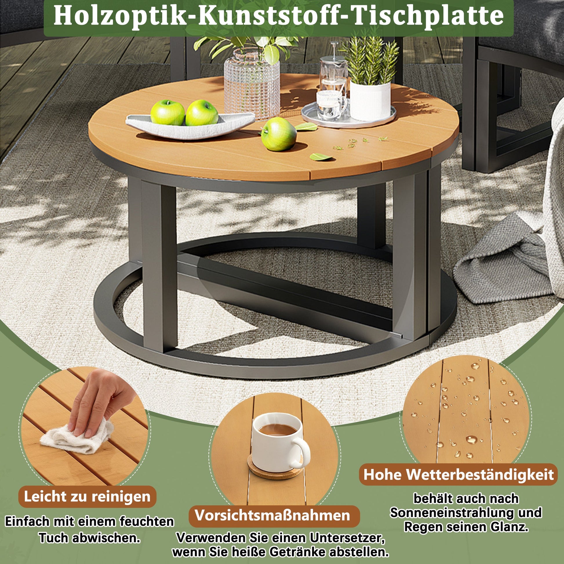 This outdoor sofa set offers various combination options for individual customization to patios, gardens, or balconies. From a compact seating group to a spacious lounge area, everything is possible with a cohesive and attractive design. Thanks to its weatherproof frame, splash-proof surface, and removable cushions, the set maintains its pristine appearance even with frequent use. It is equally suitable for everyday relaxation outdoors and for entertaining guests, making it the ideal centerpiece for your outdoor living space.