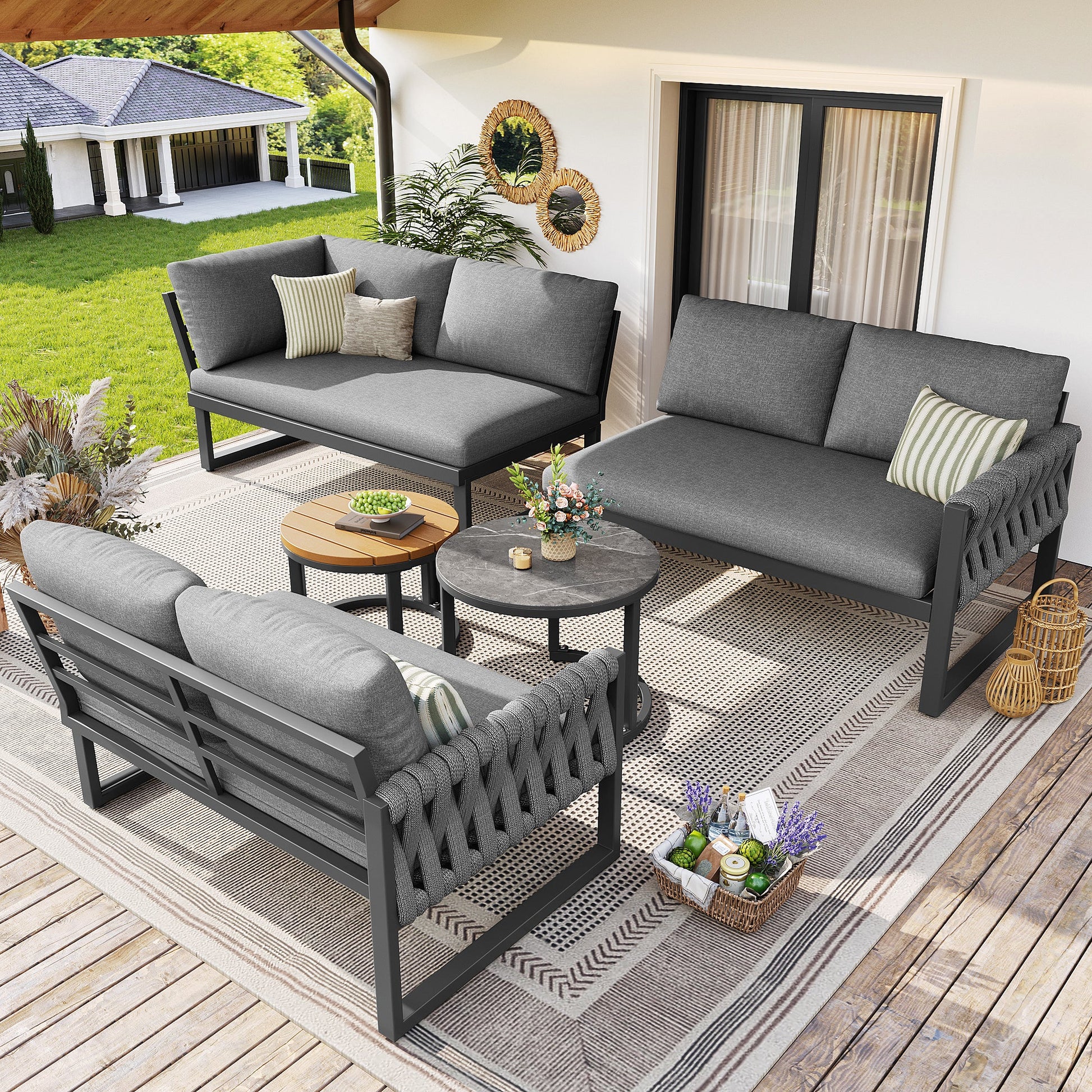 This outdoor sofa set redefines outdoor living with its exceptional flexibility and practicality. Designed for the diverse needs of modern homes, its fully modular construction allows for effortless configurations such as L-shapes, U-shapes, or individual seating groups. This makes it a perfect fit for various spaces like balconies, gardens, or patios, providing the right arrangement for family gatherings, social evenings, or quiet relaxation. The sturdy metal frame and the three-dimensionally woven armrests ensure safety and durability during continuous use.