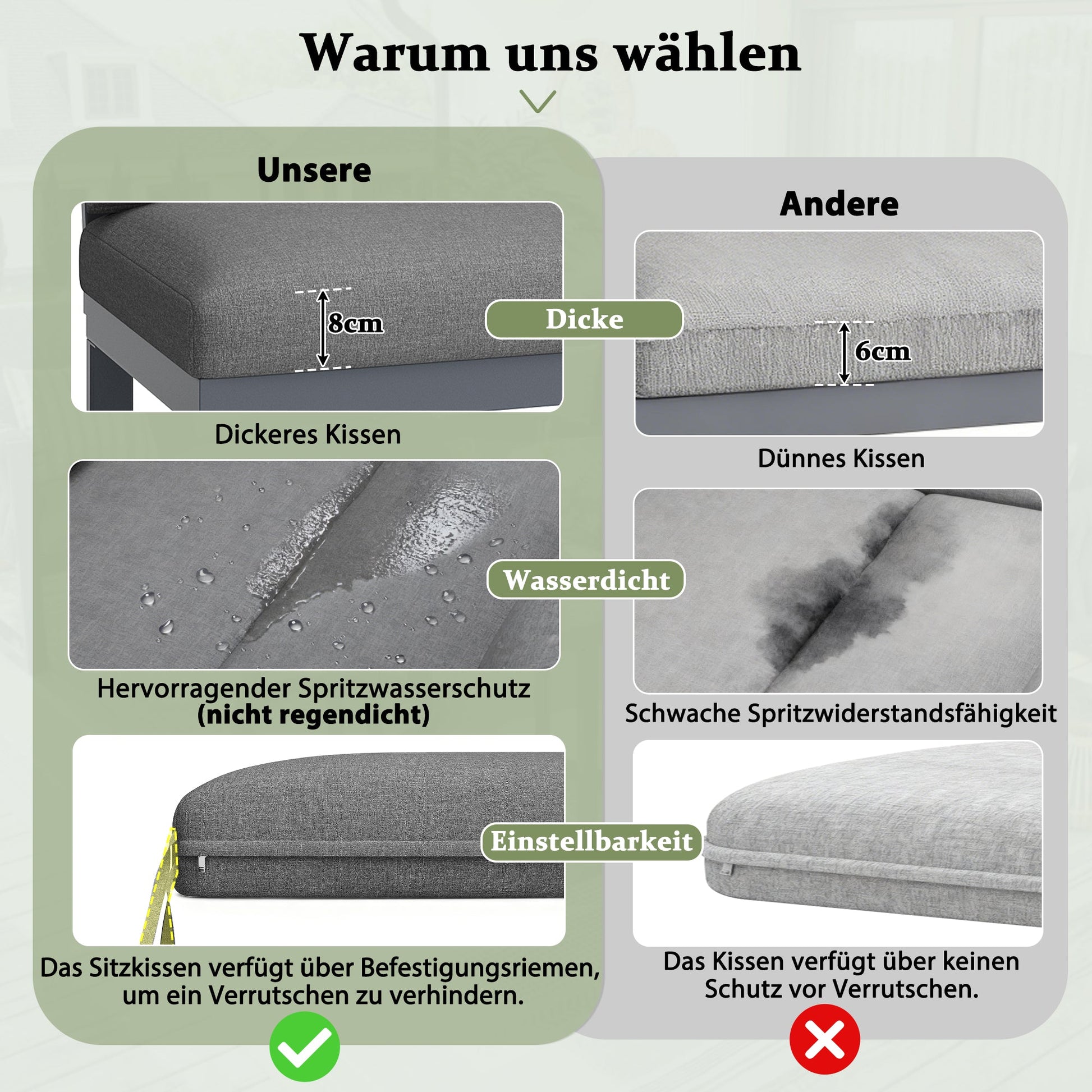 The 8 cm thick seat cushions not only offer exceptional comfort and support but are also water-repellent and highly splash-proof, making them ideal for changeable weather. For ultimate convenience and practicality, all seat and back cushion covers are easily removable and machine washable, keeping the sofa looking new with minimal effort.