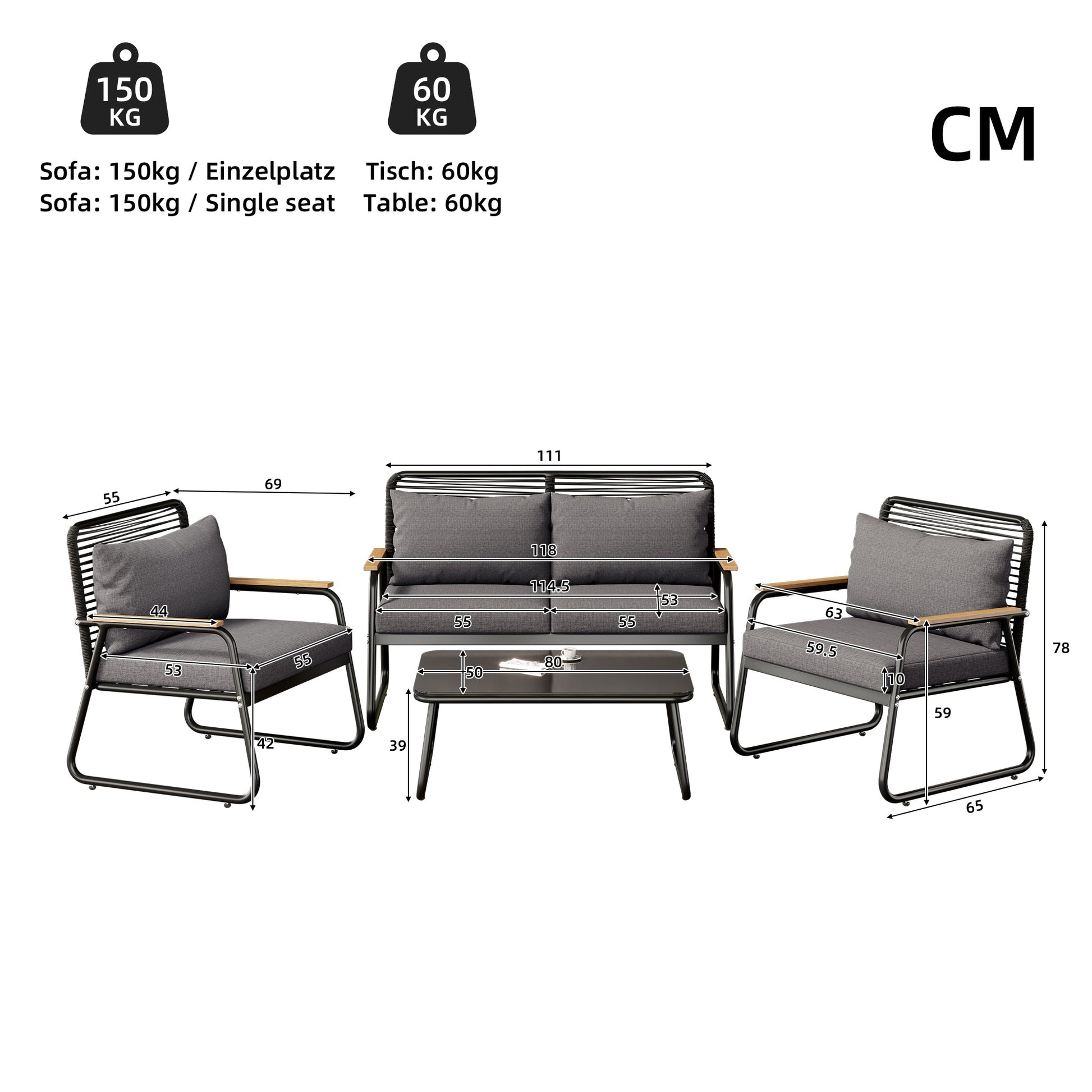 This outdoor lounge sofa set consists of a multi-person sofa (1), a single sofa (2), and a coffee table (1). It features large seat cushions and pillows that are very soft and comfortable. The cushion covers are removable and can be machine washed or hand-washed to keep the cushions looking clean and tidy. High-quality sponge filling conforms precisely to the body's curves, evenly distributing pressure. Sitting and lying down completely relieves fatigue, providing a soft and supportive comfort experience. The high elasticity prevents deformation and collapse even after prolonged use, maintaining the sofa's good looks and feel, and extending its lifespan.