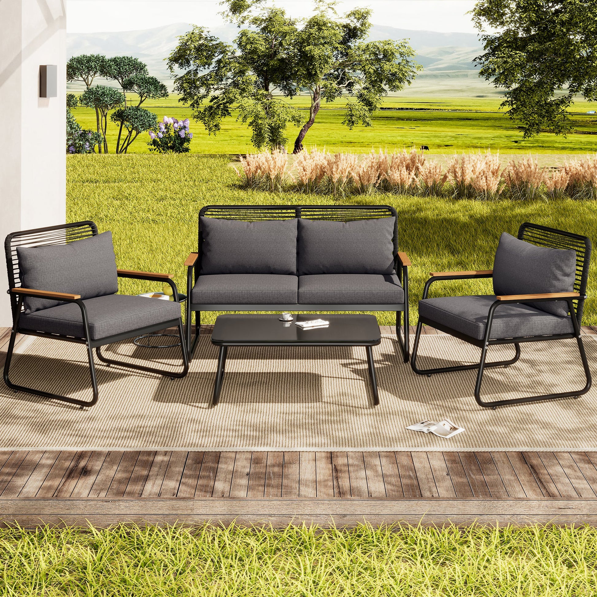 The thick cushions ensure you can relax or dine in complete comfort. The sturdy frame is attractive and durable, ensuring years of enjoyment. This set adds a modern touch to your patio or garden and gives your outdoor space a natural feel.