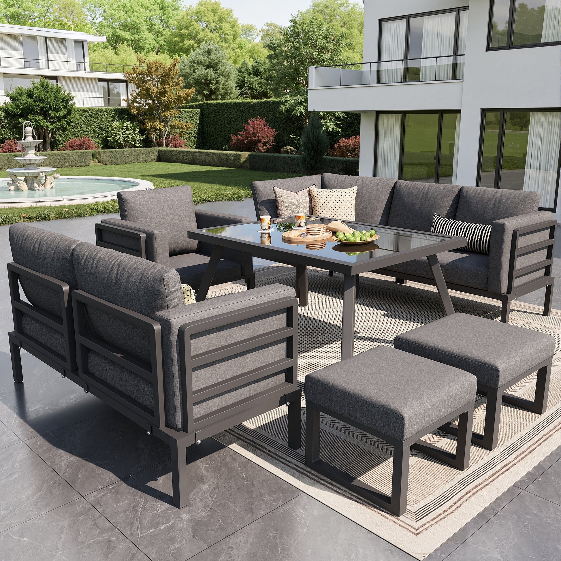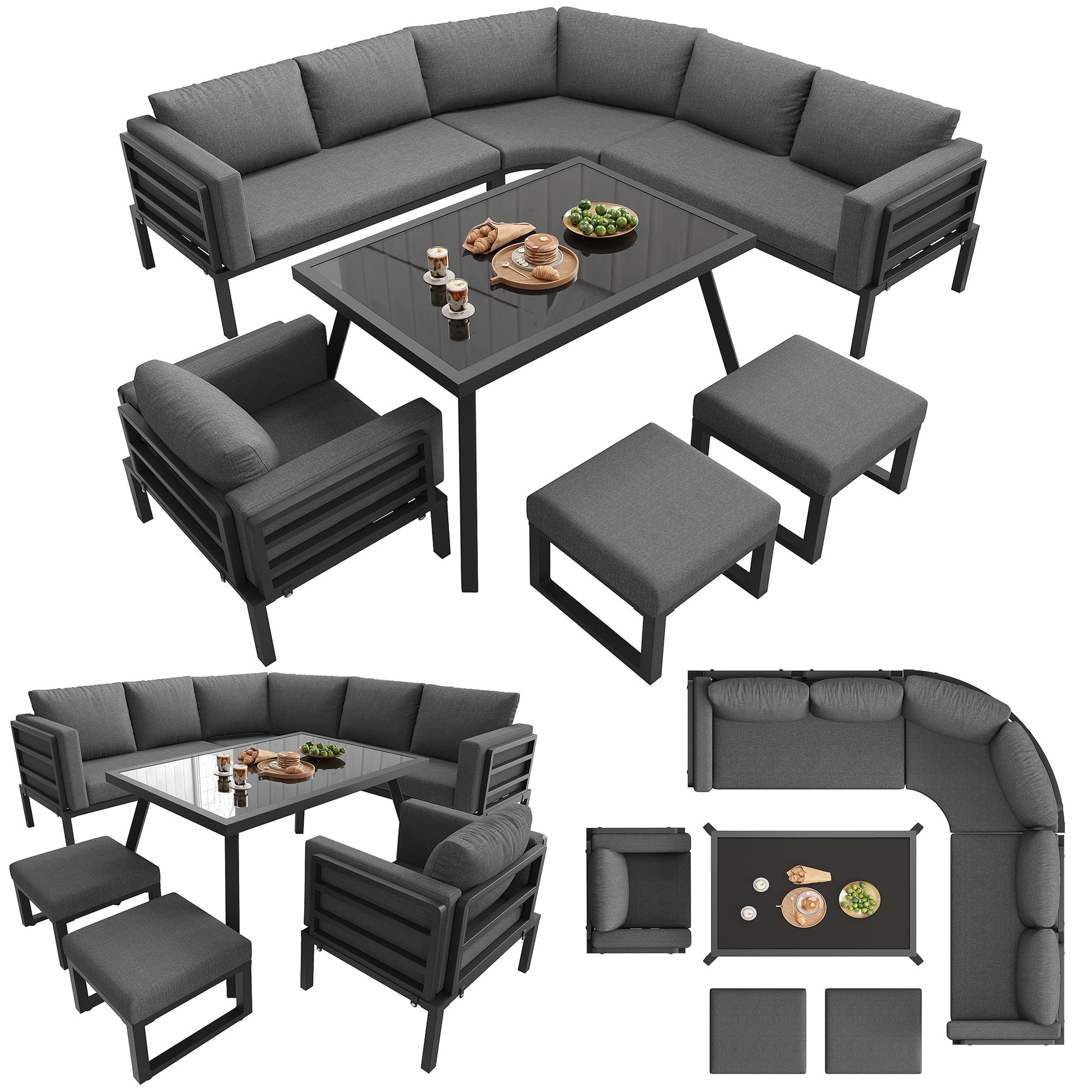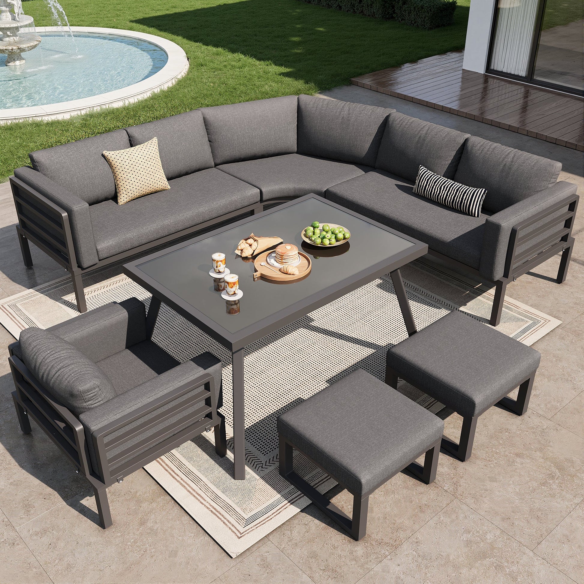 Garden Sofa Set Crescent 8-Person with Glass Table Weatherproof - Grey Cushions