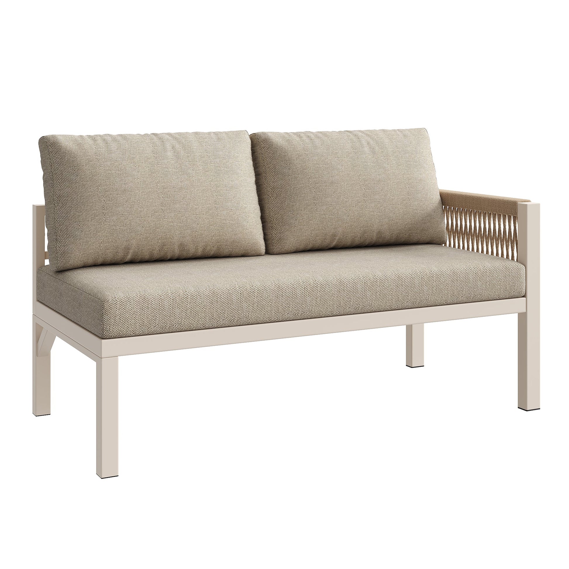 This modular set is specifically designed for outdoor use, offering flexible seating for various group sizes. The three two-seater sofas with single armrests can be combined to create a comfortable L-shape. The cushion and seat covers are removable, washable, and made from a splash-proof fabric that effectively repels stains. For added convenience, the seat cushions are equipped with practical fastening straps to prevent slipping.