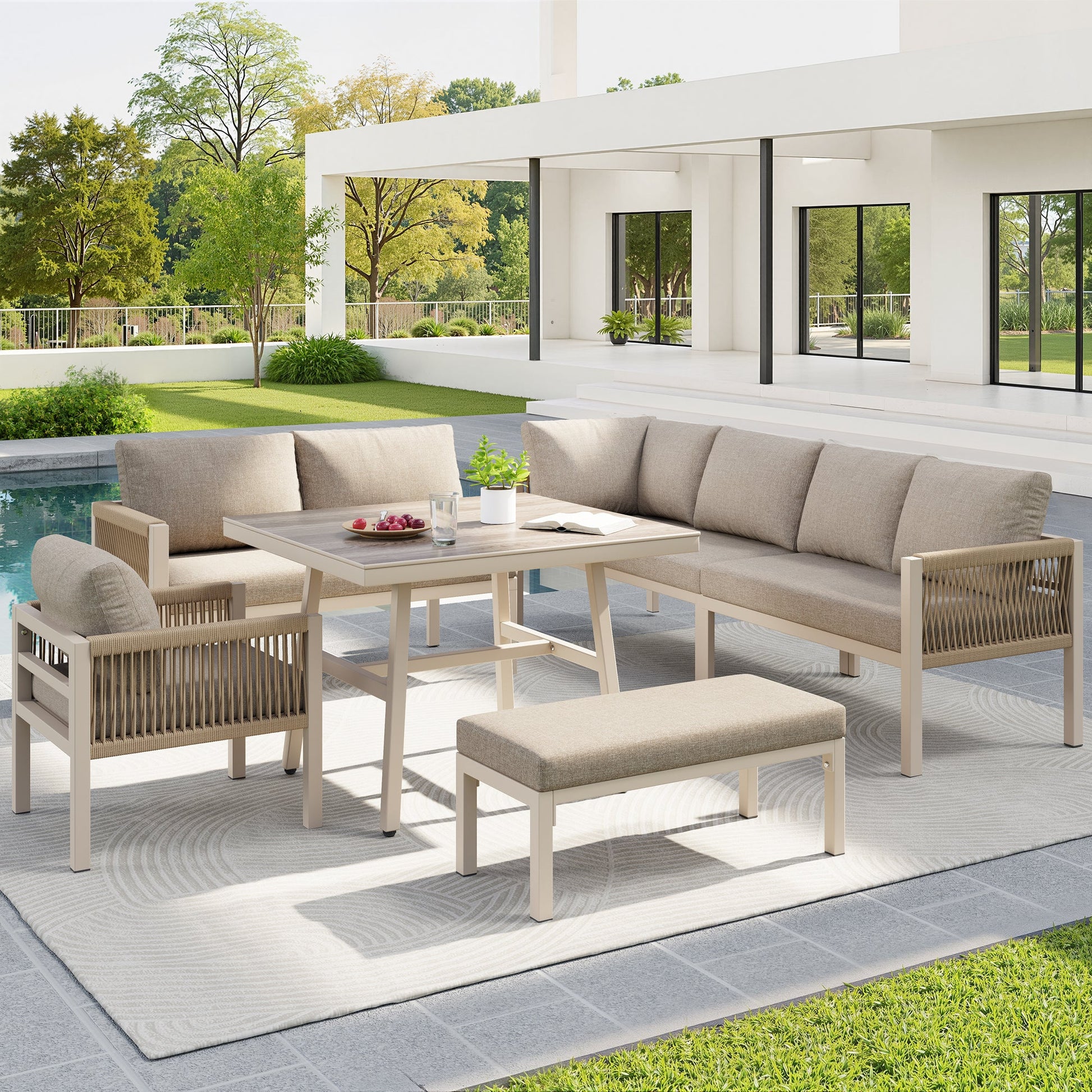 Garden Sofa Set L-Shape 8-Seater Hand-Woven with Table & Armchair - Iron Frame Beige