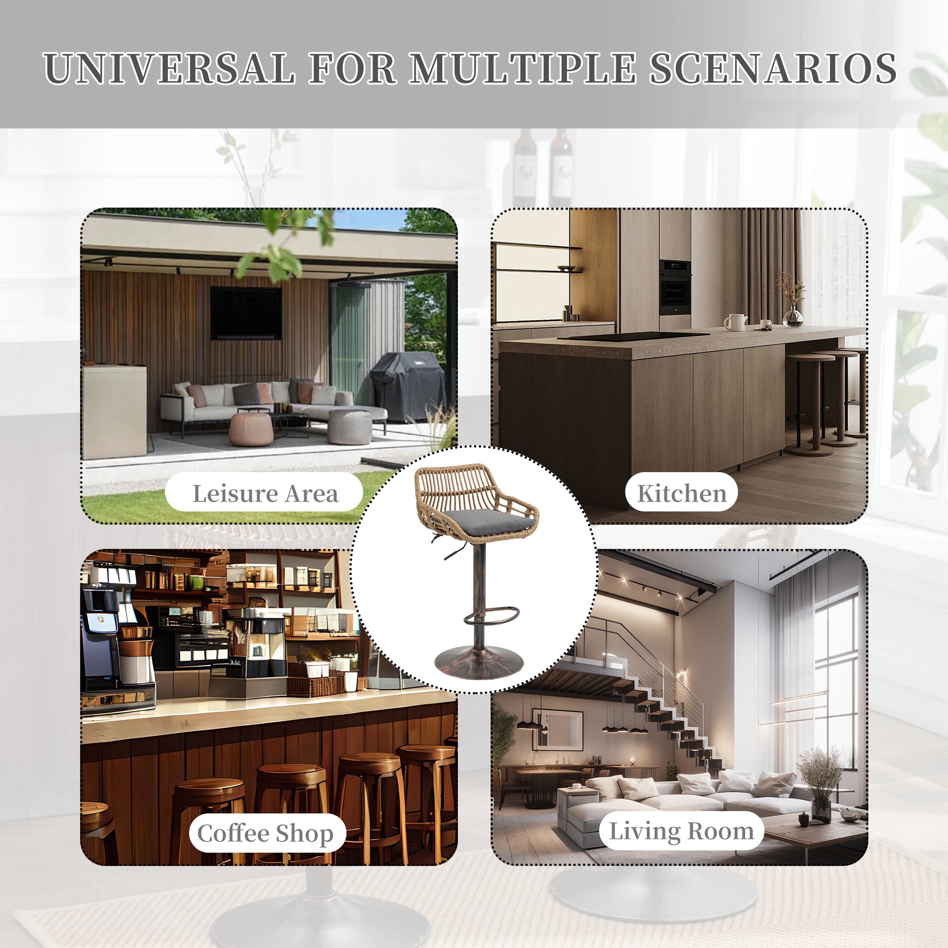 Suitable for indoor and outdoor use, this bar chair features a metal disc base and a woven backrest, allowing the chair to rotate 360° and the pole to be adjusted up and down.