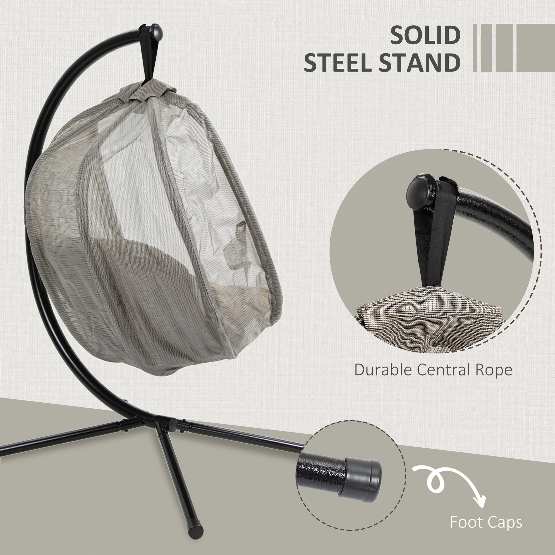 STEEL FRAME: Strong core, with top hook to support the sitting basket fully. Three long legs of the egg chairs for garden keep it evenly balanced.