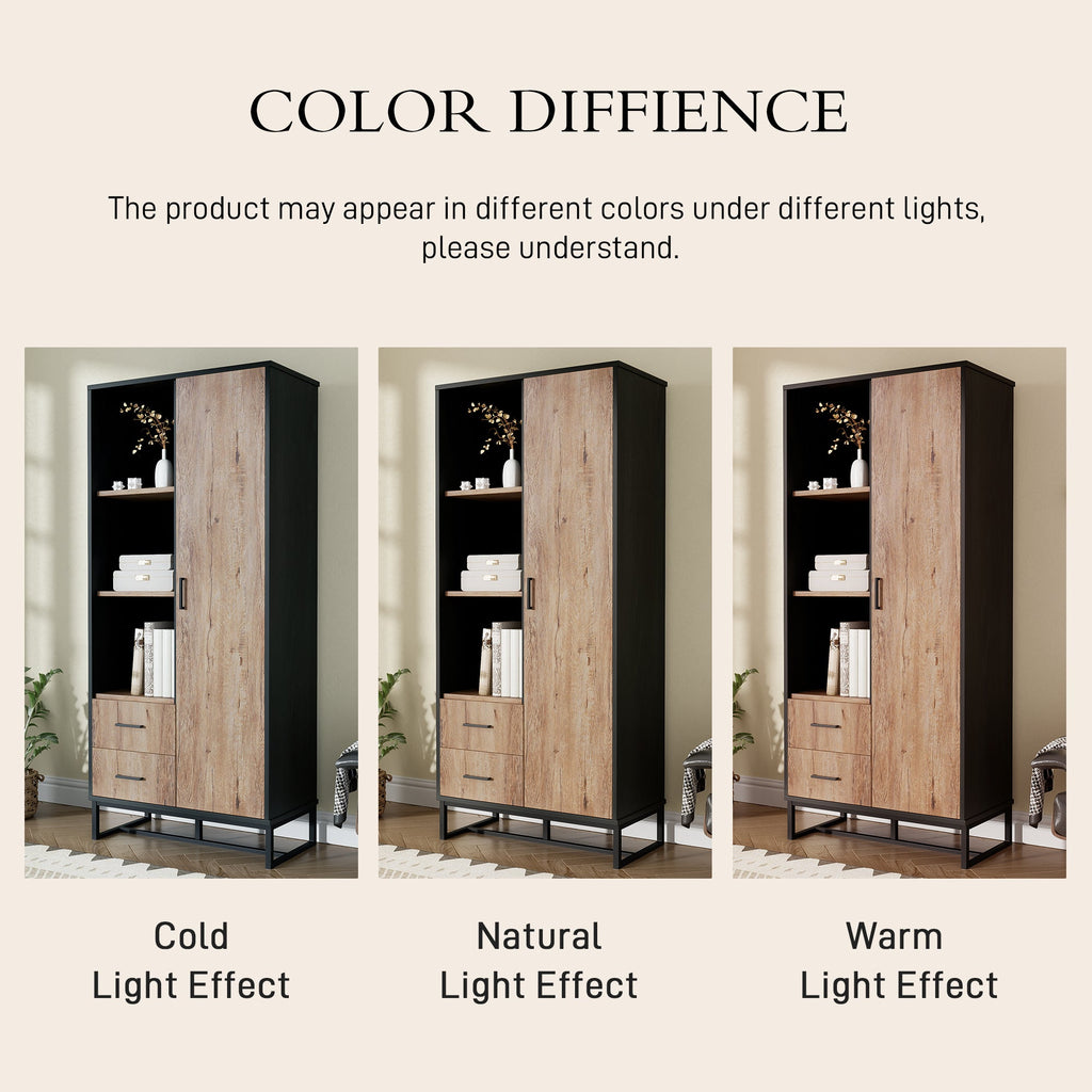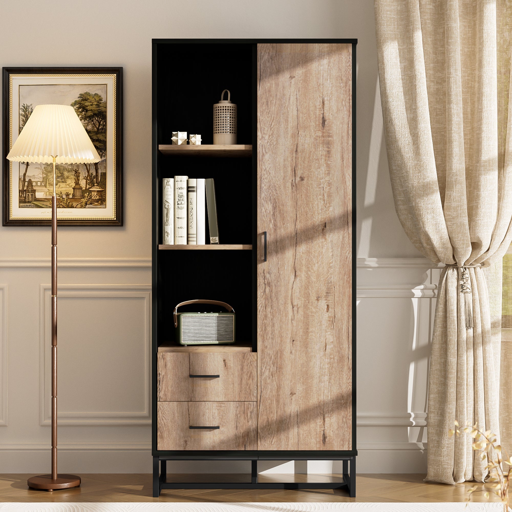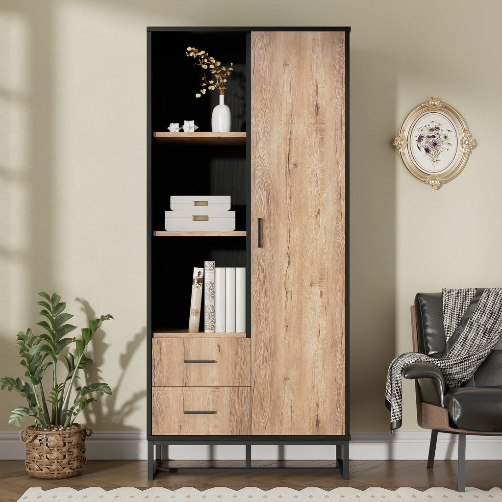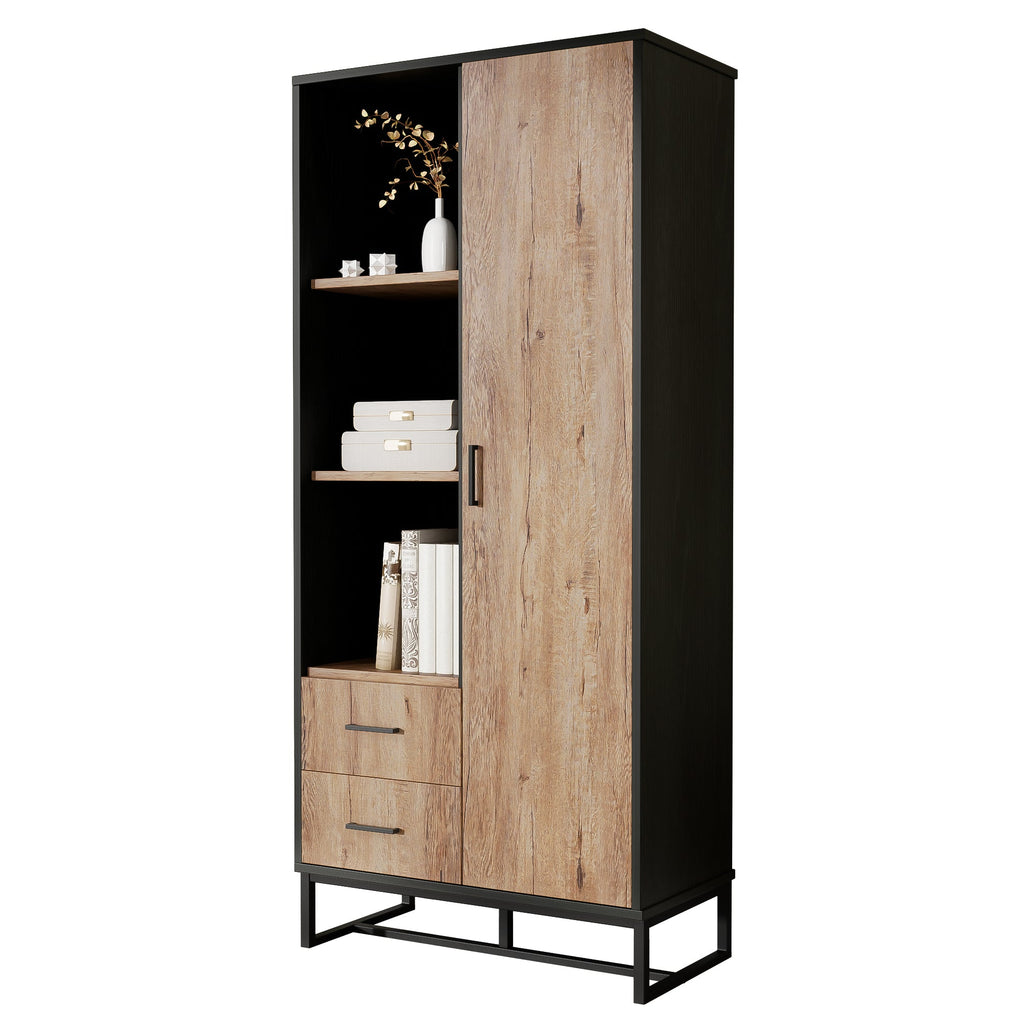 Highboard Cabinet with Door, 2 Drawers & 3 Open Compartments, Wood Look & Black Frame