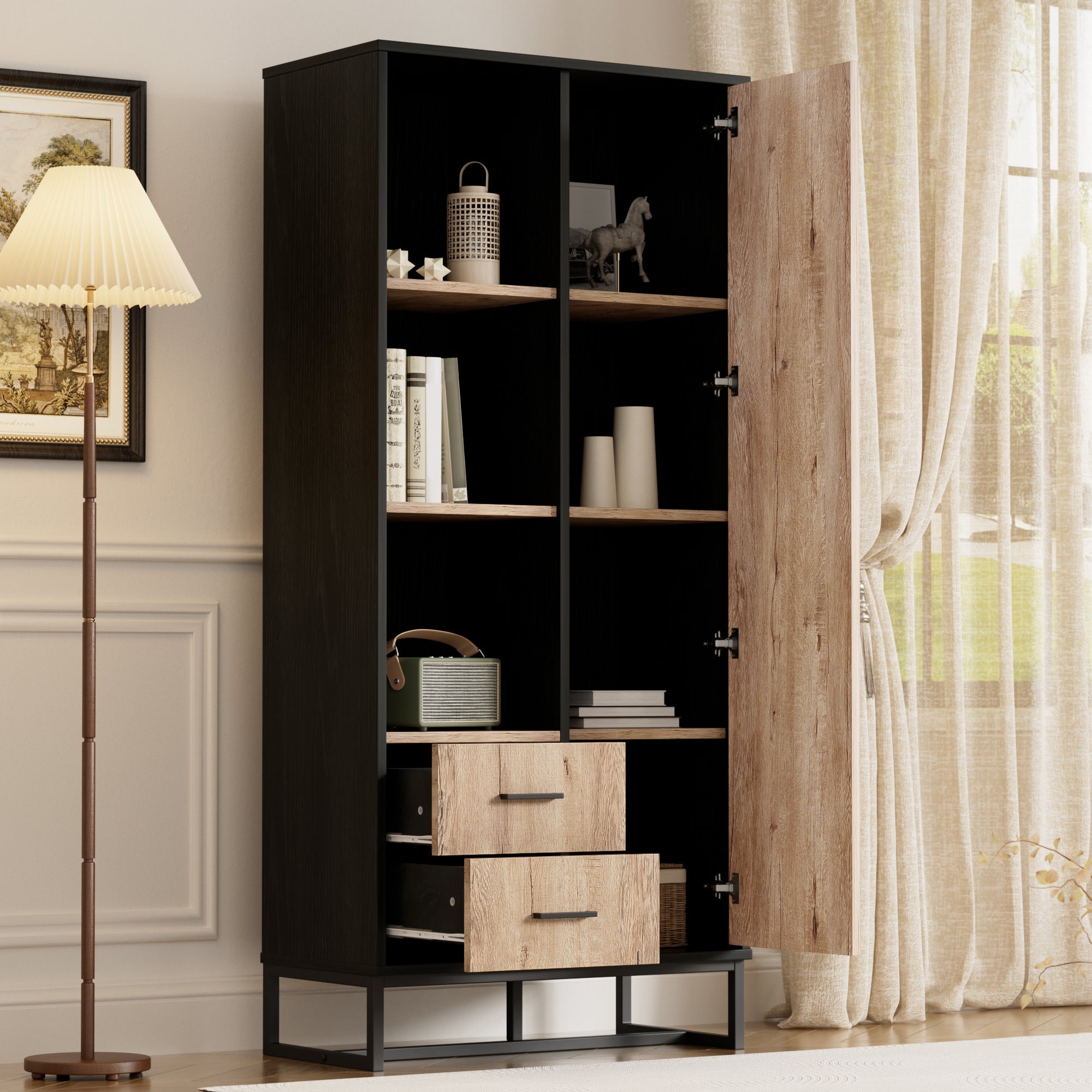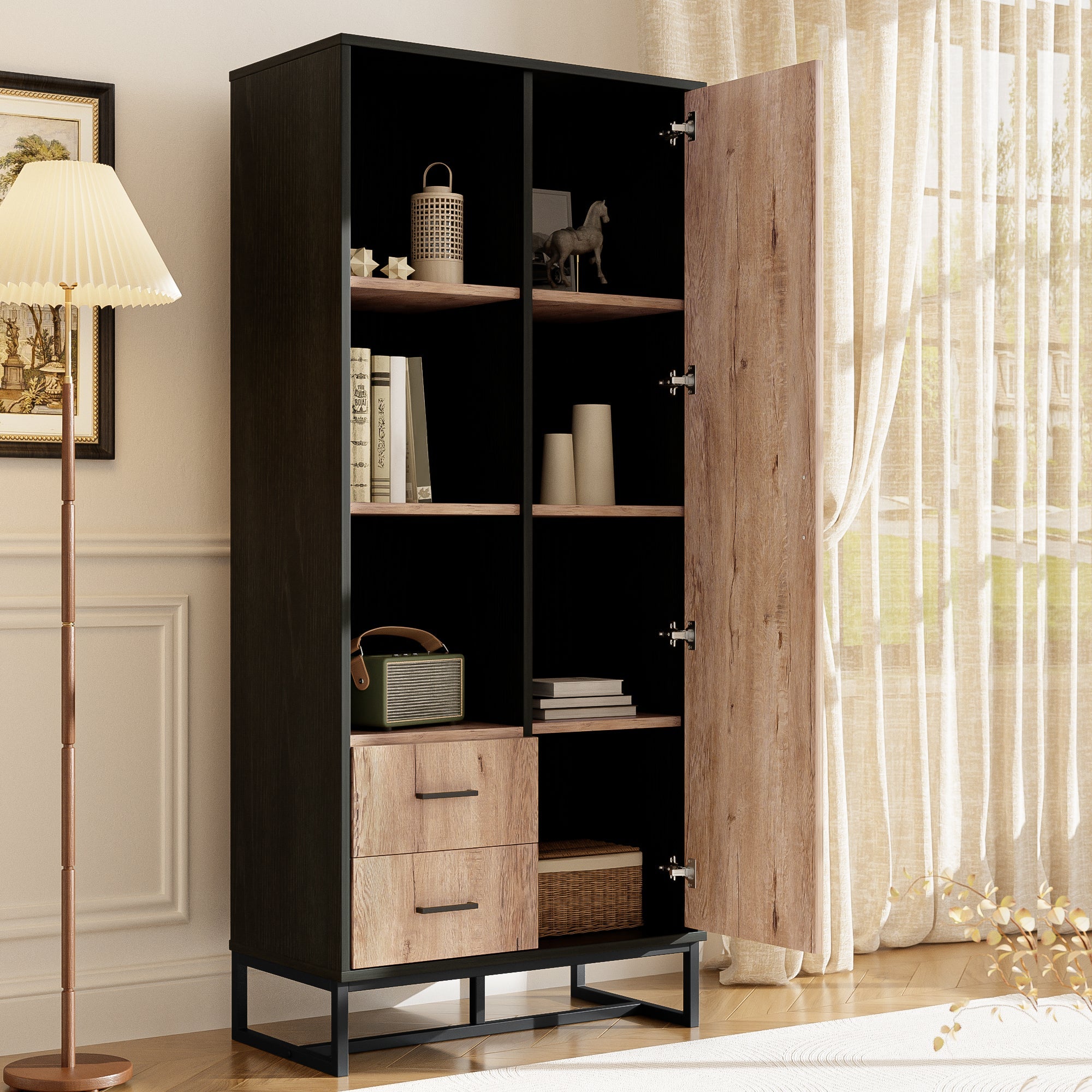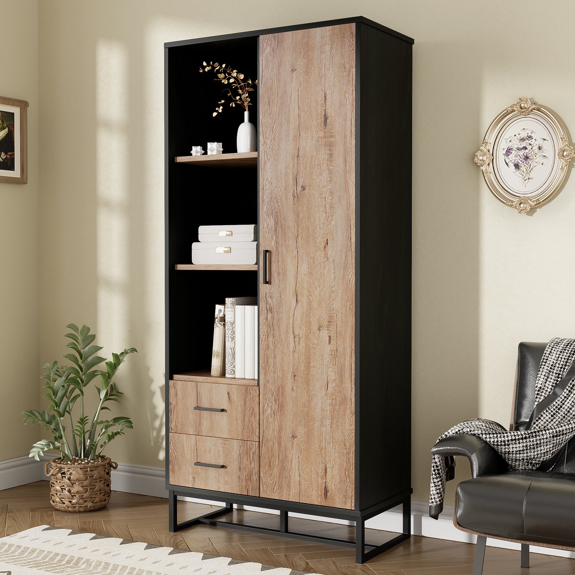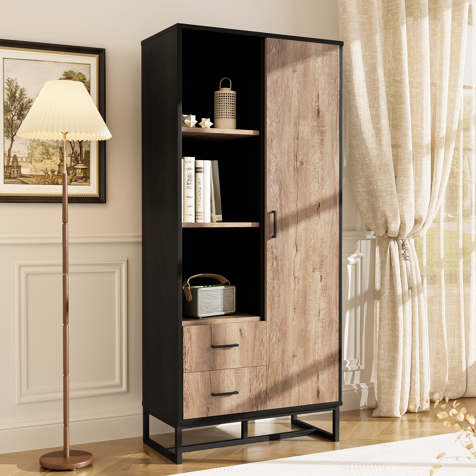 Highboard Cabinet with Door, 2 Drawers & 3 Open Compartments, Wood Look & Black Frame