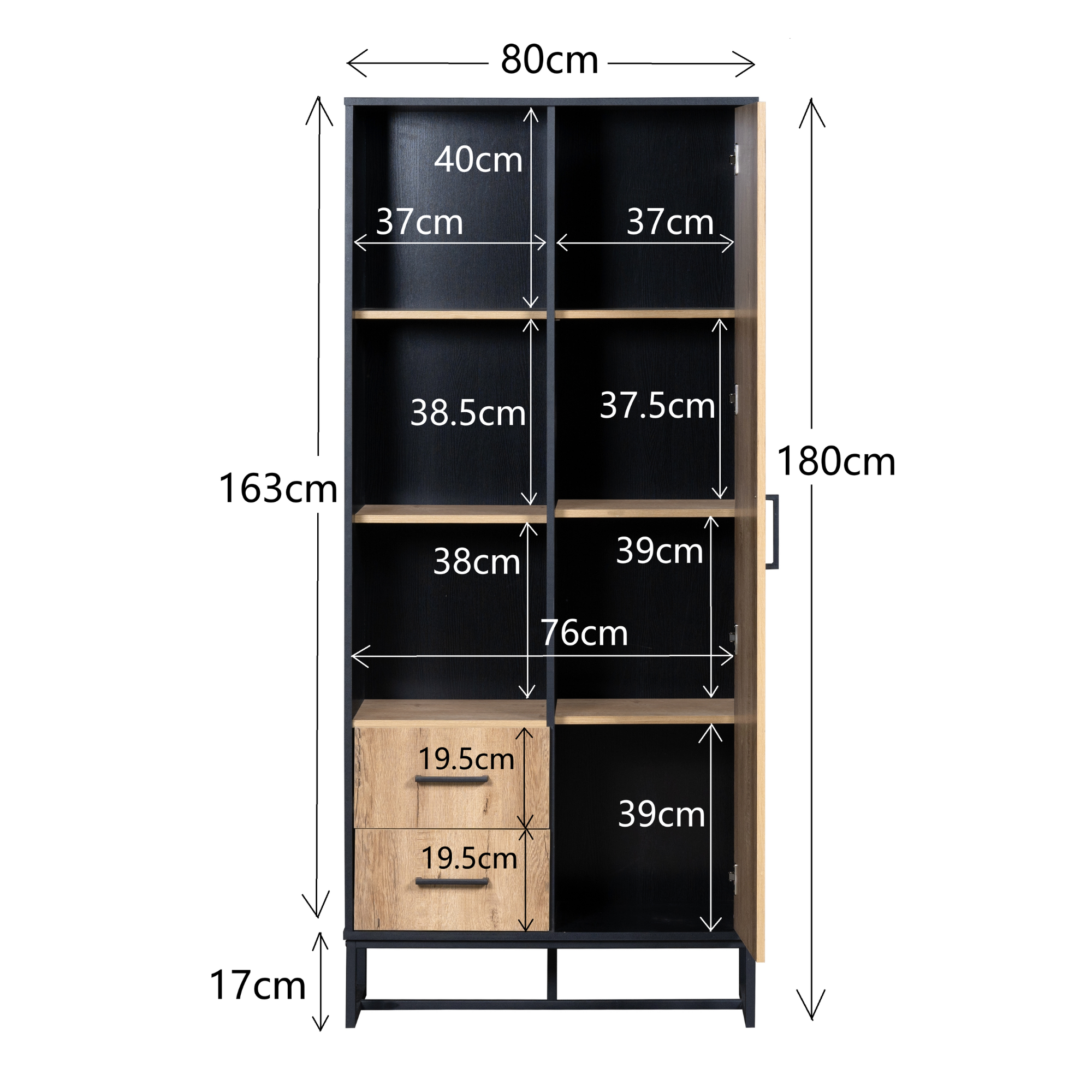 This stylish highboard cabinet combines natural wood with elegant black. Measuring 80 x 40 x 180 cm, it offers generous storage space for various living areas such as the living room, office, or hallway.
