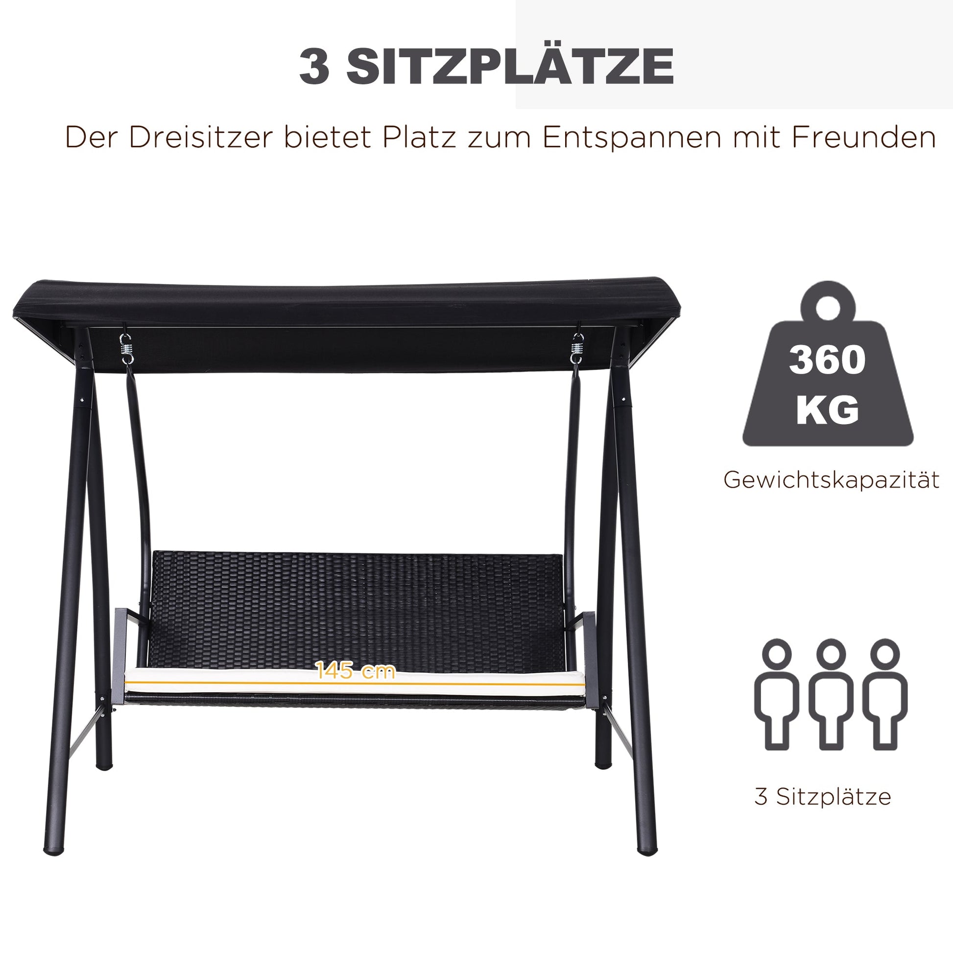 Large seating area: Thanks to the spacious 145 x 50 cm seating area, this swing offers plenty of room for up to 3 people to sit comfortably together.