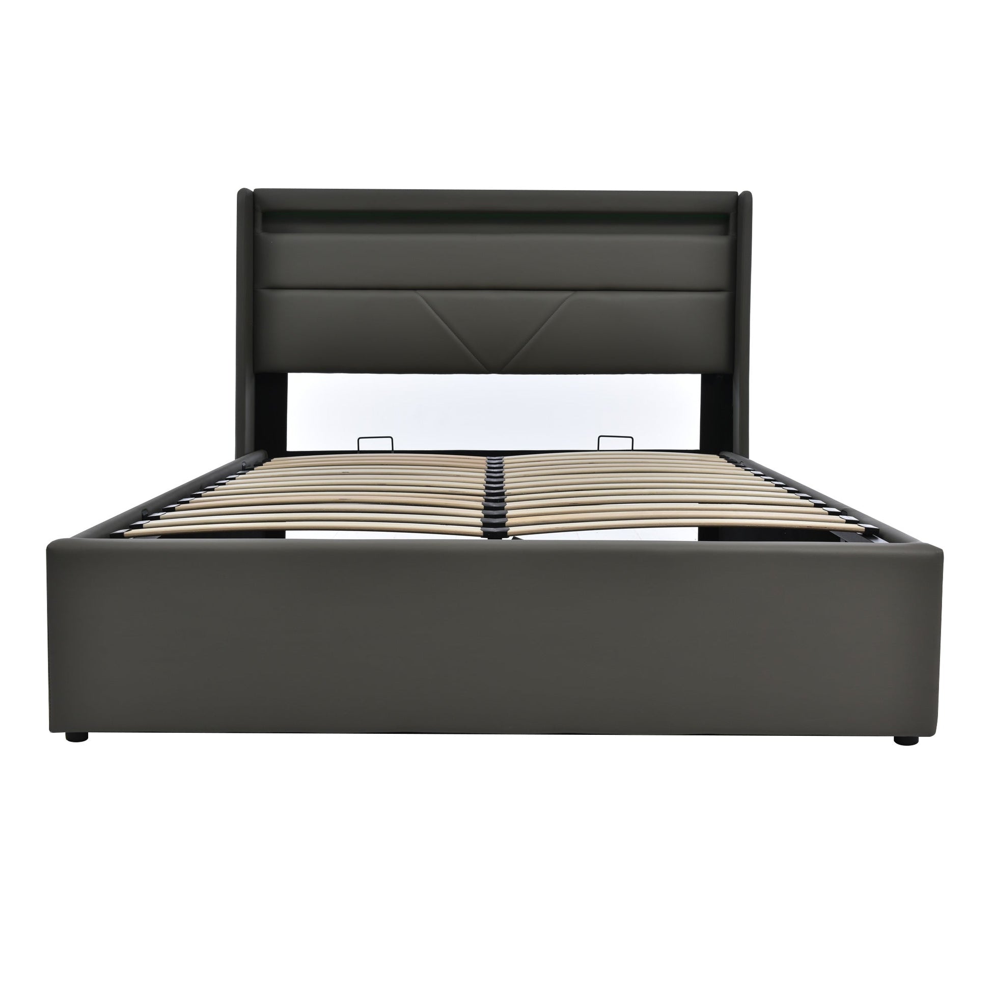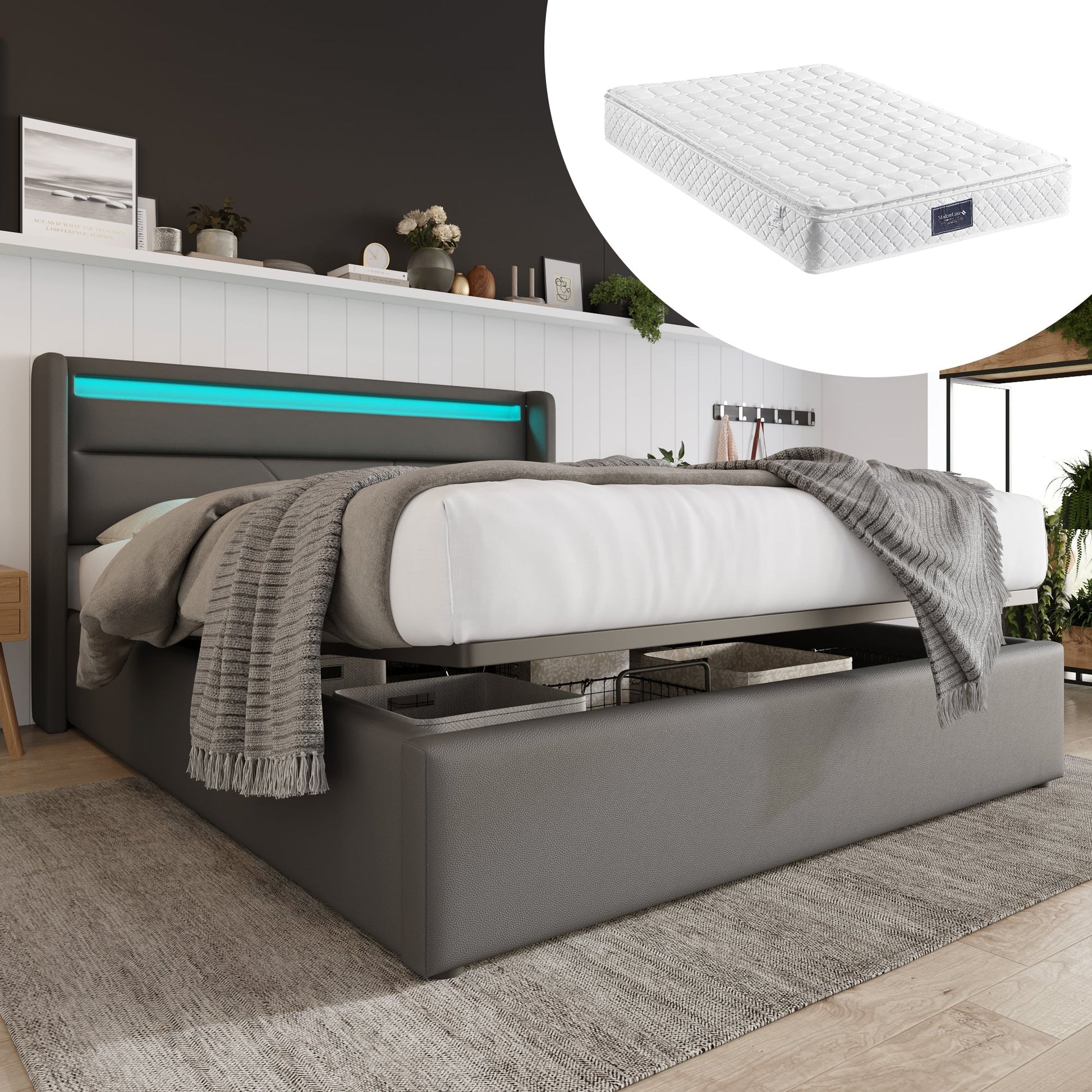 Hydraulic Storage Bed, 140x200cm Upholstered with LED, Grey