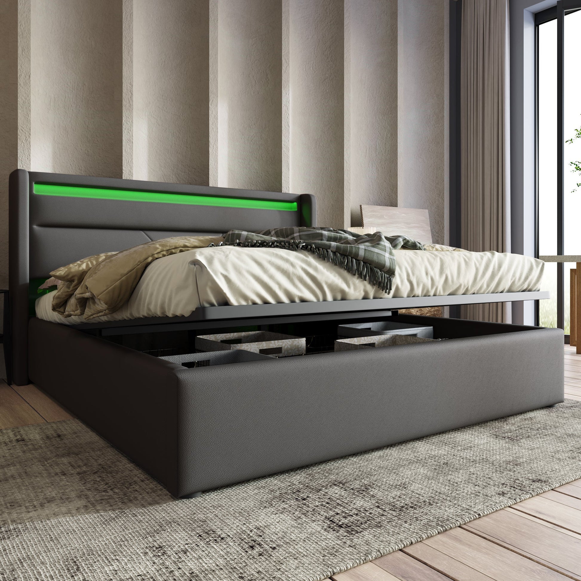 Hydraulic Storage Bed with LED Strip, Double Upholstered 160x200cm, Gray