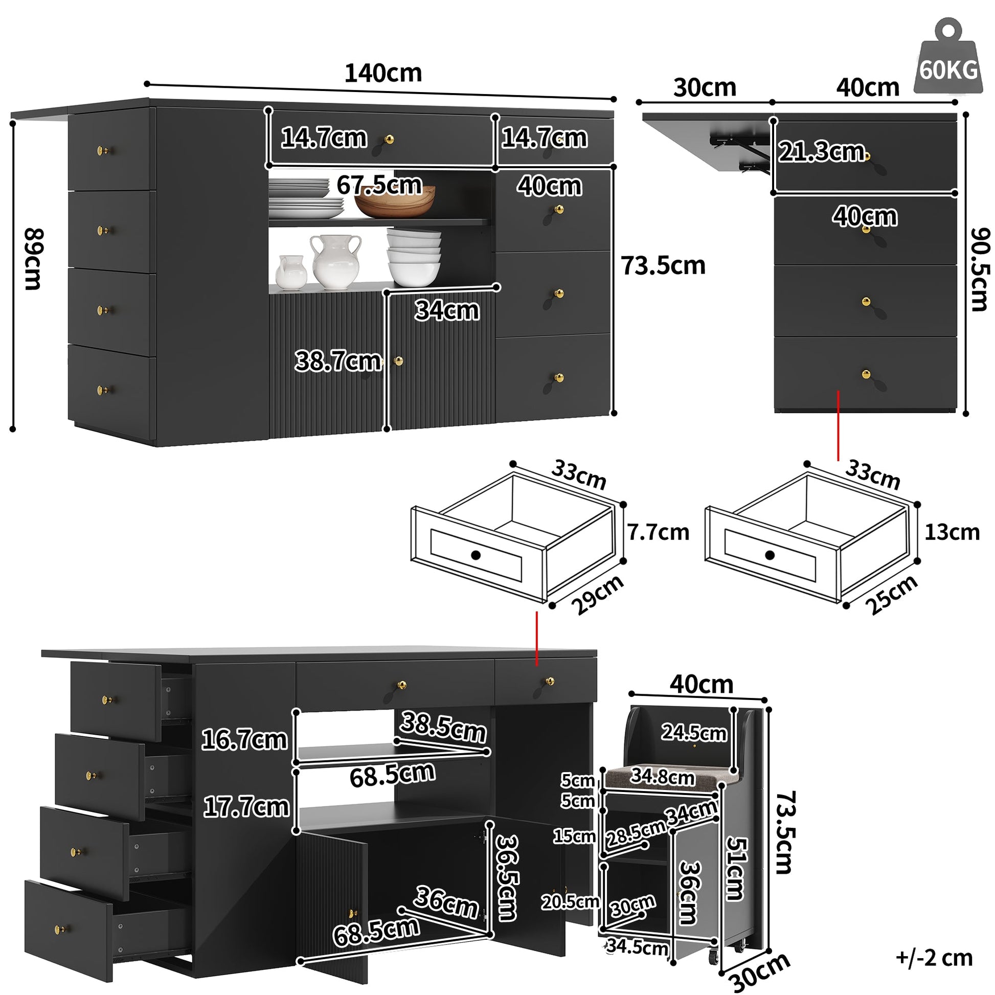 This kitchen island has fixed dimensions of 140 cm in length, 40 cm in width, and 89 cm in height, providing a stable and spacious work surface for your kitchen.