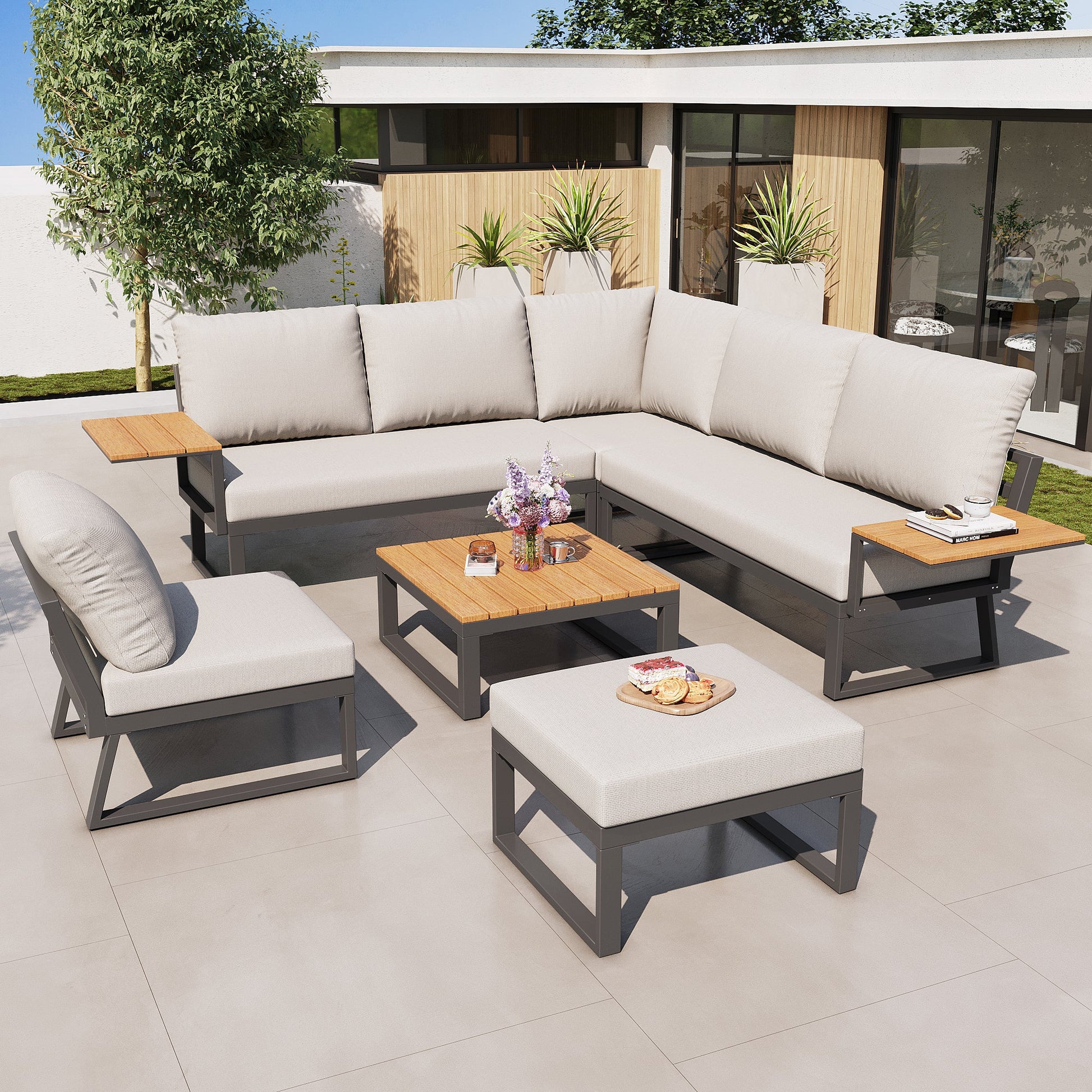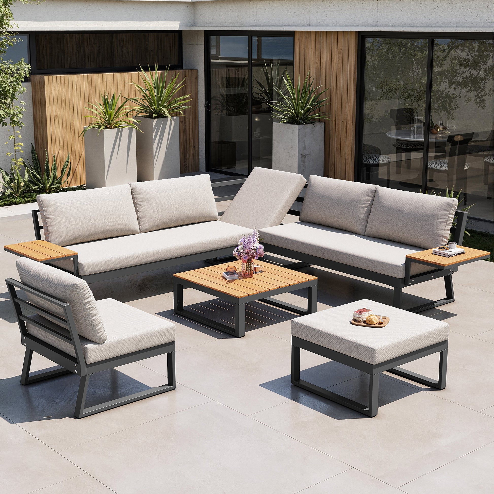 This set, which comfortably seats seven people with four sofas, an ottoman, and a wooden coffee table, is the perfect choice for garden parties and outdoor leisure. Comfort is guaranteed by the soft, breathable, 10 cm thick seat cushions. The wooden armrests add a unique design touch and can serve as temporary storage space. The elegant color combination is durable, comfortable, and suitable for various interior design styles.