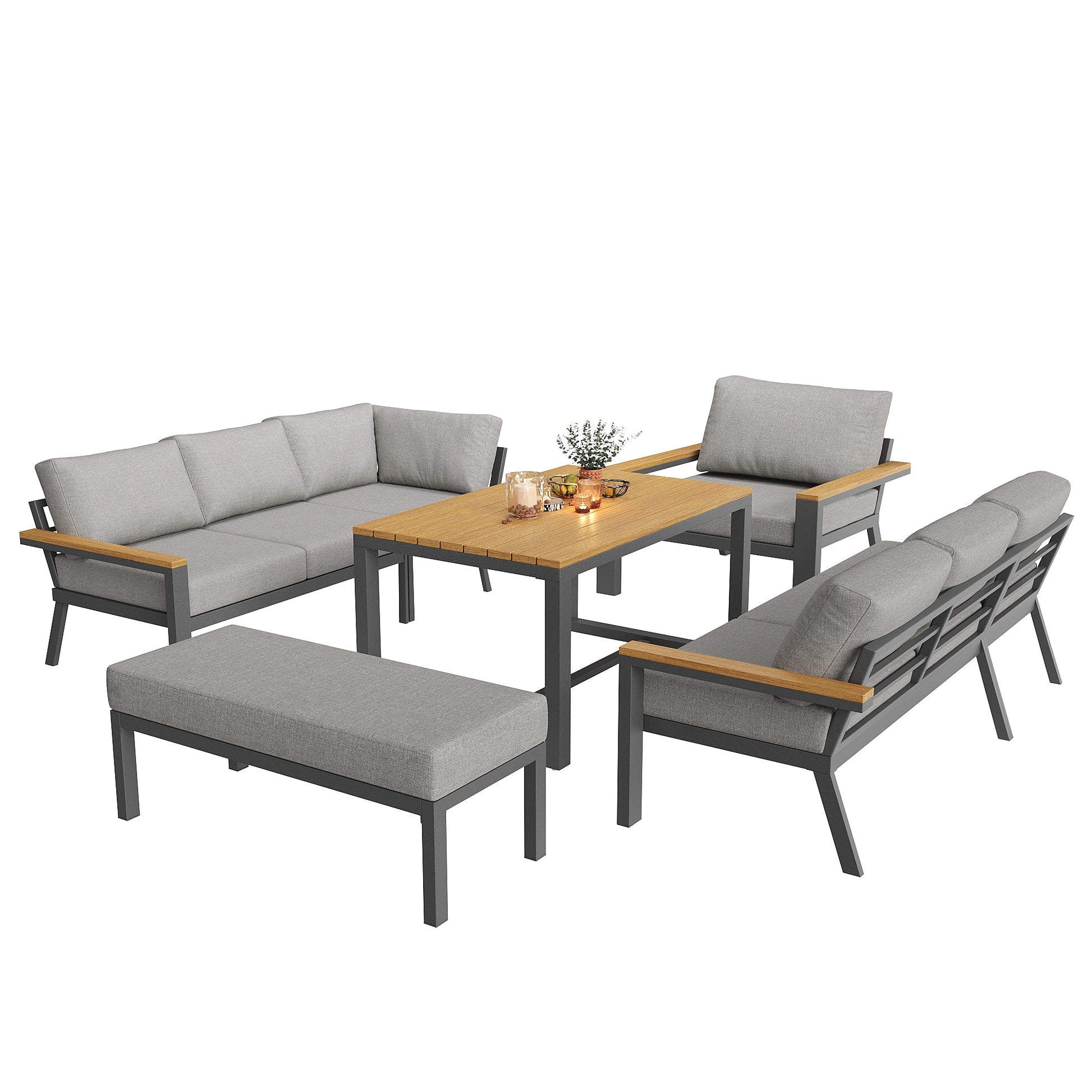L-Shaped Garden Sofa Set 8-Person Iron Frame Wood Table - Grey Cushions