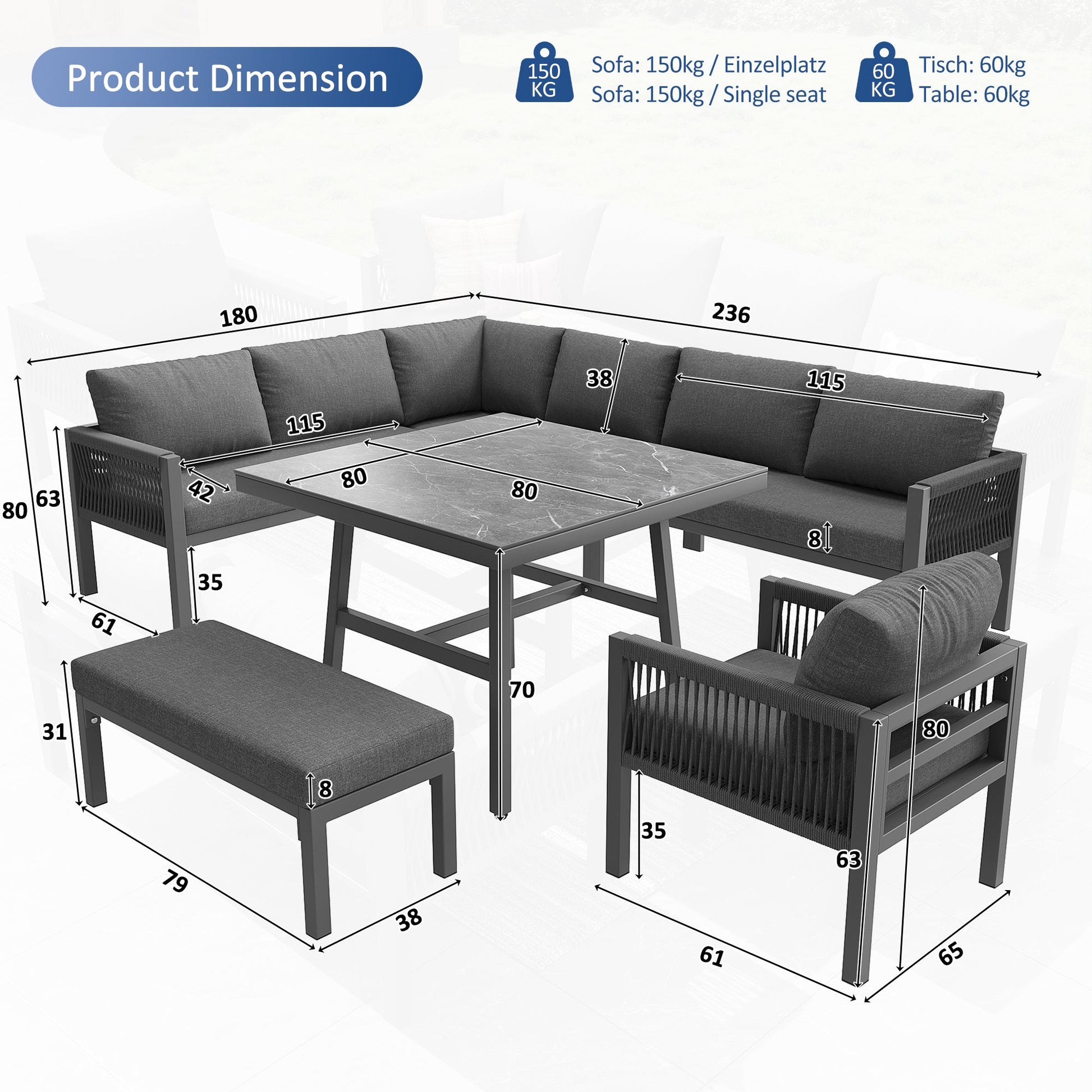 This set is the perfect choice for your garden party. It includes three two-seater sofas, an armchair, a bench, and a glass table, comfortably seating up to eight people. The 8 cm thick seat cushions are soft and breathable. The artfully hand-woven armrests add a unique design accent to the entire seating group. The coordinated color combination in subtle tones is elegant and versatile enough to complement various interior design styles. With its outstanding comfort and durability, this set is the ideal choice for relaxing hours and entertaining outdoors.