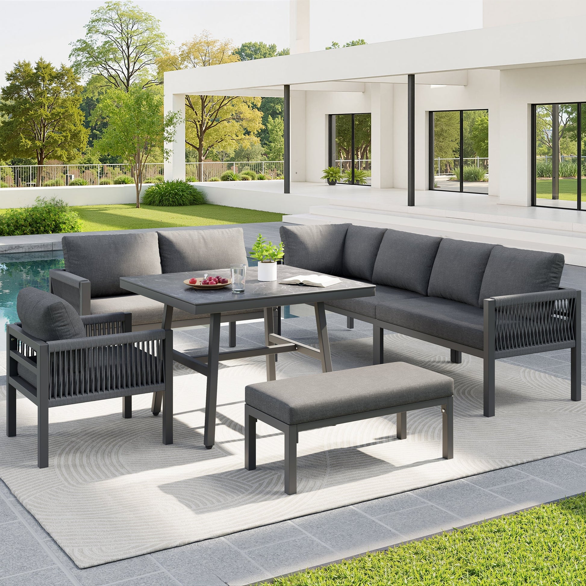 L-Shaped Garden Sofa Set Handwoven 8-Seater Iron Frame Table 2 Armchairs - Grey