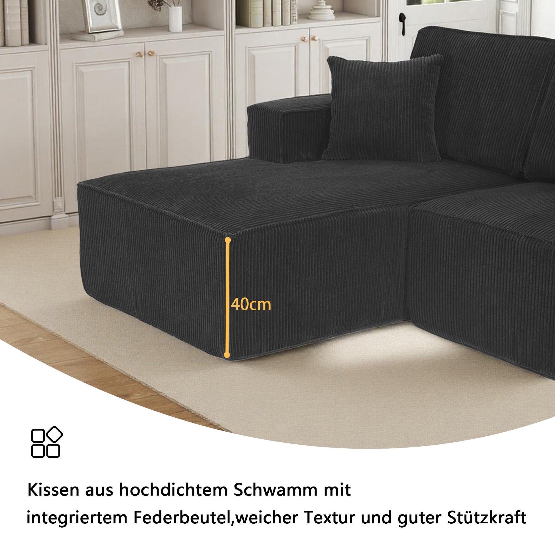 L-shaped Modular Corner Sofa 2-Seater Chaise Black Corduroy Fabric