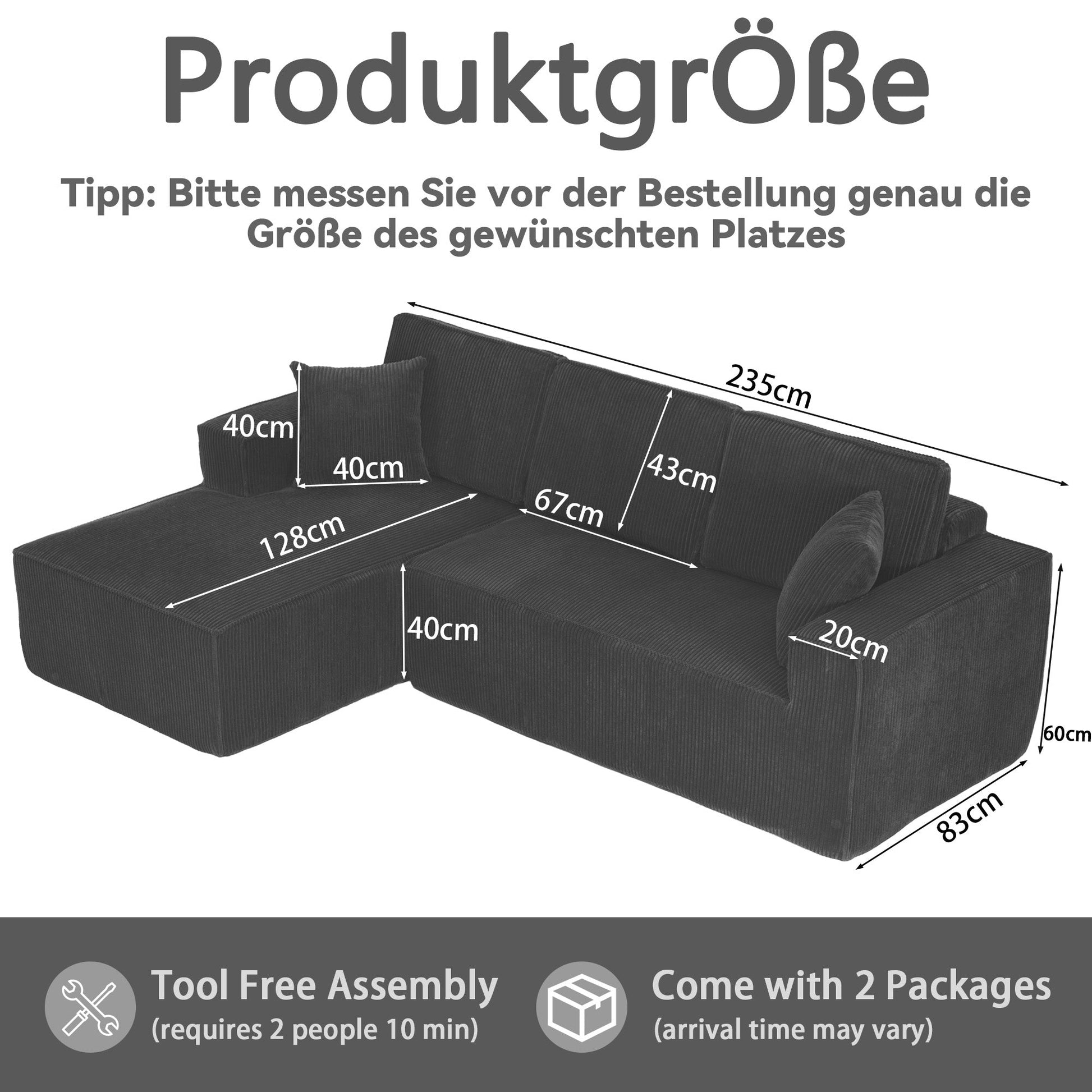 Delivery: Since the sofa consists of several parts, we ship it in 2 separate packages. Delivery of the individual packages may occur at different times (different delivery dates are possible).