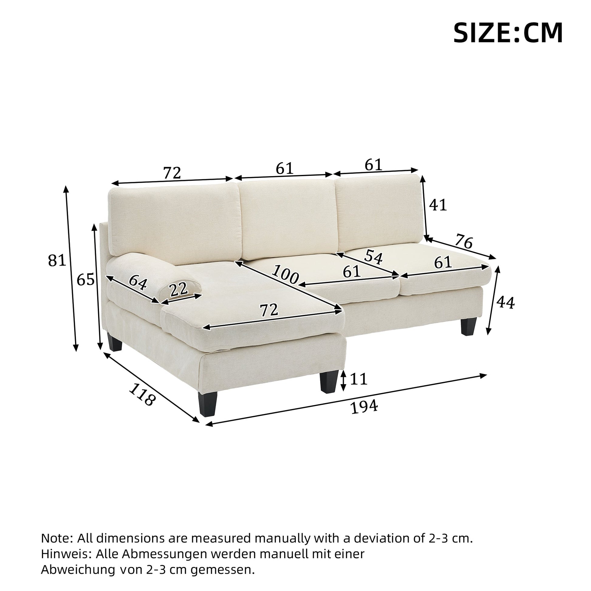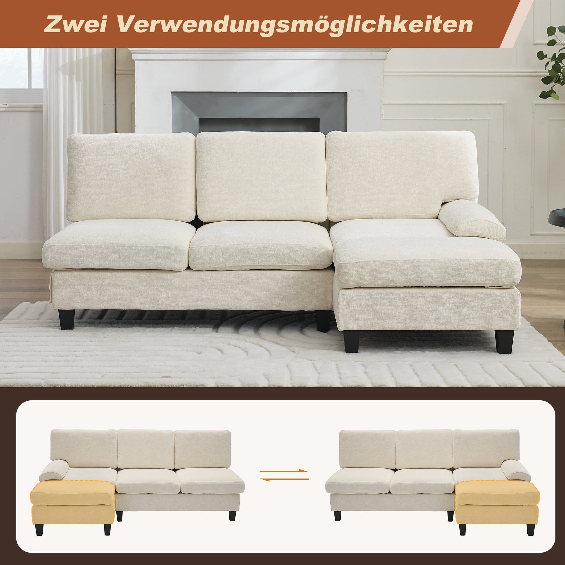This sofa combines aesthetics and functionality with soft, comfortable cushions that adapt to your body's contours. The versatile beige color harmonizes with modern minimalist and Scandinavian interior design styles. With its compact size, it saves space and fits easily in a living room, apartment, lounge, or bedroom. The generous three-seater configuration offers ample room, and the ergonomic corner design creates a cozy seating area. The high-quality upholstery is breathable, skin-friendly, and easy to care for. A sturdy frame with highly elastic padding prevents sagging or deformation, ensuring lasting comfort and well-being. Advantages include the L-shaped corner design and being movable and combinable, making it ideal for small spaces.