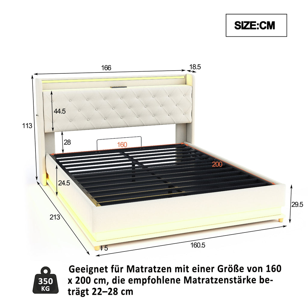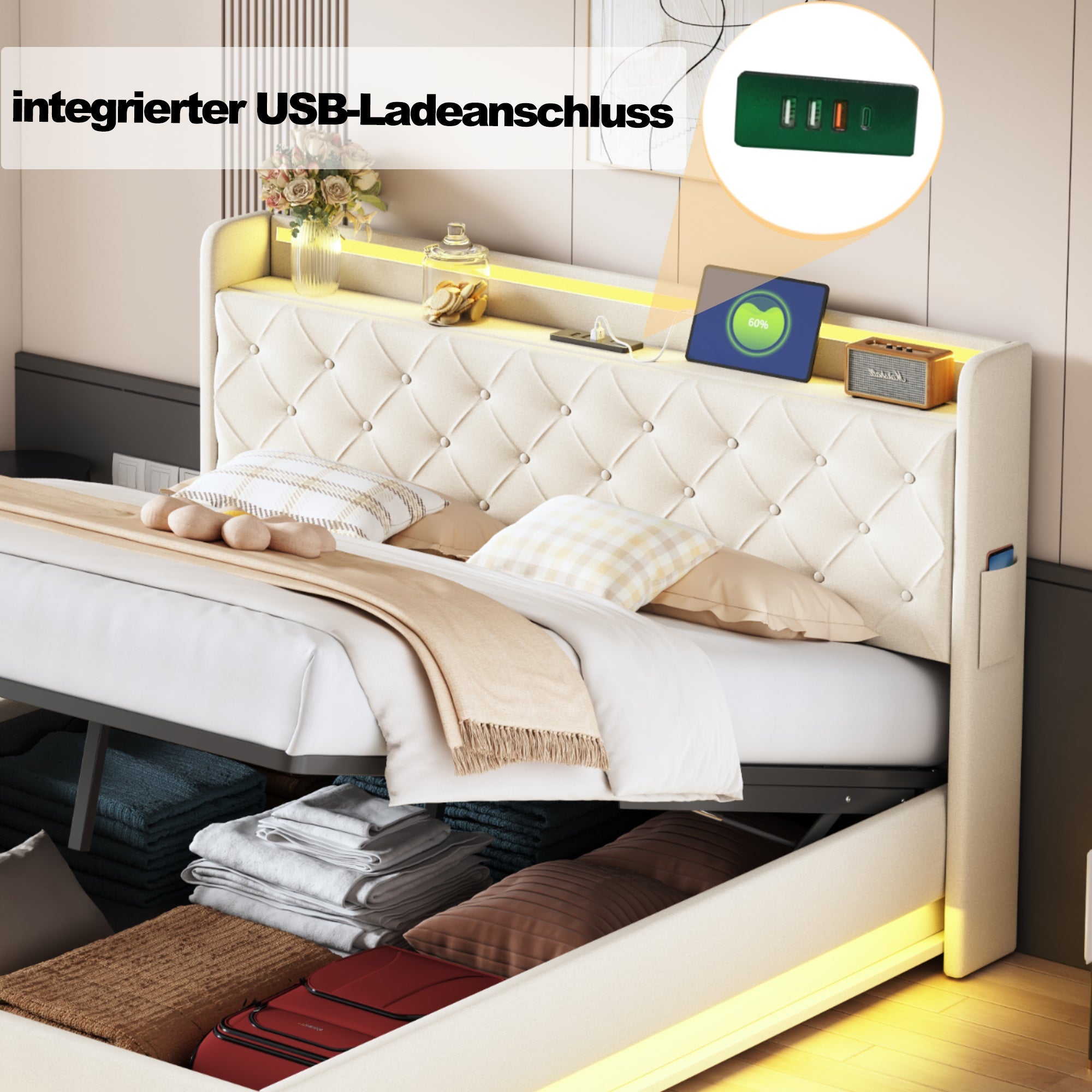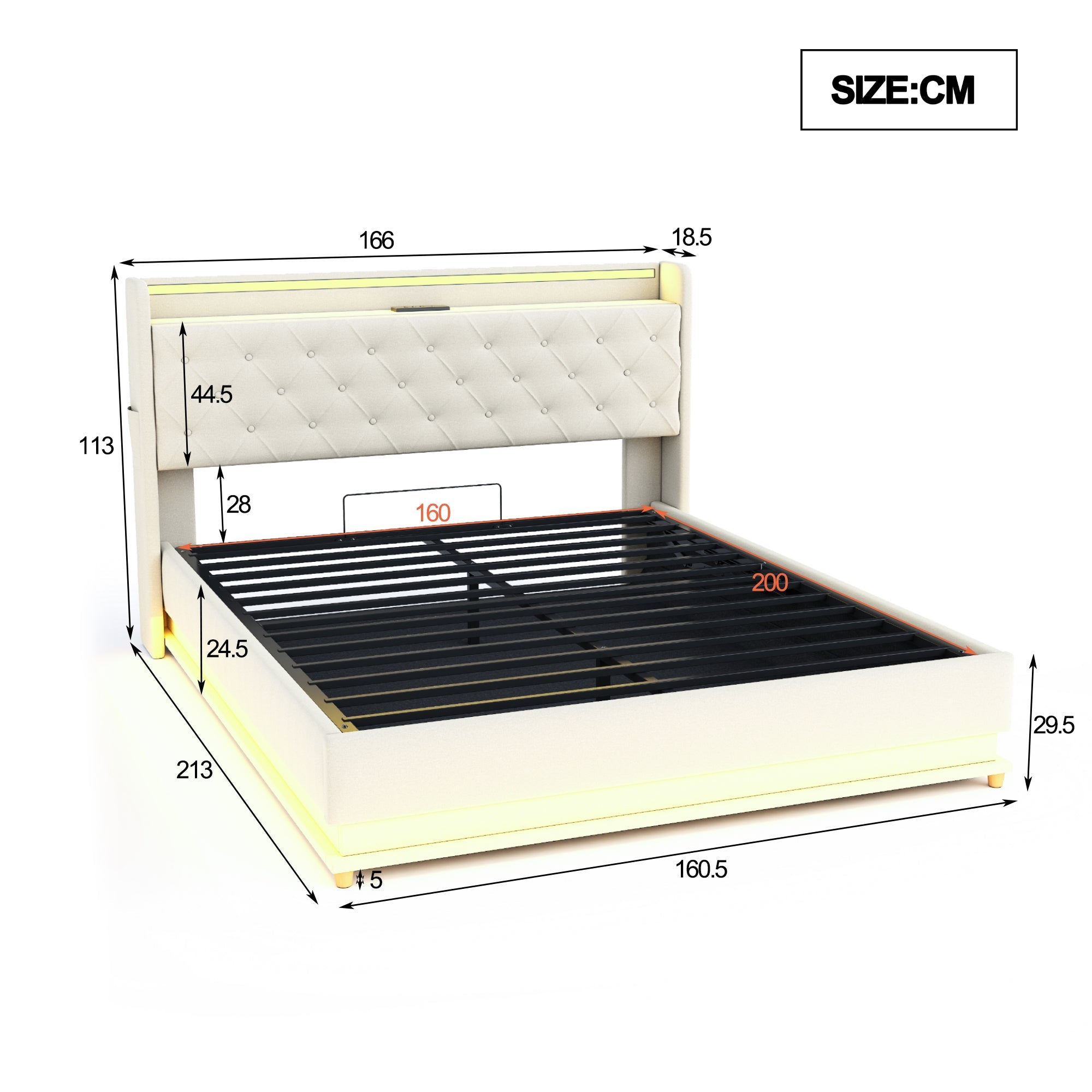 LED Upholstered Bed, 160x200 cm with USB Charging & Hydraulic Storage, Linen Fabric Beige