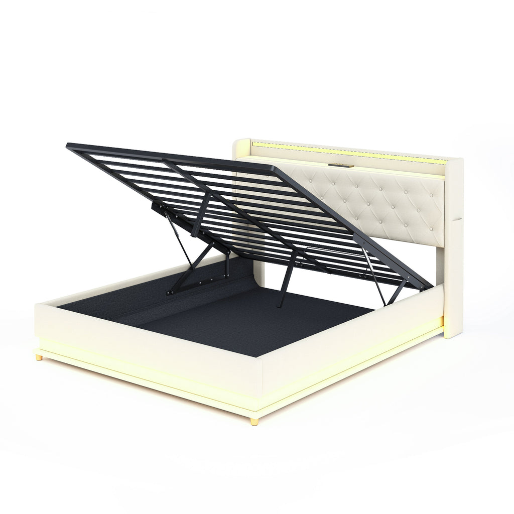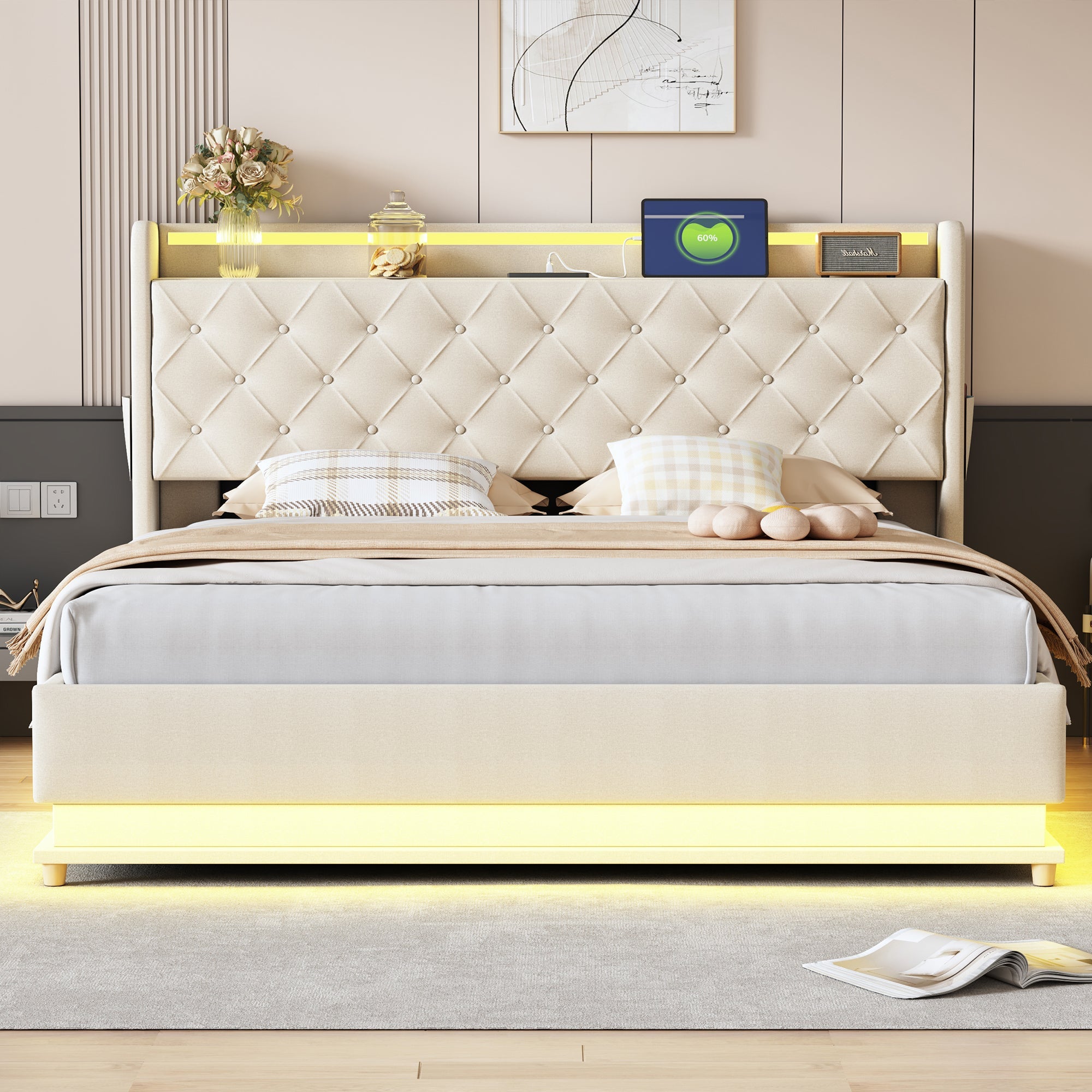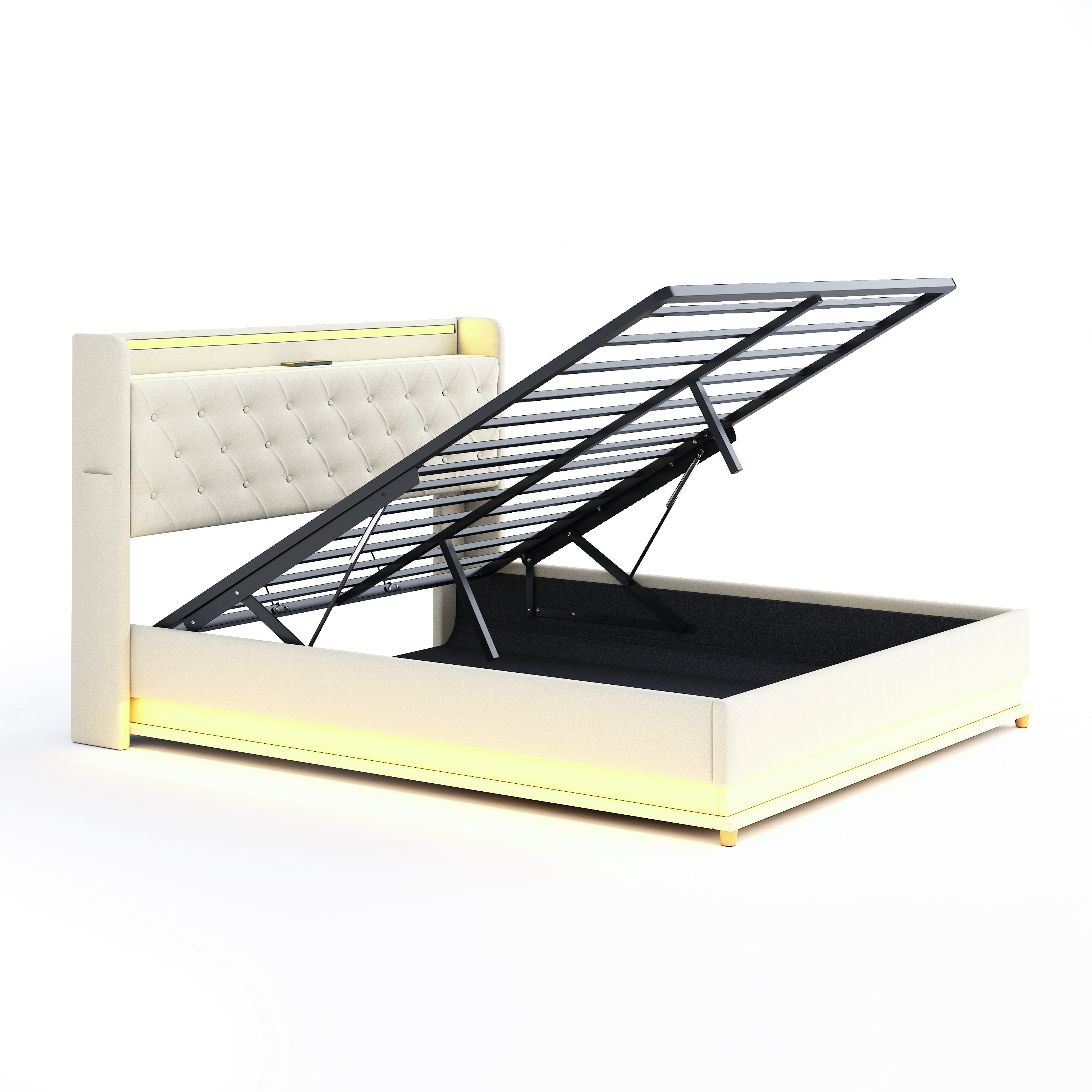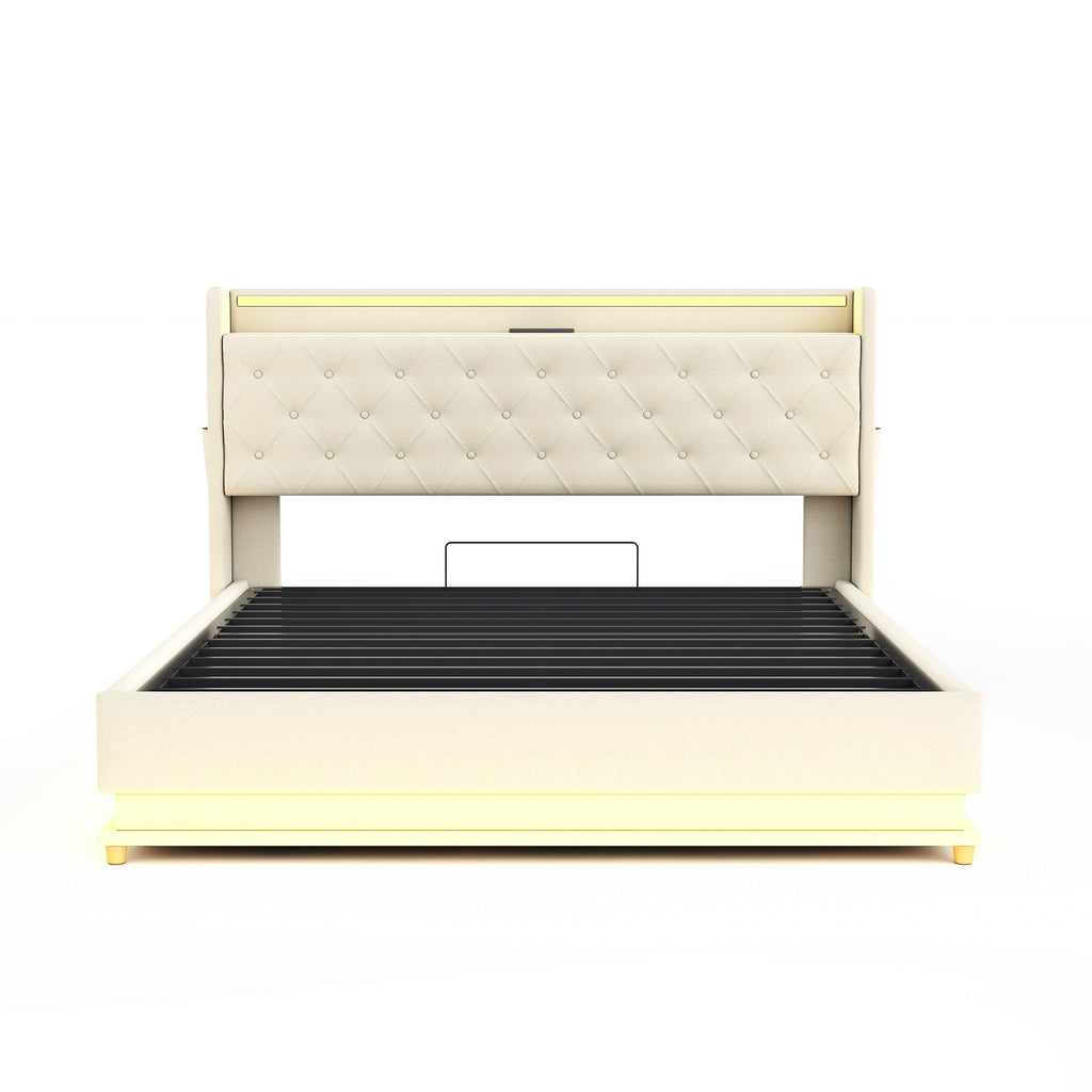 LED Upholstered Bed, 160x200 cm with USB Charging & Hydraulic Storage, Linen Fabric Beige