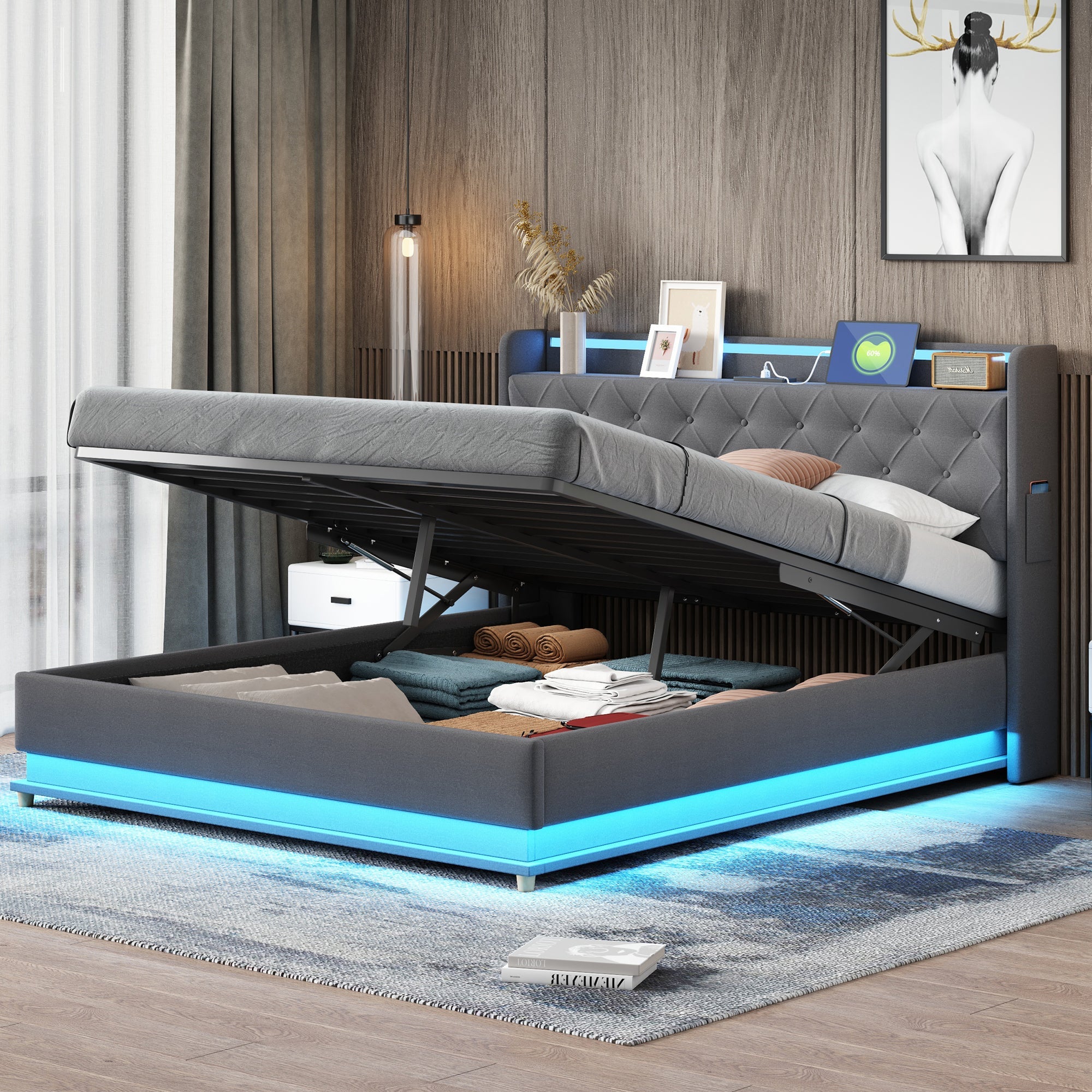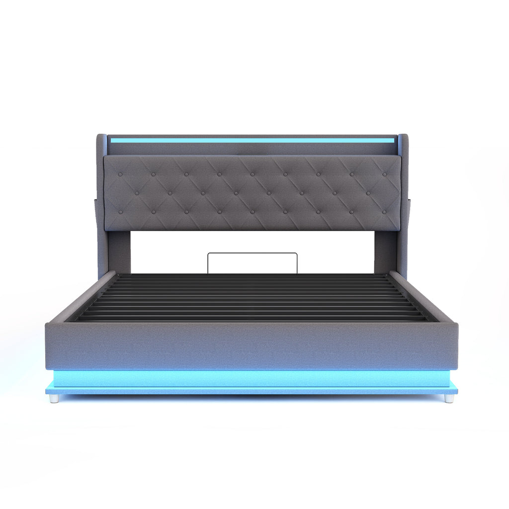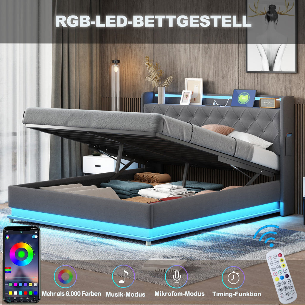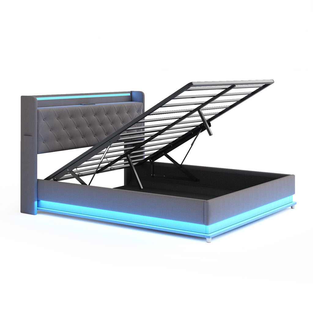 LED Upholstered Bed, 160x200 cm with USB Charging & Hydraulic Storage, Linen Fabric Gray