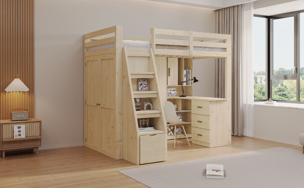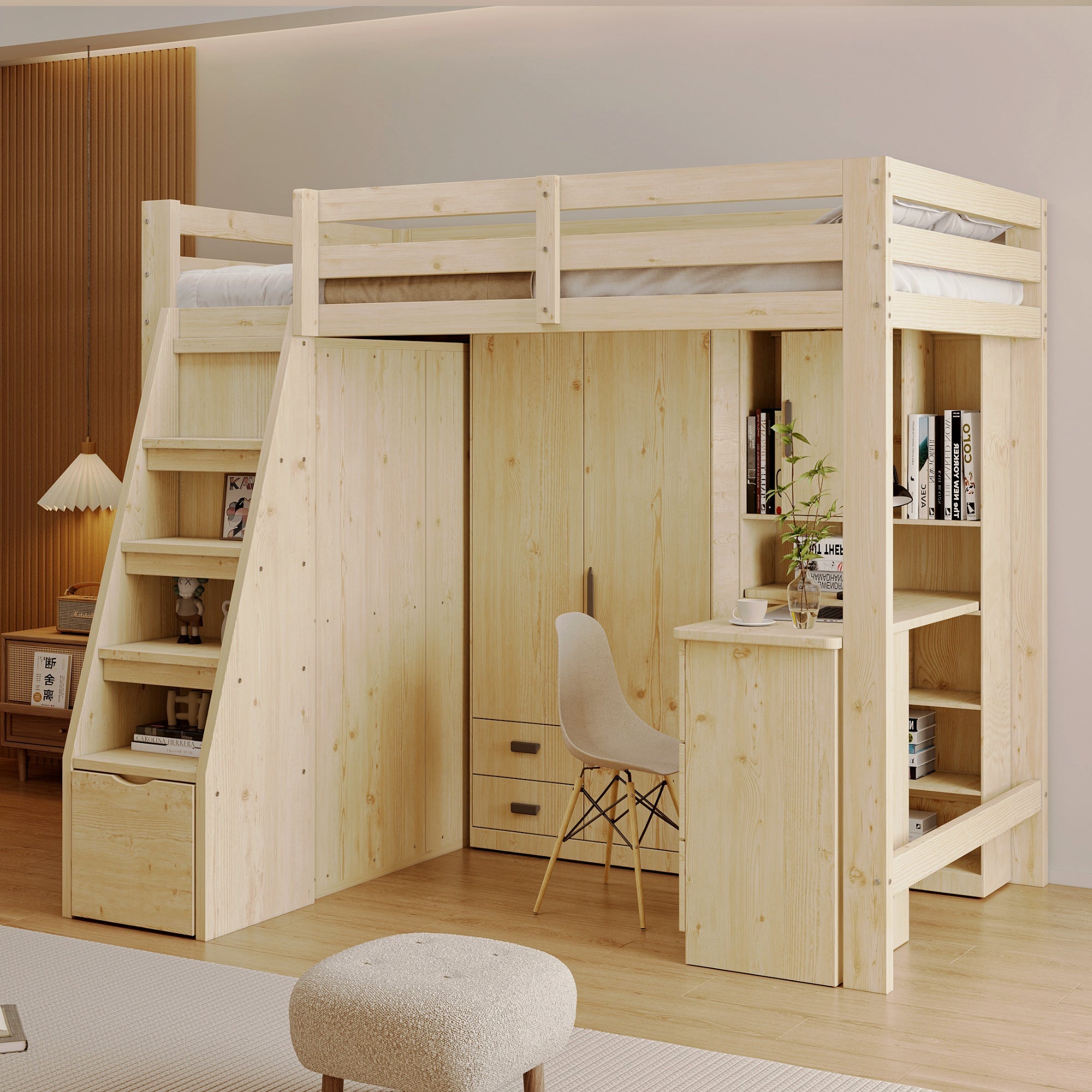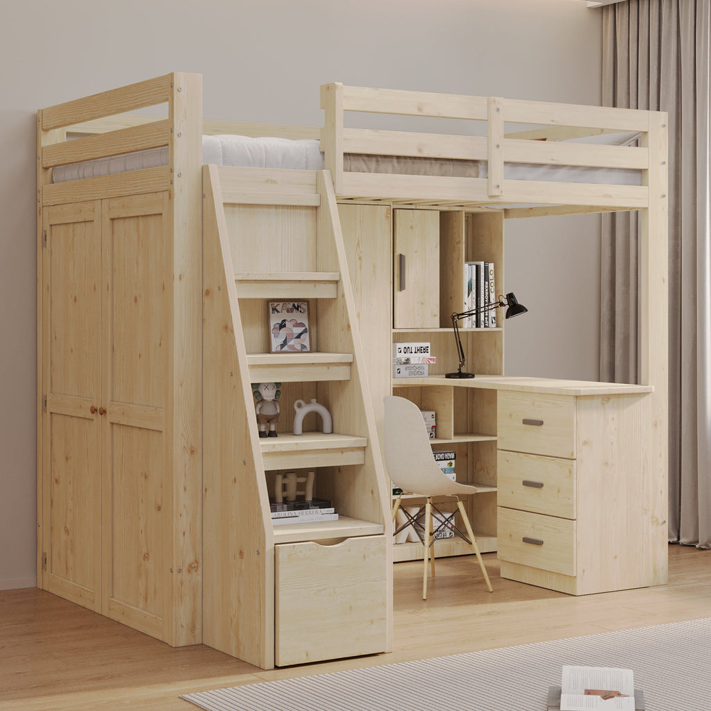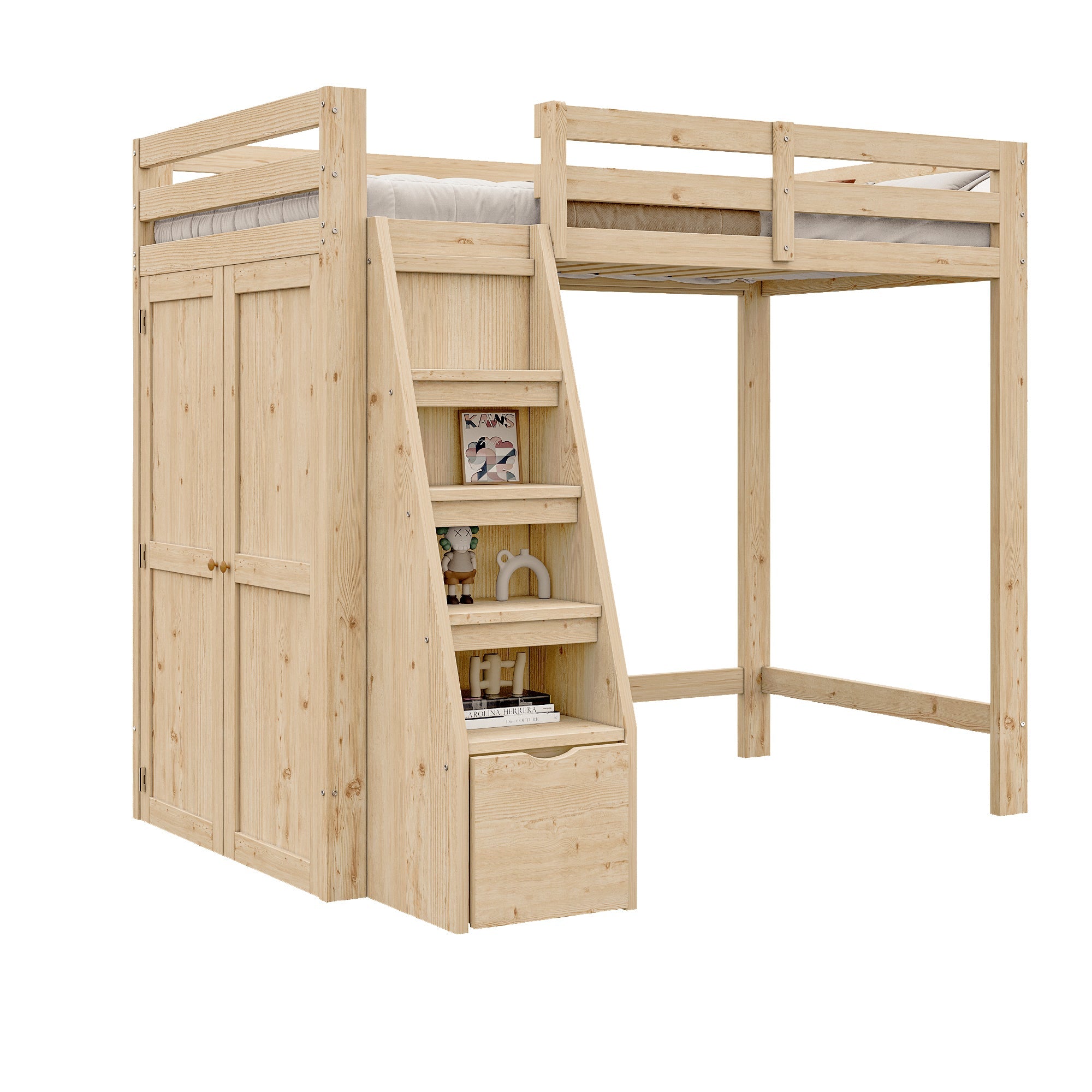 Loft Bed 90*200cm, Storage, Safety Climbing Ladder, Wardrobe, Solid Wood, Original Wood Color