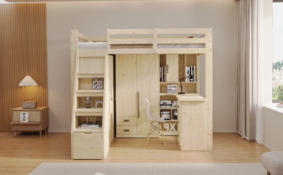 This loft bed features a built-in wardrobe on the side of the bed for easy storage of clothes, toys, and other personal items. Additionally, the open space under the loft can be customized to your child's needs. Whether they want to create a cozy reading nook, a play area, or a study corner, this versatile space allows them to unleash their creativity.