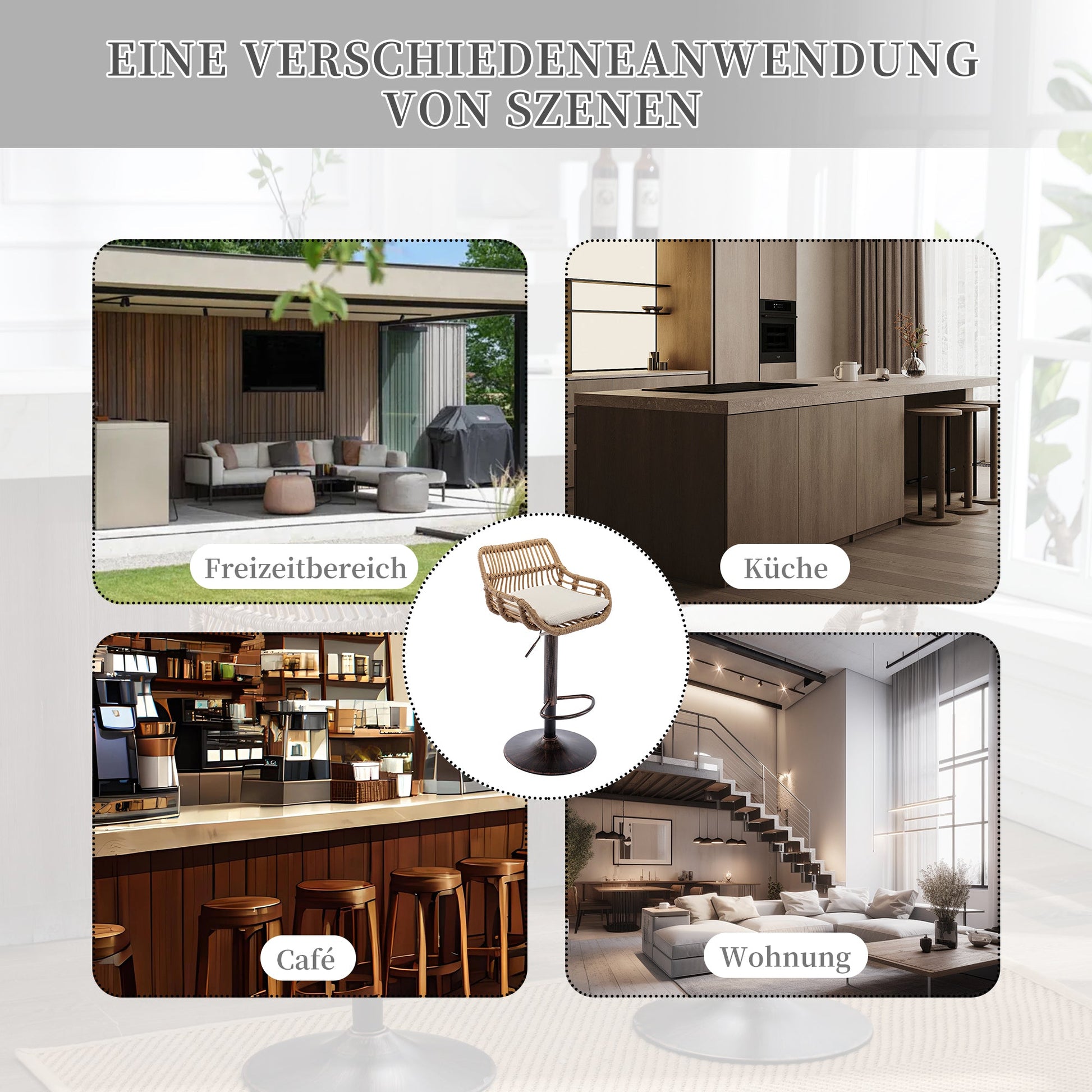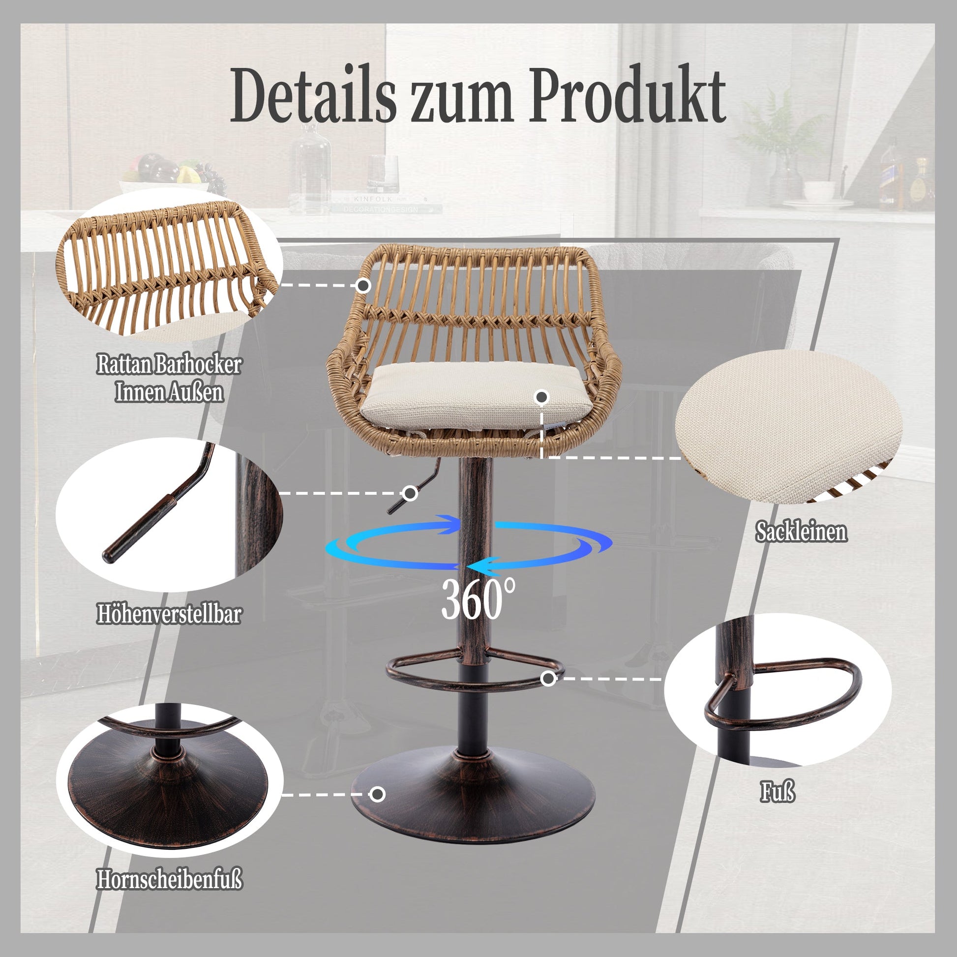 Sturdy Frame: This bar stool, suitable for indoor and outdoor use, features a metal disc base and a woven backrest. The chair swivels 360°, and the bar can be adjusted up and down.