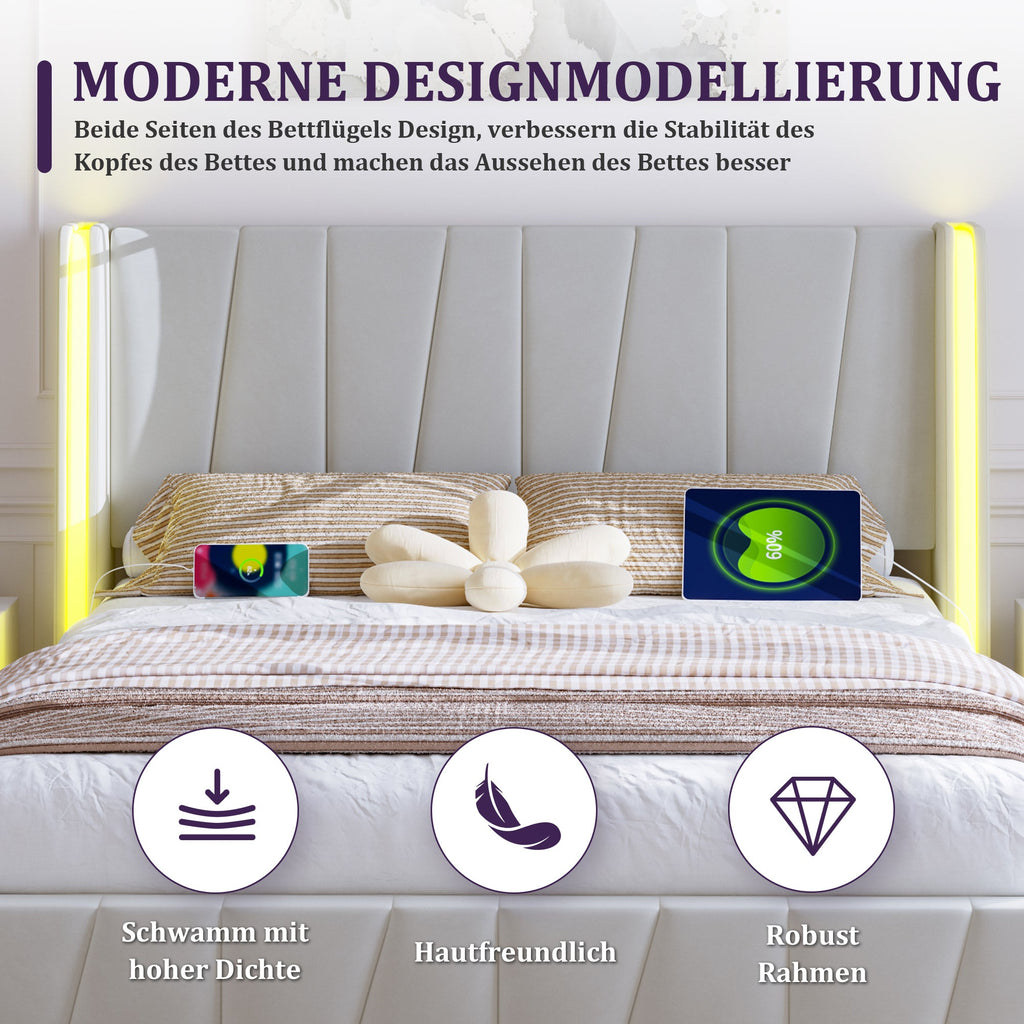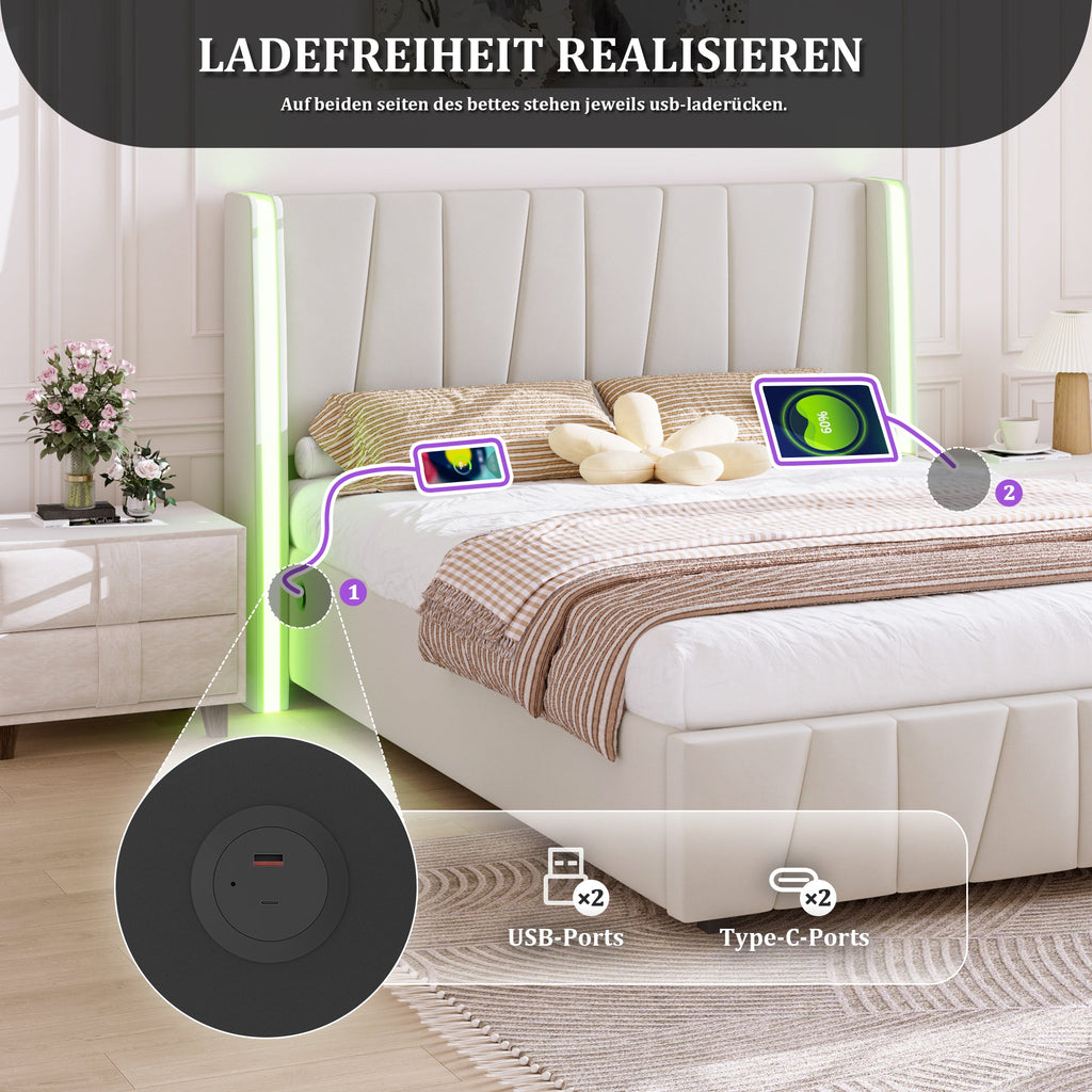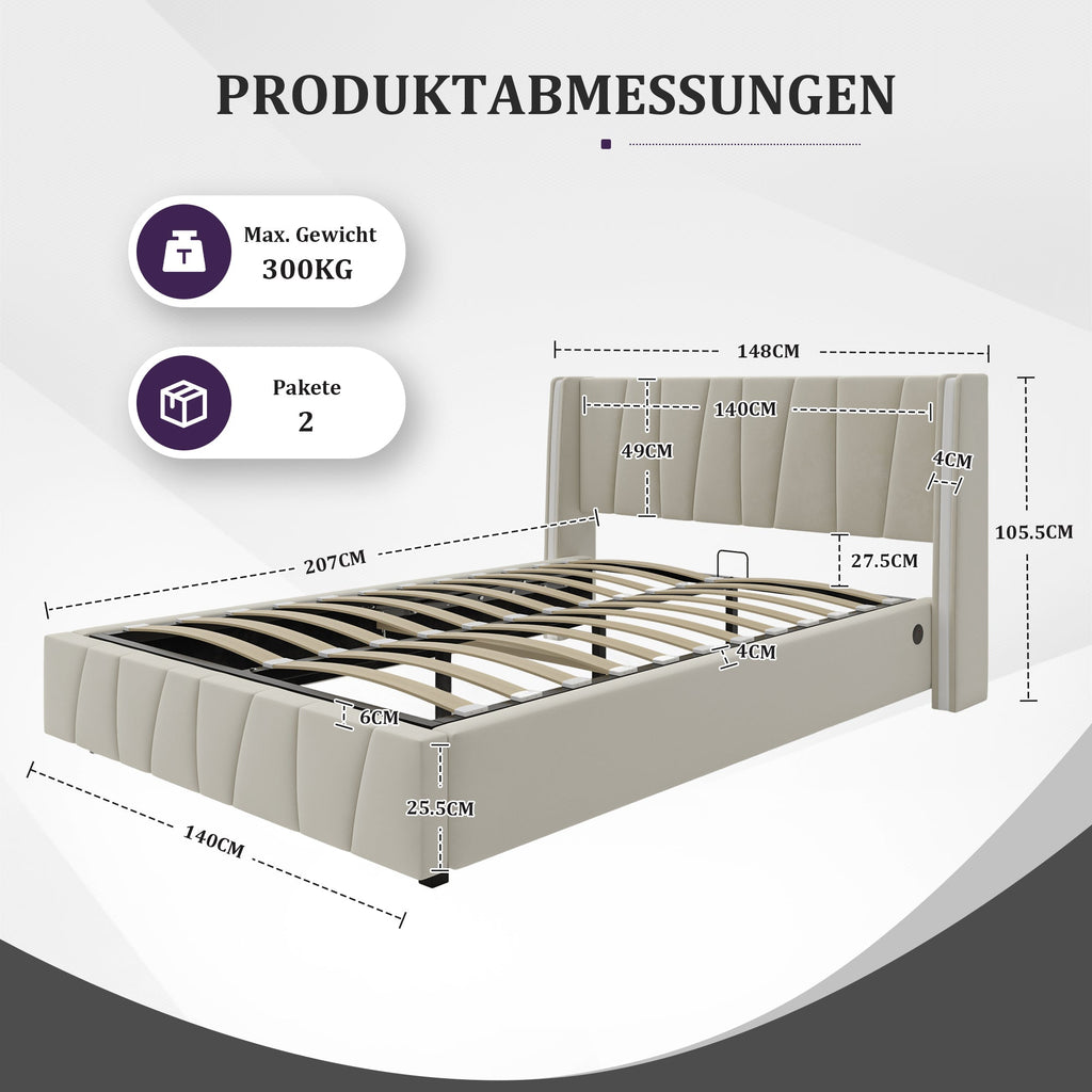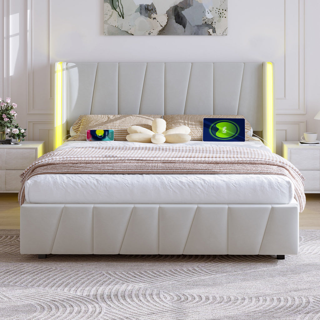 Modern Bed Frame, Hydraulic Storage, USB Ports, Velvet Beige
