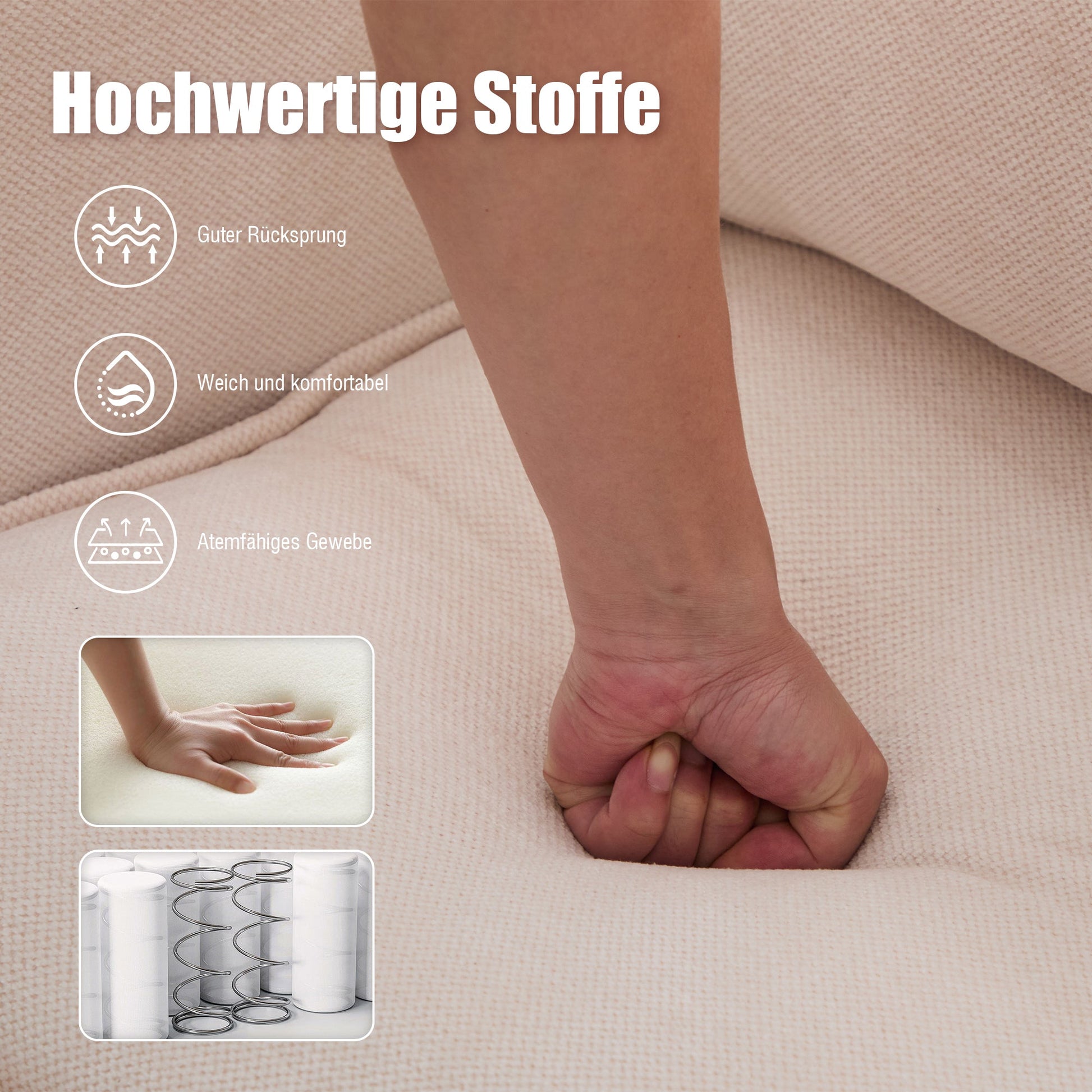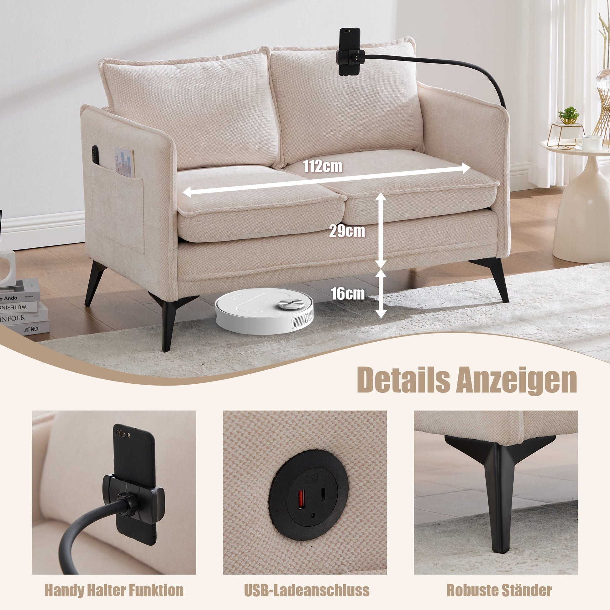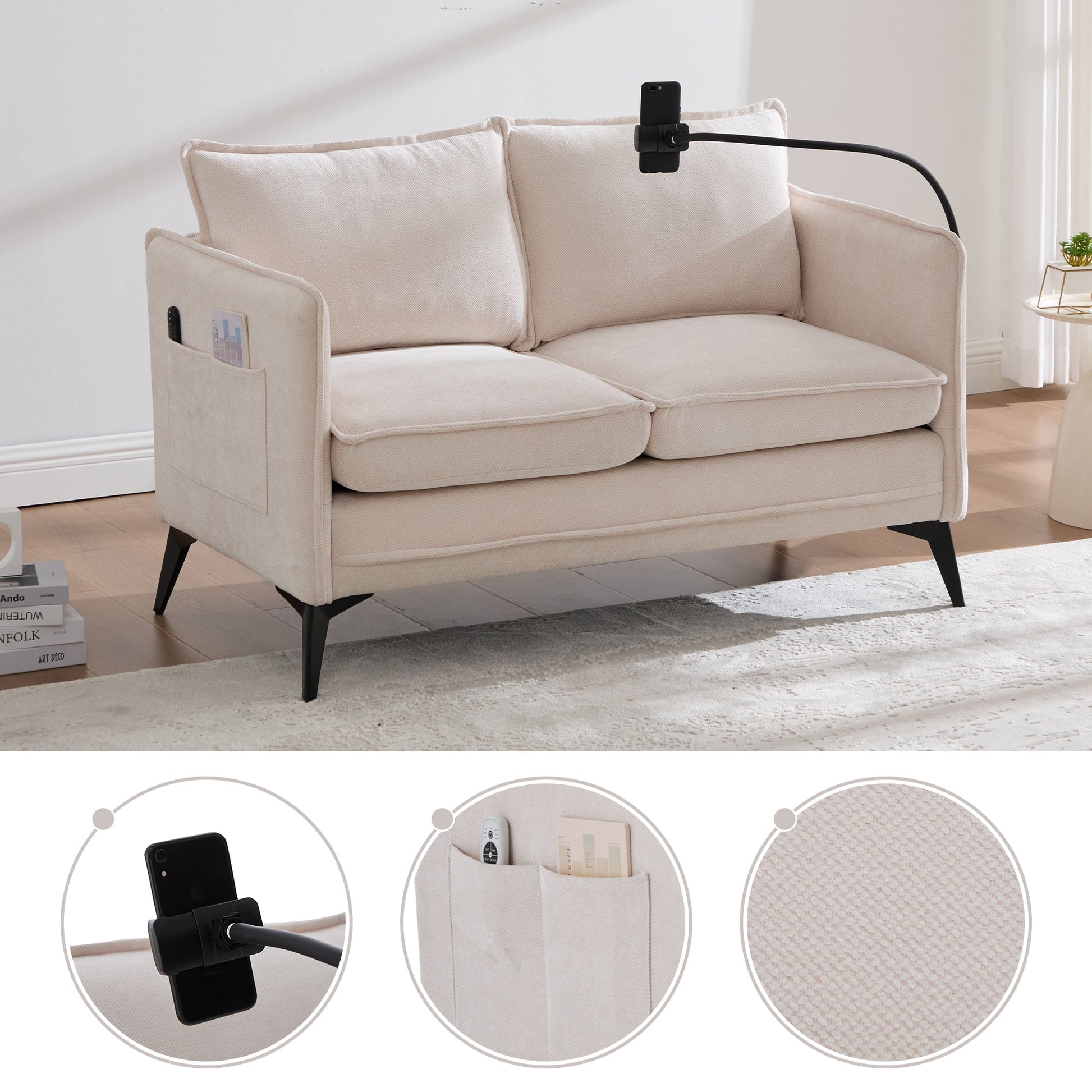 Modern Double Sofa, Small Fabric Armchair with Storage & Phone Holder