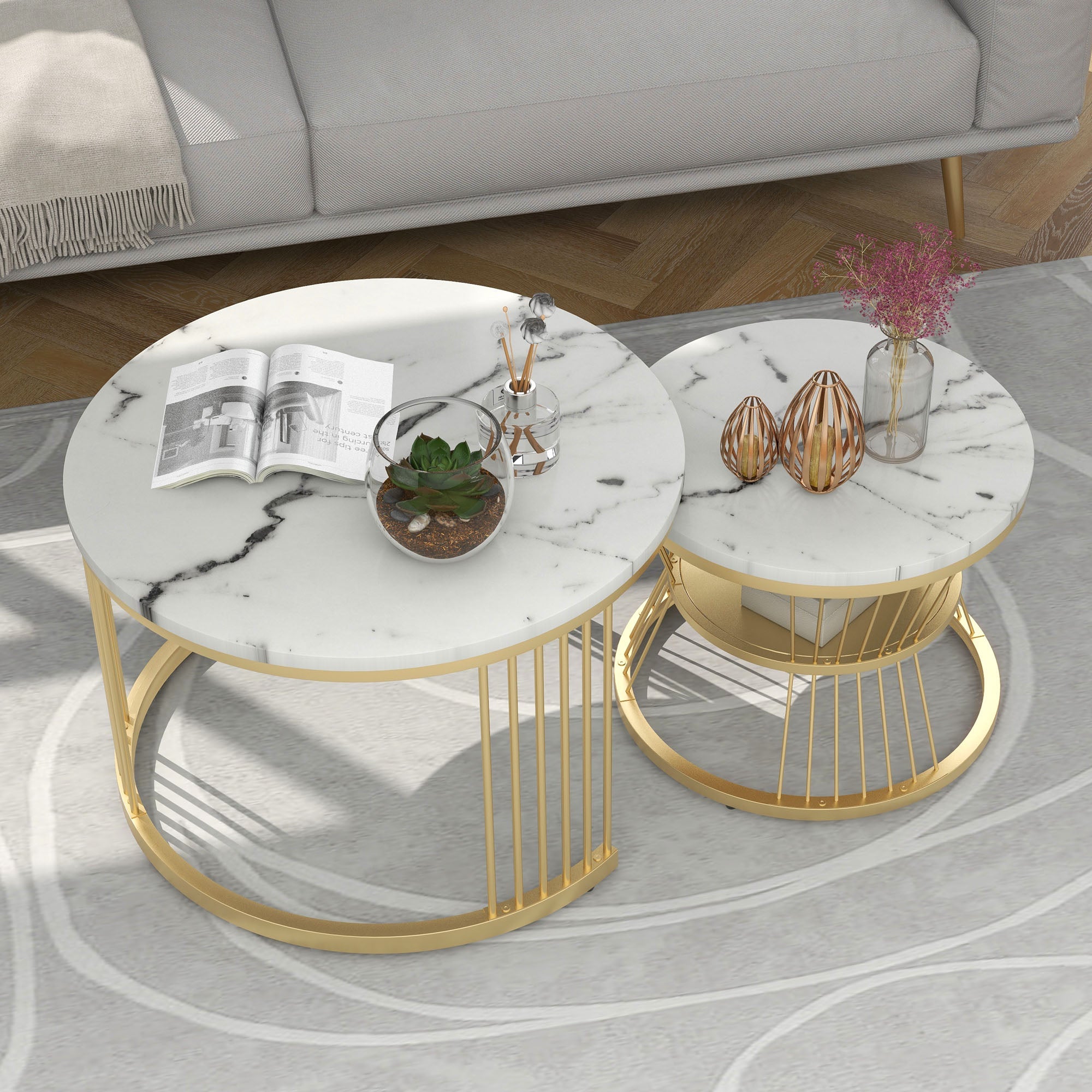 Nesting Design for Space Saving: This set of round coffee tables can be used individually for various purposes, such as a lamp table, side table, or nightstand. Alternatively, you can stack these two small round coffee tables together to save space and create a sophisticated design.
