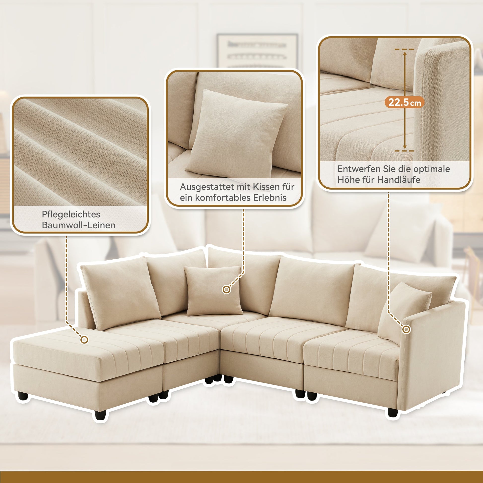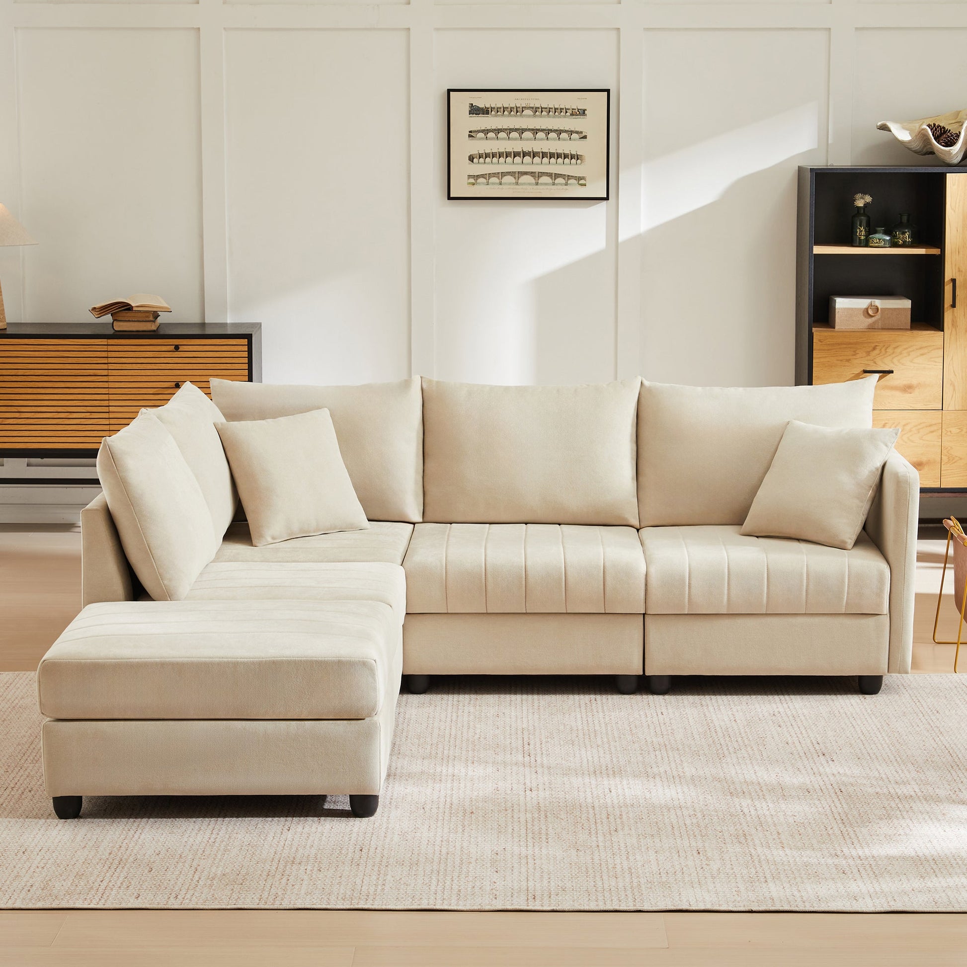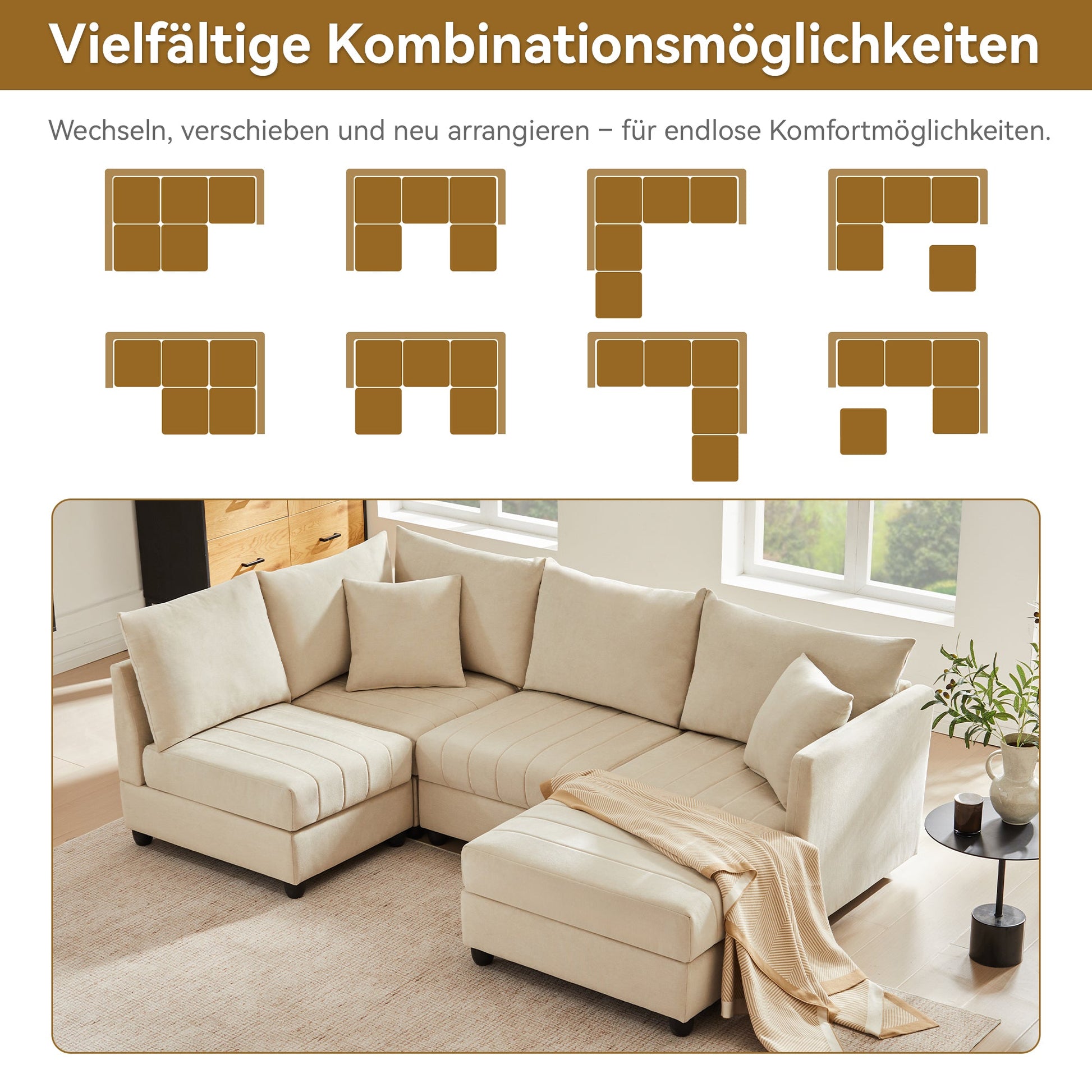 This spacious, multi-seat modular sofa is designed for enhanced comfort and support. It features independent pocket springs beneath a breathable cotton and linen fabric, along with high-resilience foam filling. The flexible design includes a removable footstool, allowing the sofa to be configured as either a U-shaped or L-shaped arrangement. Both comfortable and stylish, this sofa complements a variety of spaces and occasions.