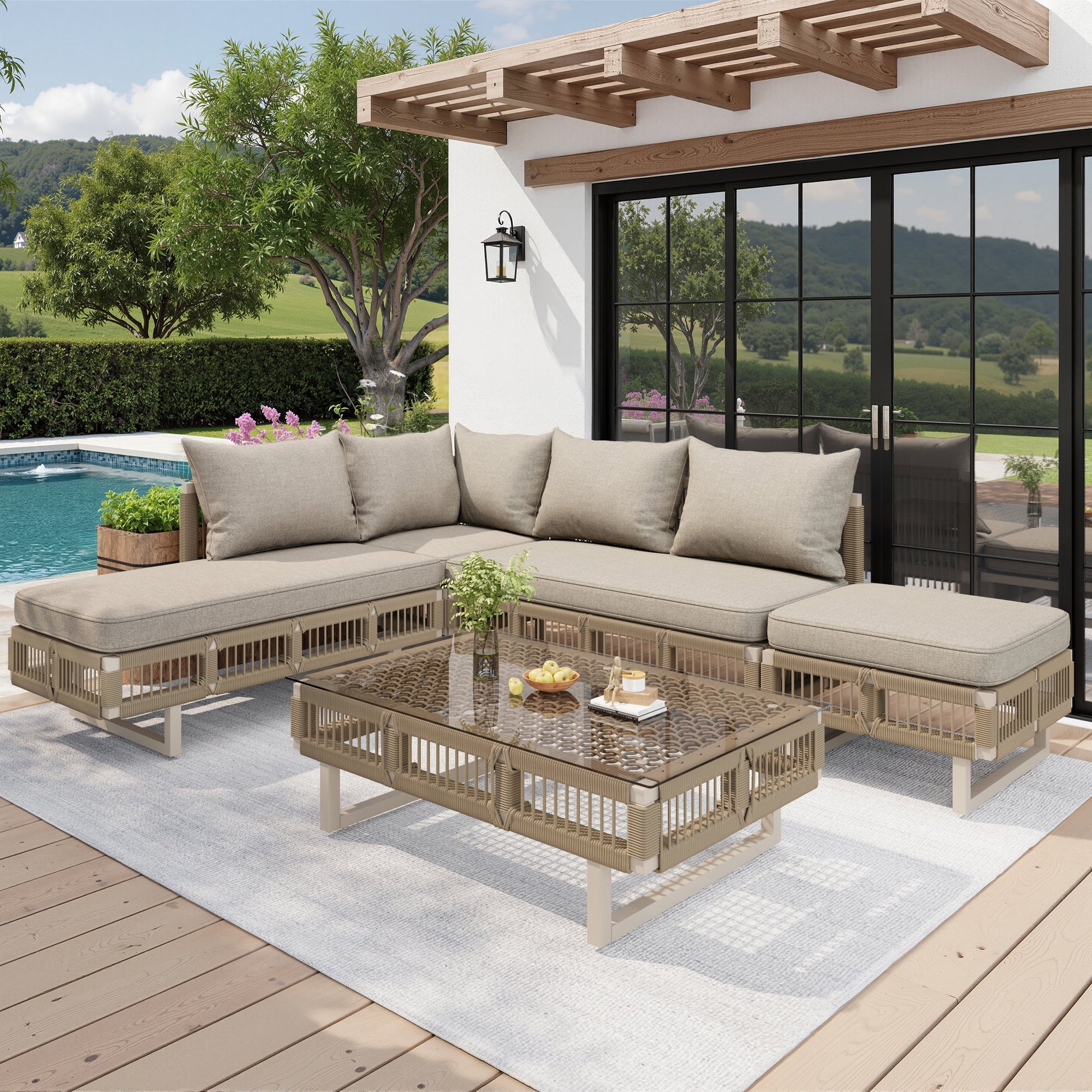 Modular Garden Furniture Set with 10cm Thick Cushions and Glass Coffee Table, Rope Weave, Beige/Green