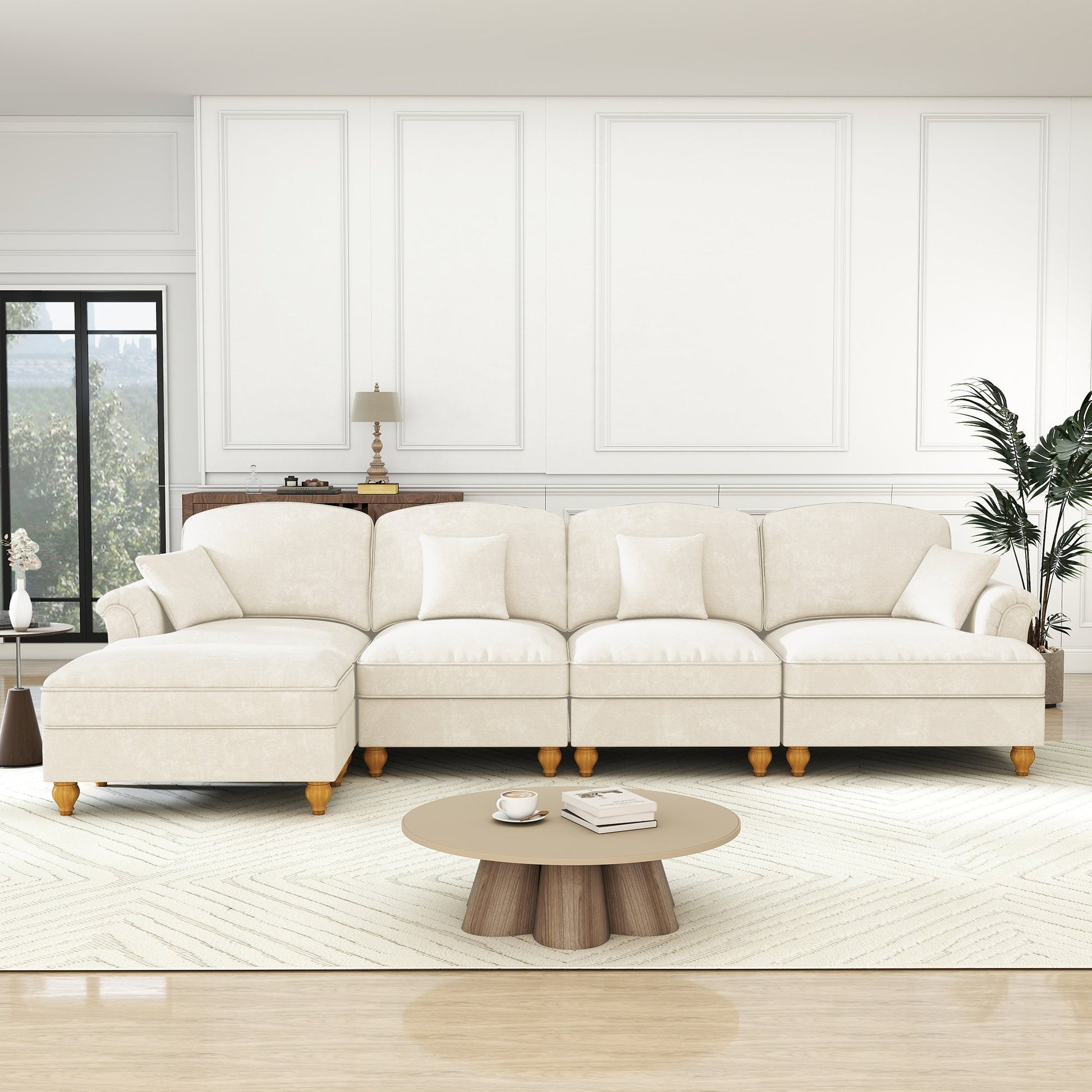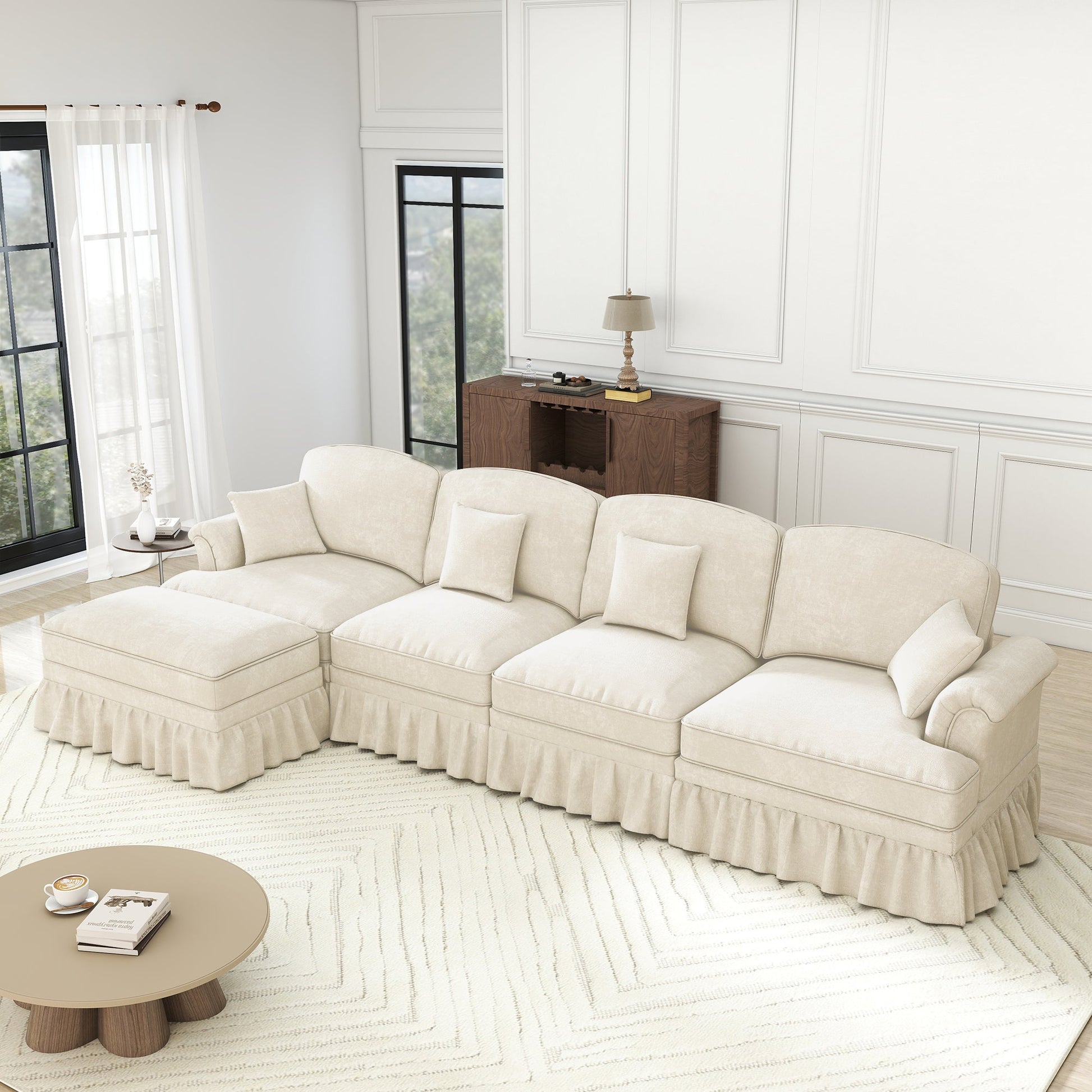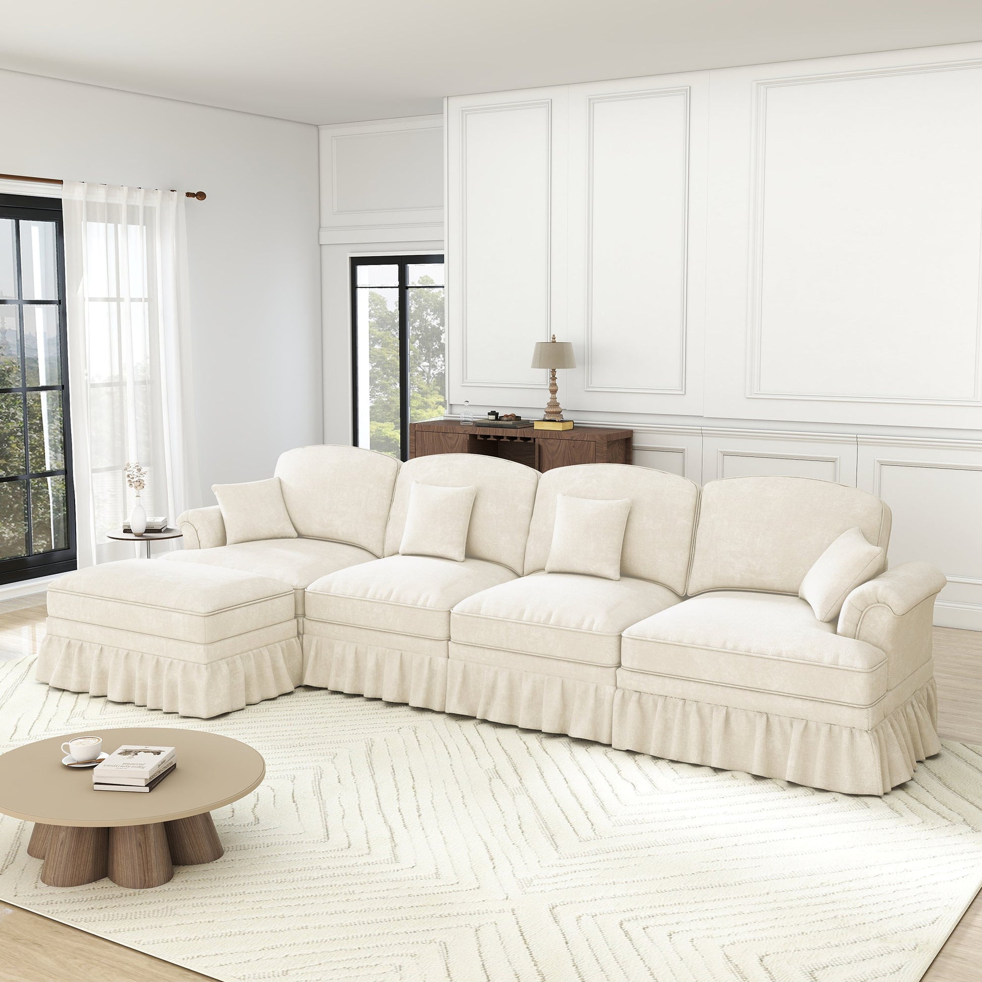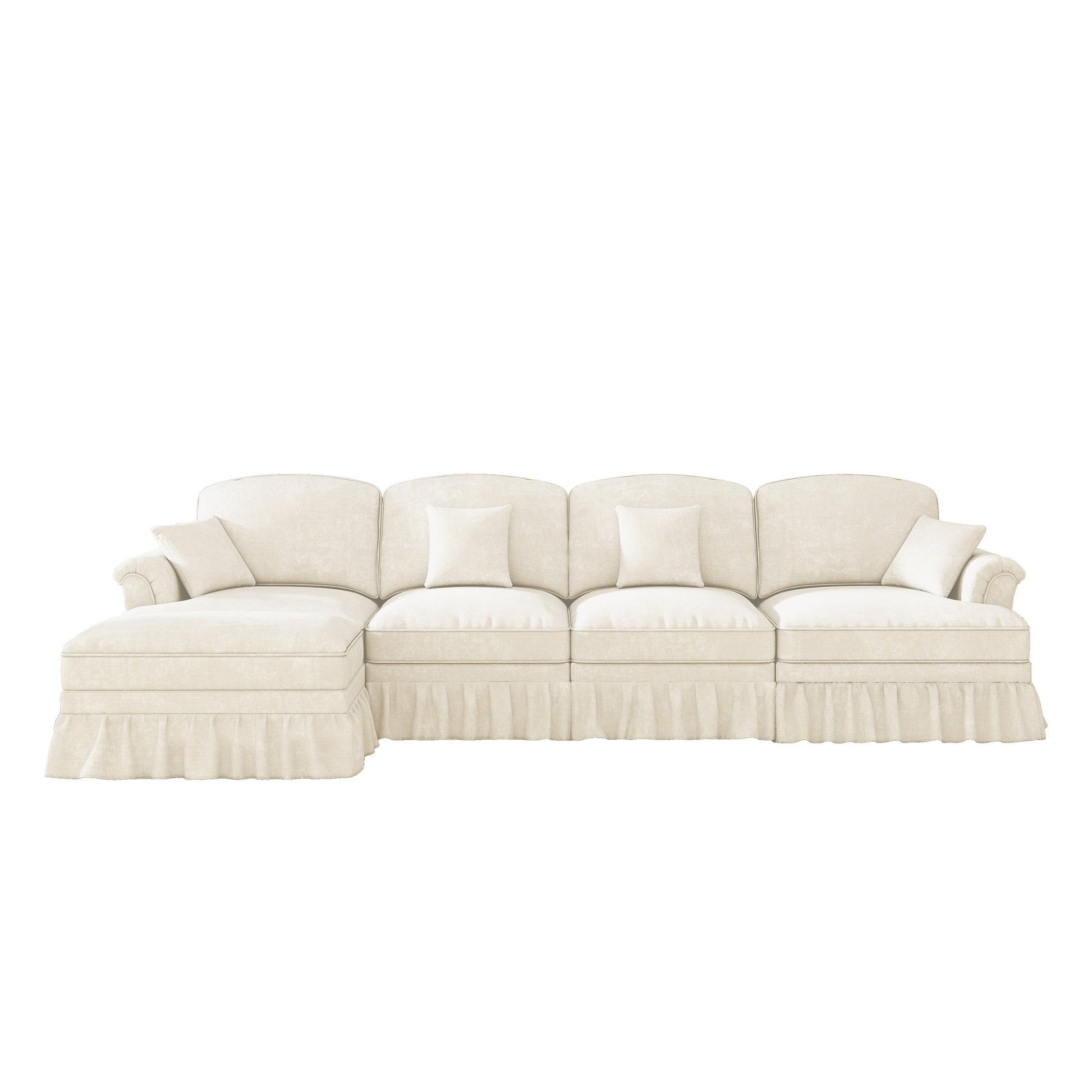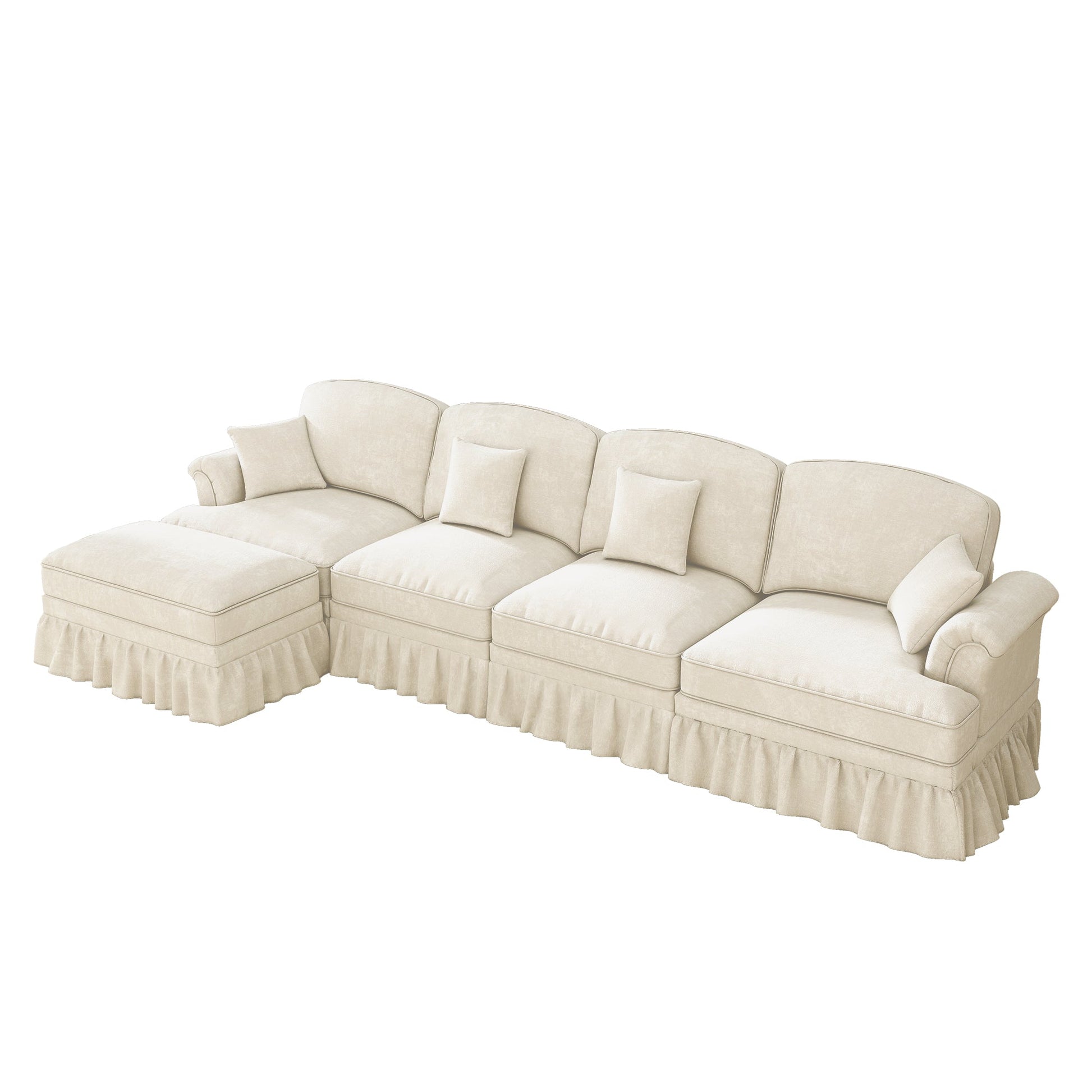 Modular L-Shaped 4-Seater Sofa with Movable Ottoman, Ruffled Apron, Spindle Legs Chenille White