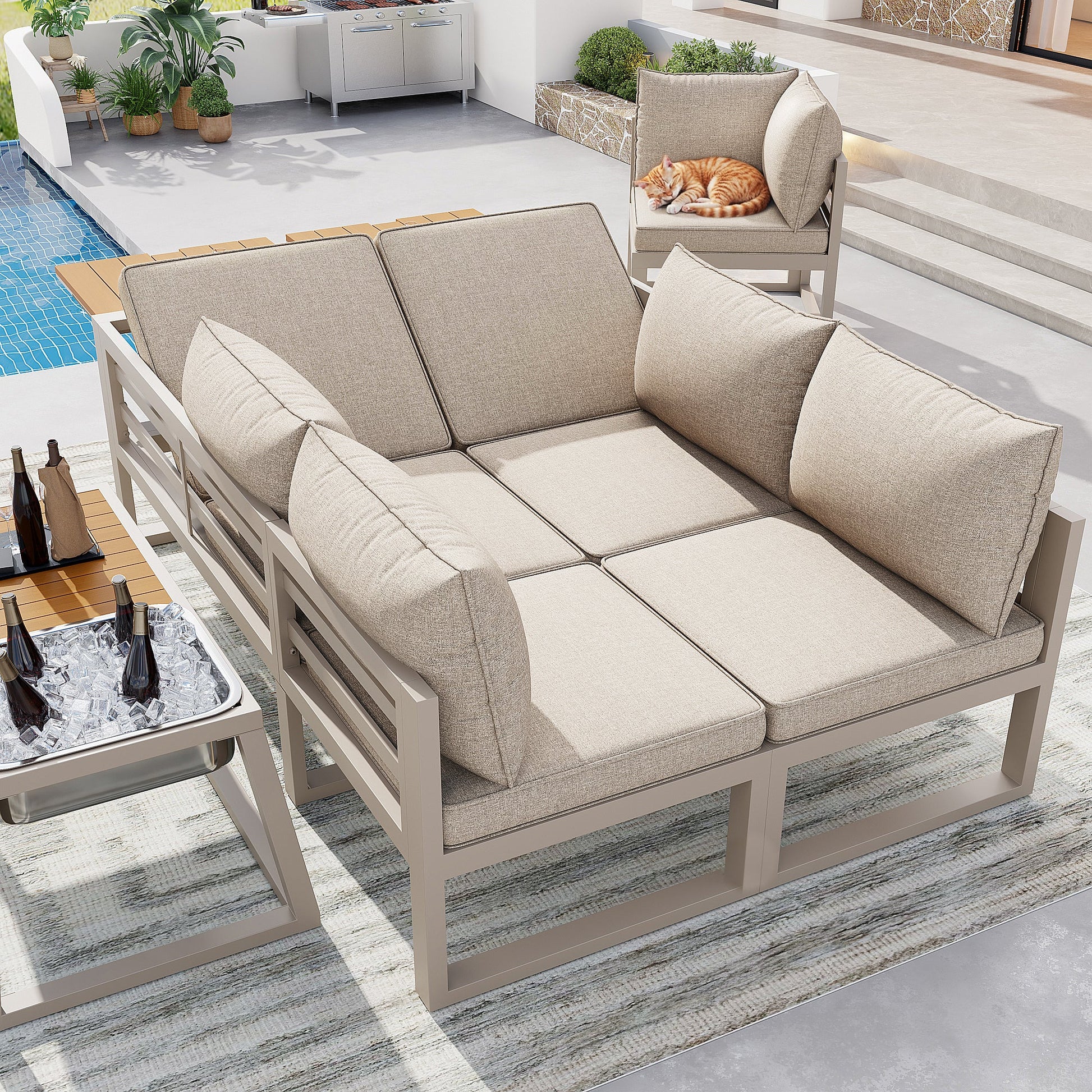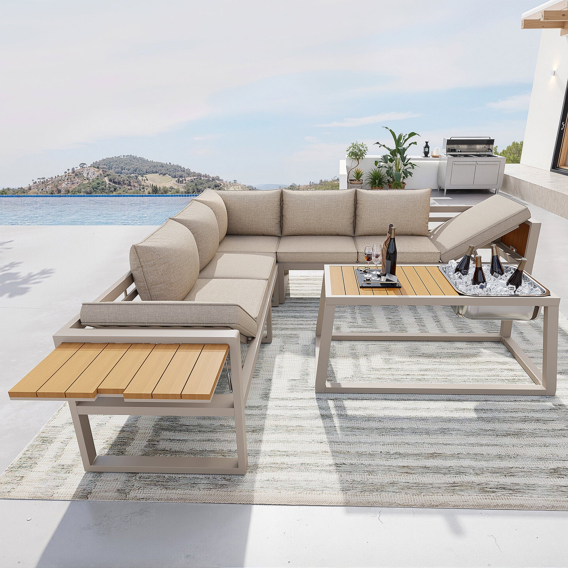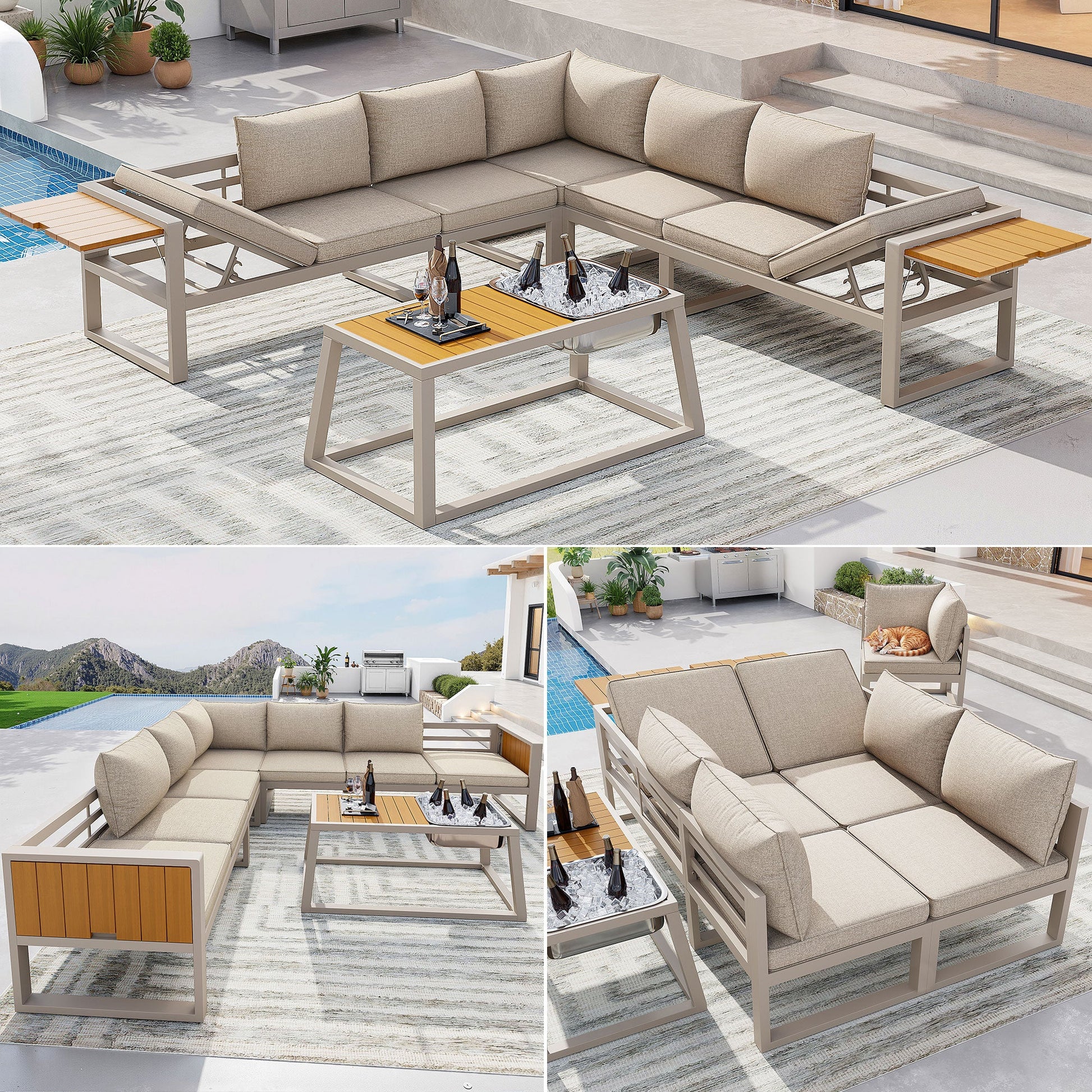 Modular Outdoor Sofa Set with Adjustable Backrest, Fold-out Armrests and Metal Ice Bucket, Grey/Beige